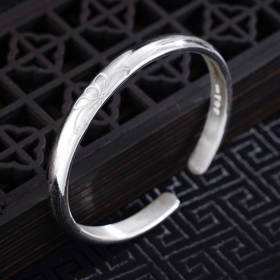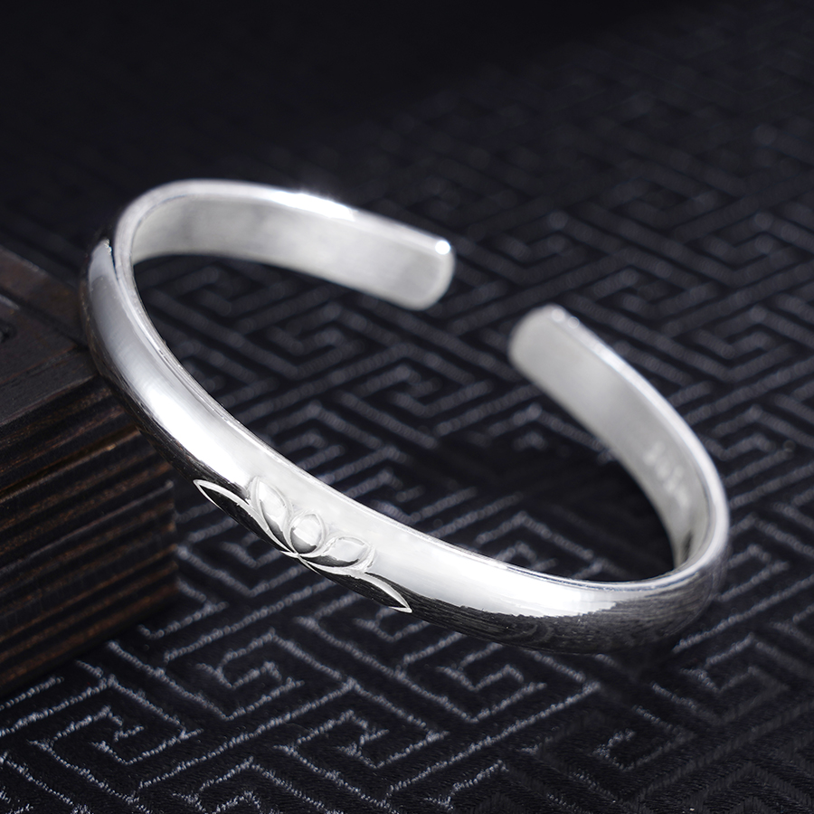 【寓意】:纯银开口手镯,镯面錾刻简约莲花图案,象征初绽清辉,寓意美好初启,希望萌生。
