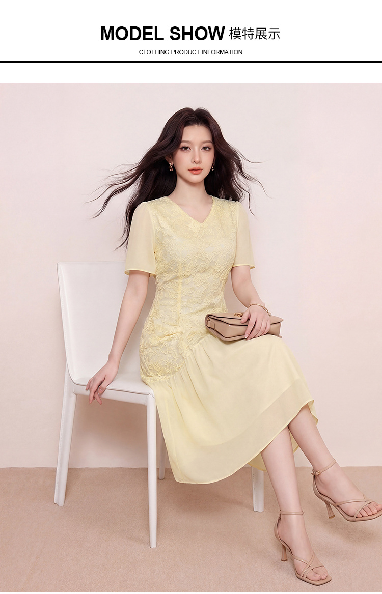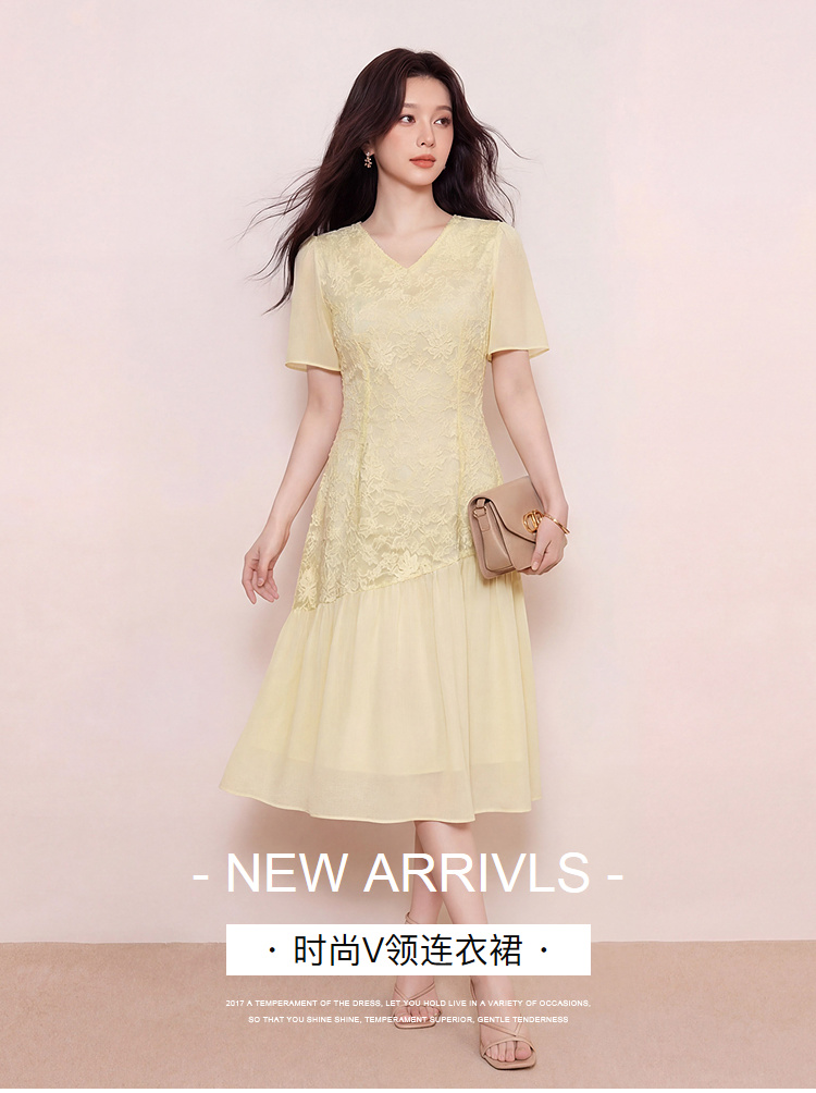 奢姿大码女装2026新款夏款黄色蕾丝花朵镂空气质时尚V领连衣裙9962872086