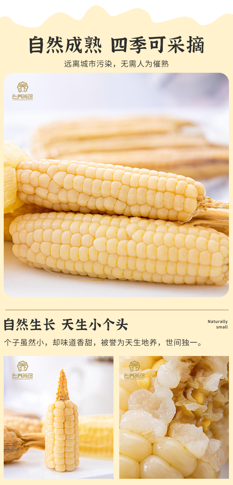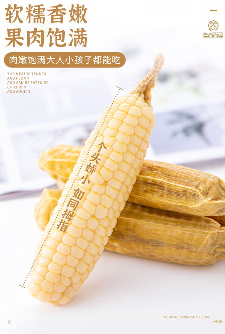 版纳小玉米,未经基因改良,个头很小。未对玉米做过多的人为干预,小玉米兄弟姐妹之间个头不一,重量也有所不同,但小玉米的口感都是软糯香甜,粒粒饱满。
