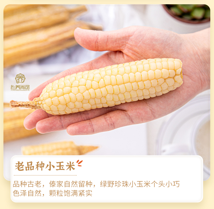 古老品种绿野珍珠小玉米,被当地人誉为是地球上最小的玉米,穗长多为6~12cm,直径1.8~2.5cm,籽粒多为8排,长得小巧可爱。软糯香是其主要的特色,甜度属于微甜,有别于拌沙拉的甜脆水果玉米。版纳绿野珍珠小玉米基因决定个头不大,只有手大拇指大小 。碰上吃货,瞬间解决7- 8个不在话下。