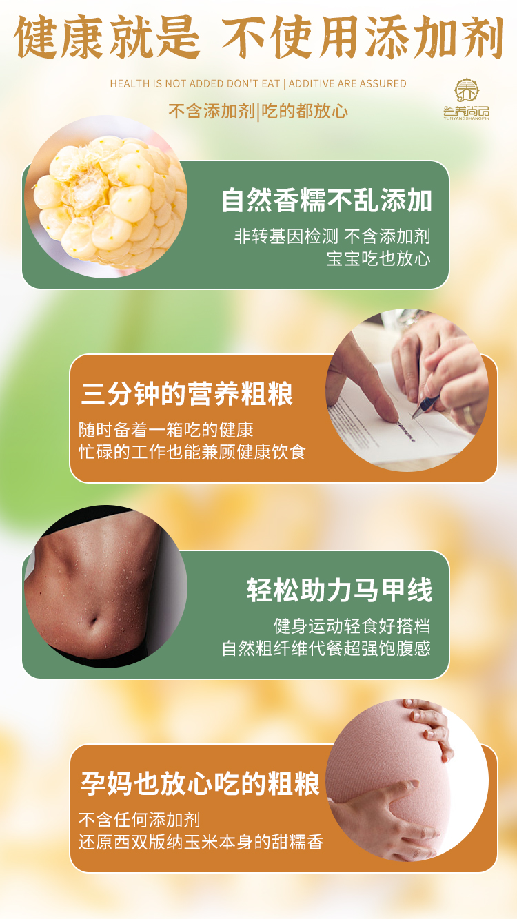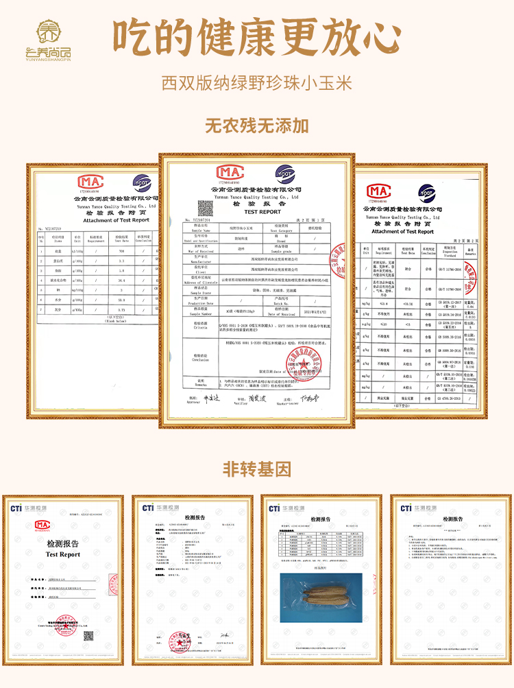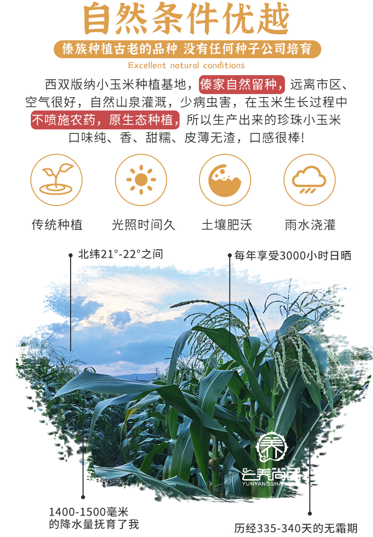 热带雨林,四季常青,所以清香;昼夜温差大,积累养分,所以甜糯;远离城市,空气清新,所以好吃;傣族老品种,自然耕种,所以营养,我们只做不使用添加剂,不使用甜蜜素化学成分等,没有农药化肥的非转基因玉米。