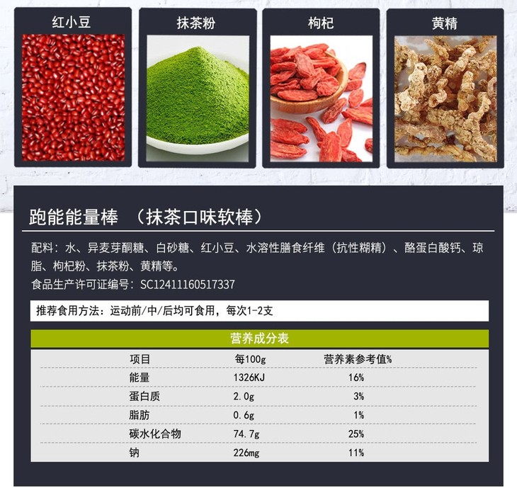 马拉松早餐专用,跑能软质能量棒40克/红豆黄精枸杞抹茶(柔软+可口+高能+饱腹)(保质期26年8月)
