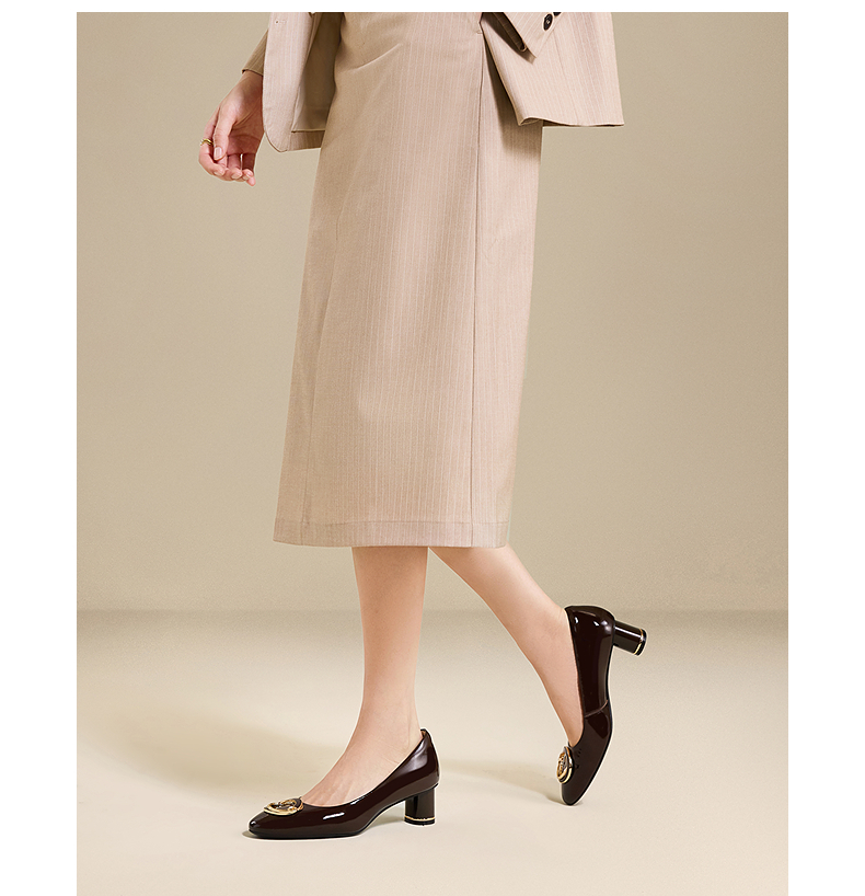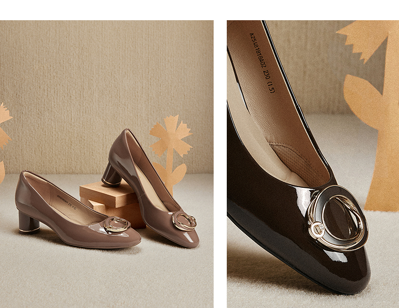 【静音系列】千百度粗牛漆皮高跟鞋女圆头浅口单鞋A25481818