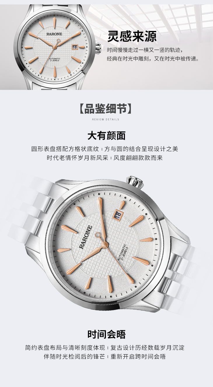 RARONE雷诺表始终秉持创新设计与精品战略。旨在帮助人们精确感悟时间,以一种无畏、坚韧的精英态度,激励每个人在探索世界的过程中,御时而行。