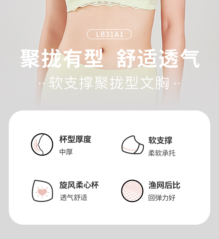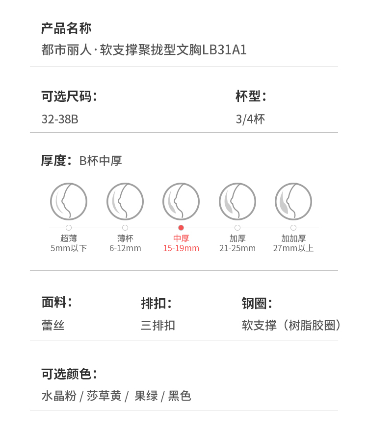 都市丽人内衣自然舒适常规文胸蕾丝A:加厚B:中厚C:薄文胸3/4杯三排扣无钢圈LBT1M1