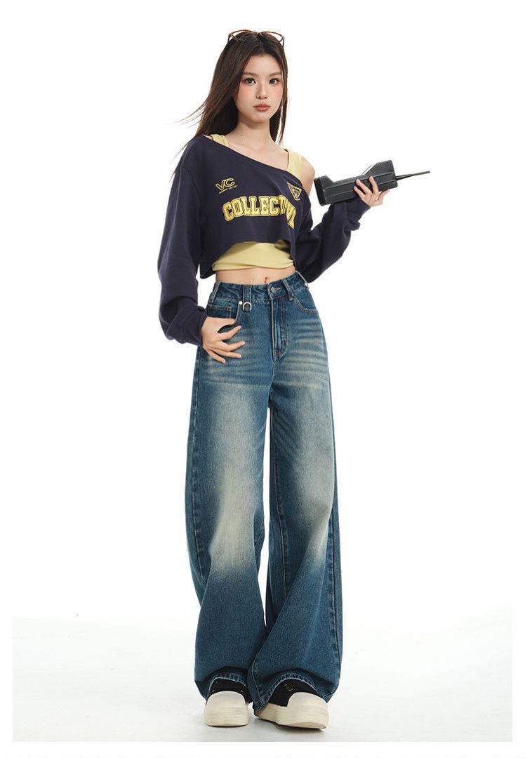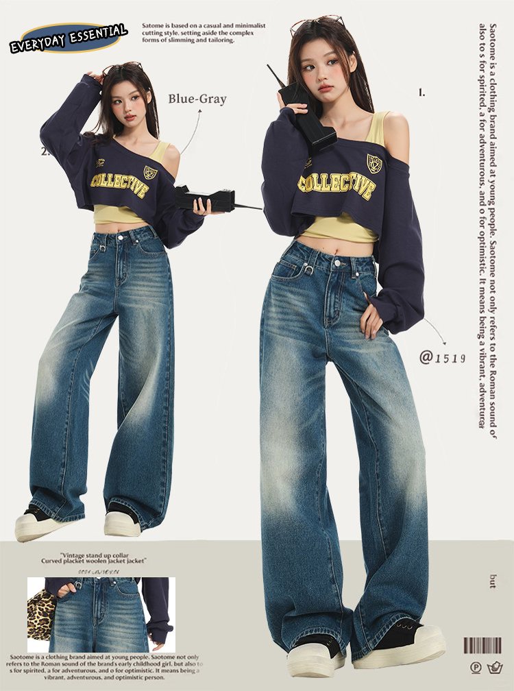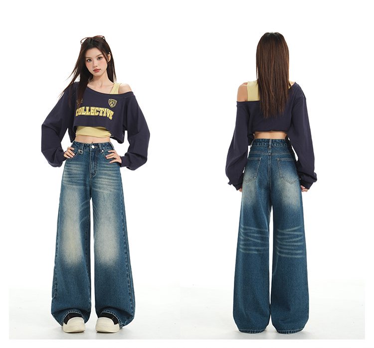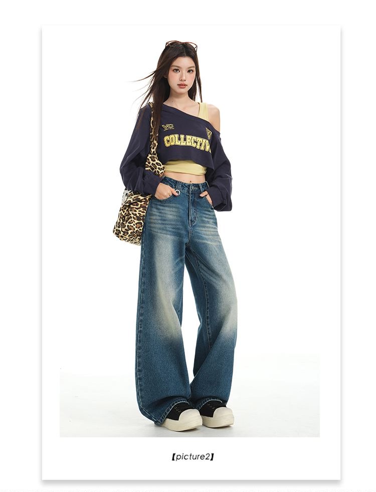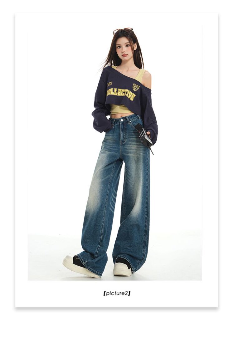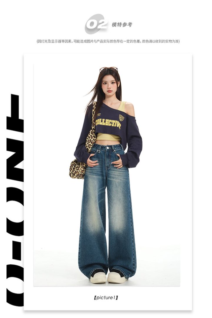 罗蒙女士牛仔裤怀旧色阔腿裤复古宽松垂感直筒裤显瘦慵懒感百搭拖地裤