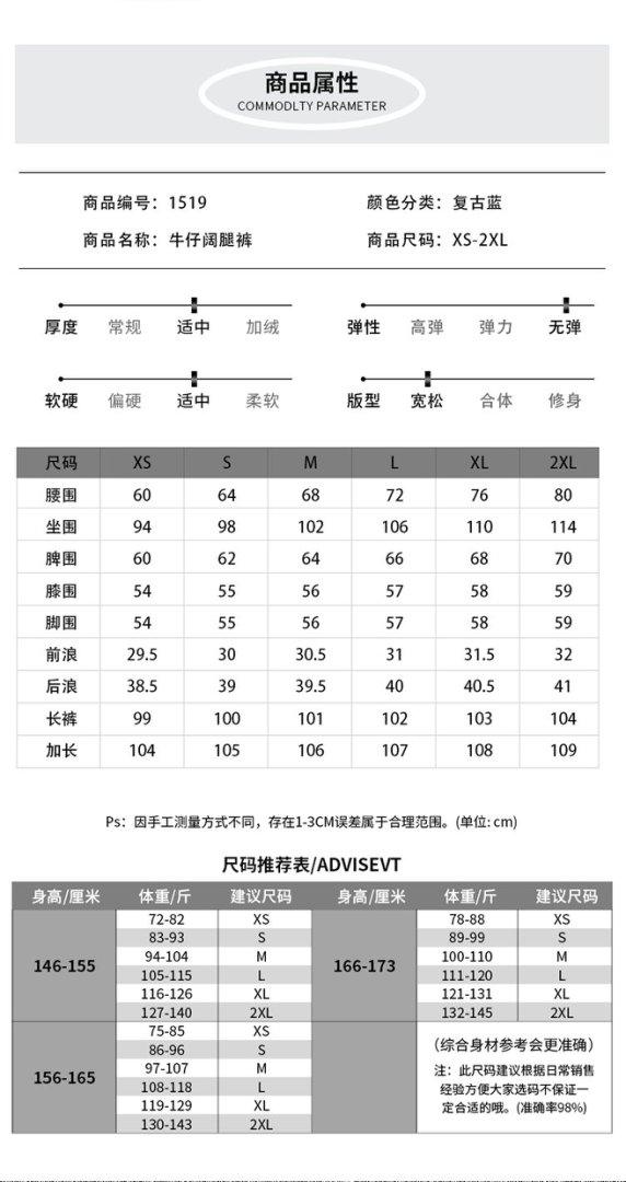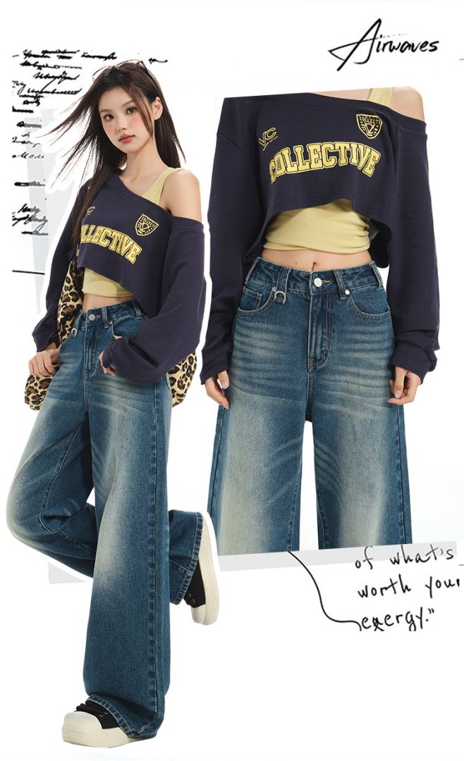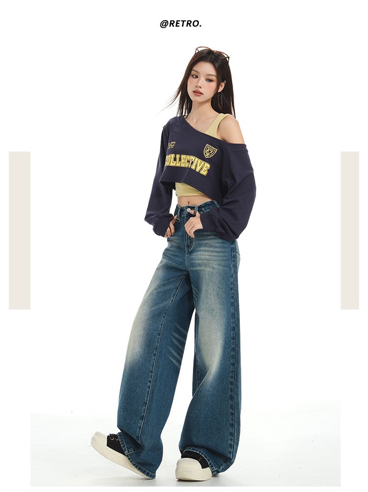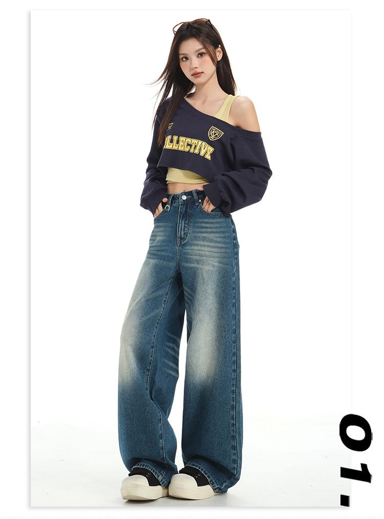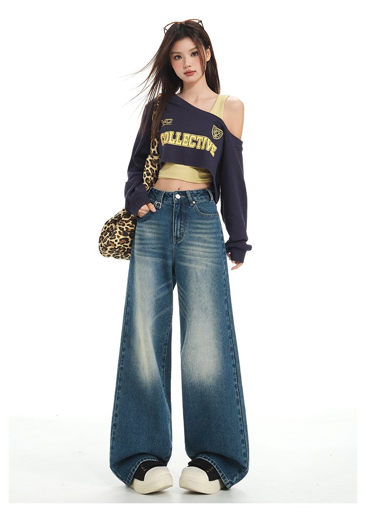 罗蒙女士牛仔裤怀旧色阔腿裤复古宽松垂感直筒裤显瘦慵懒感百搭拖地裤