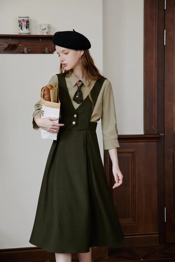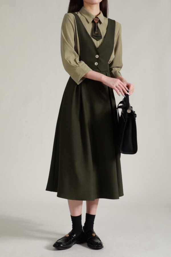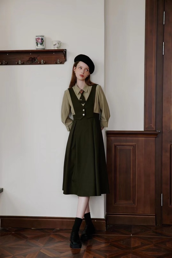 Stay2Weeks 军绿色学院风背带连衣裙 18750