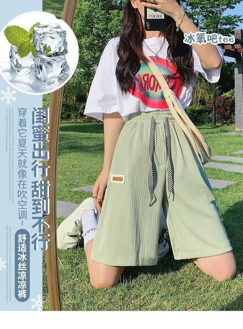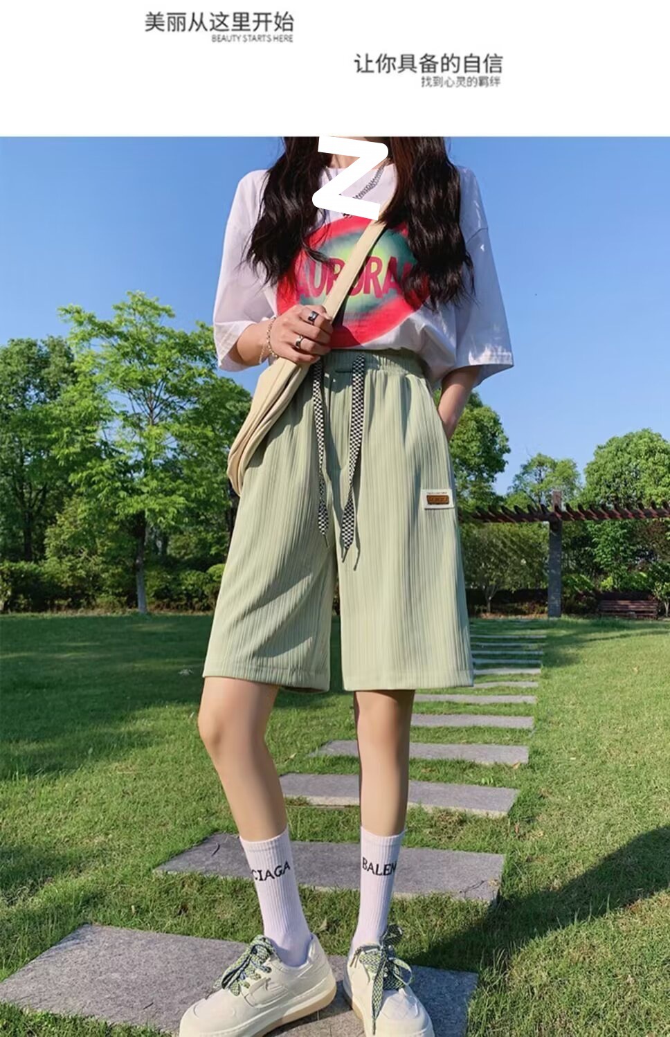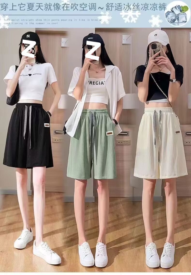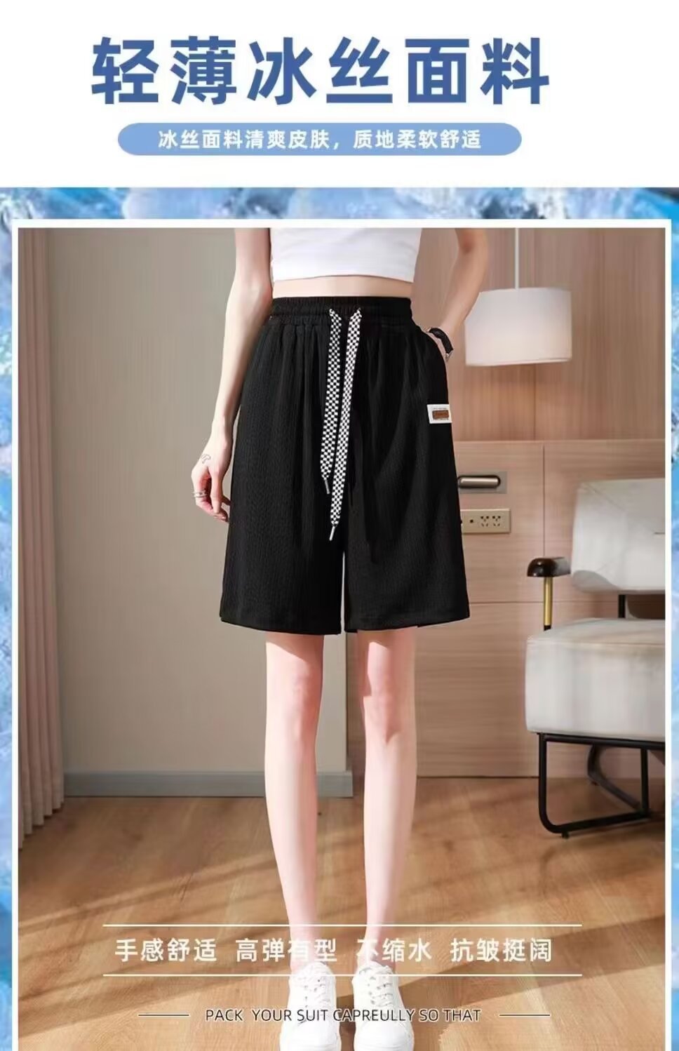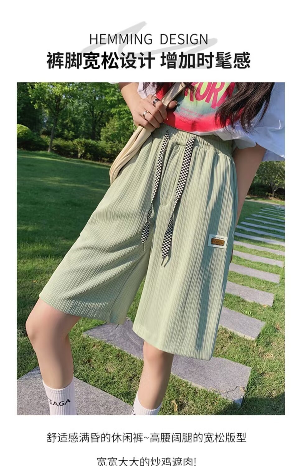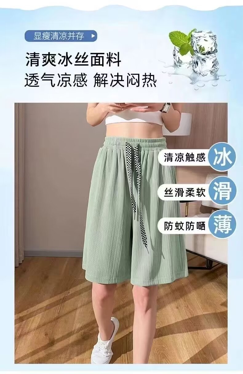 【穿出个性感!会吃肉的冰丝短裤!】显高显瘦舒适松紧腰围,透气亲肤舒适,版型宽松肌理清晰,穿起来舒适自如,斜口袋方便凹造型,长度的设计刚好,女夏季薄款新款阔腿运动短裤潮