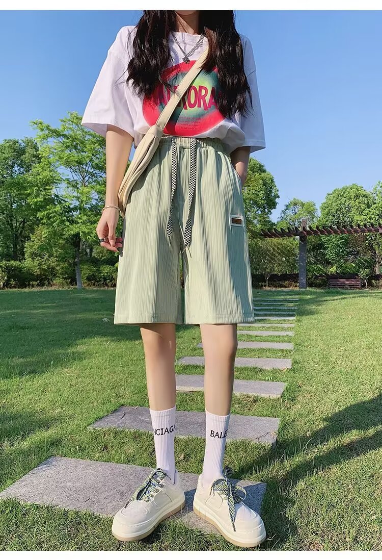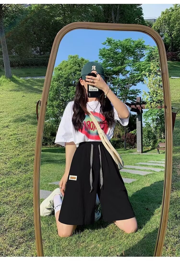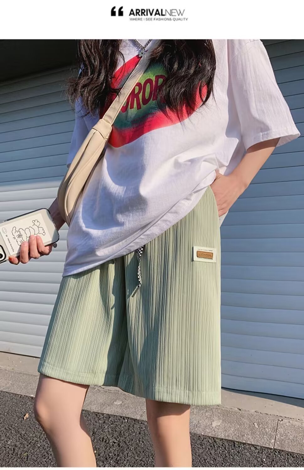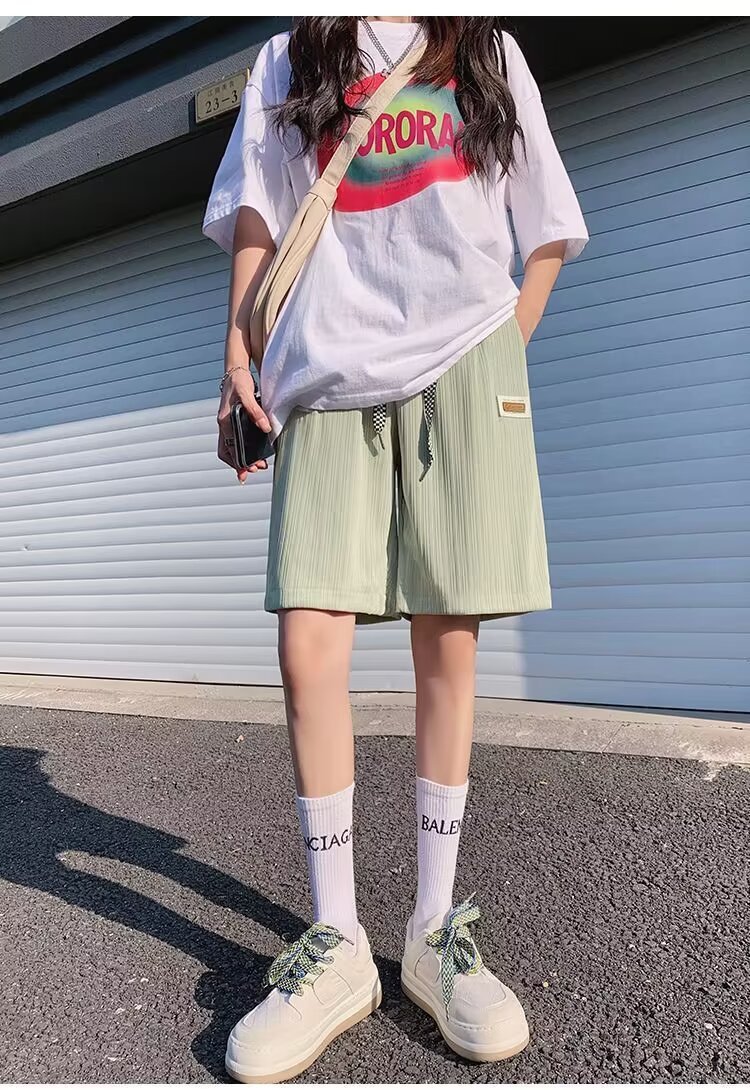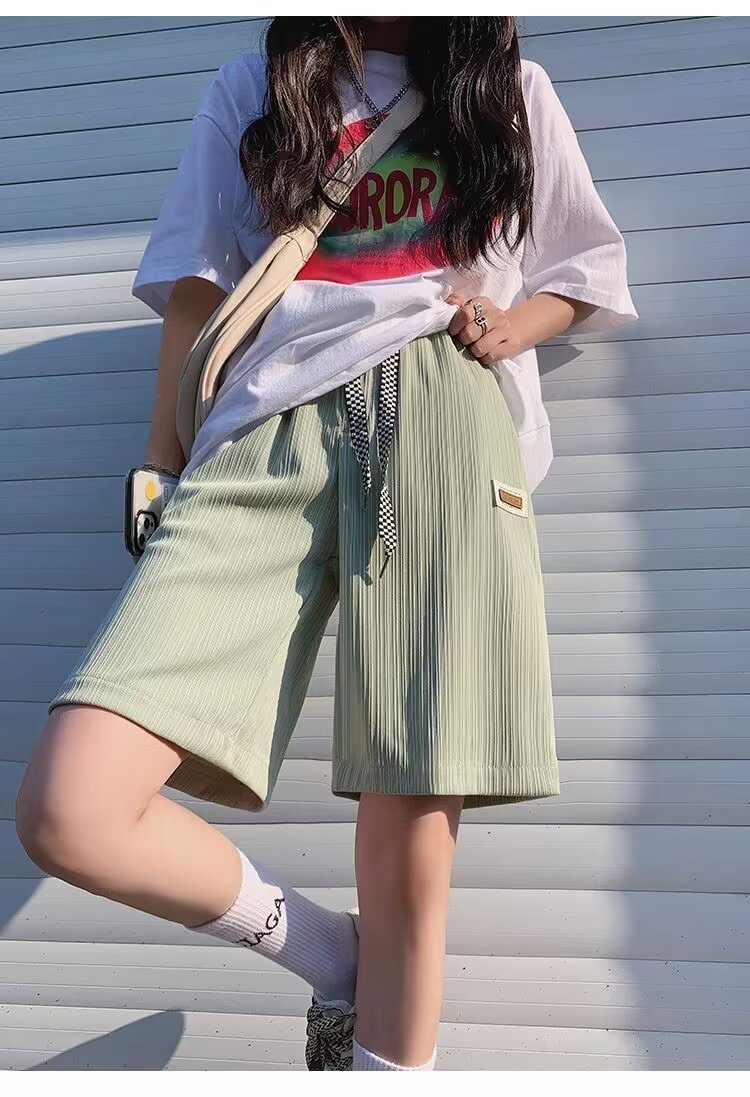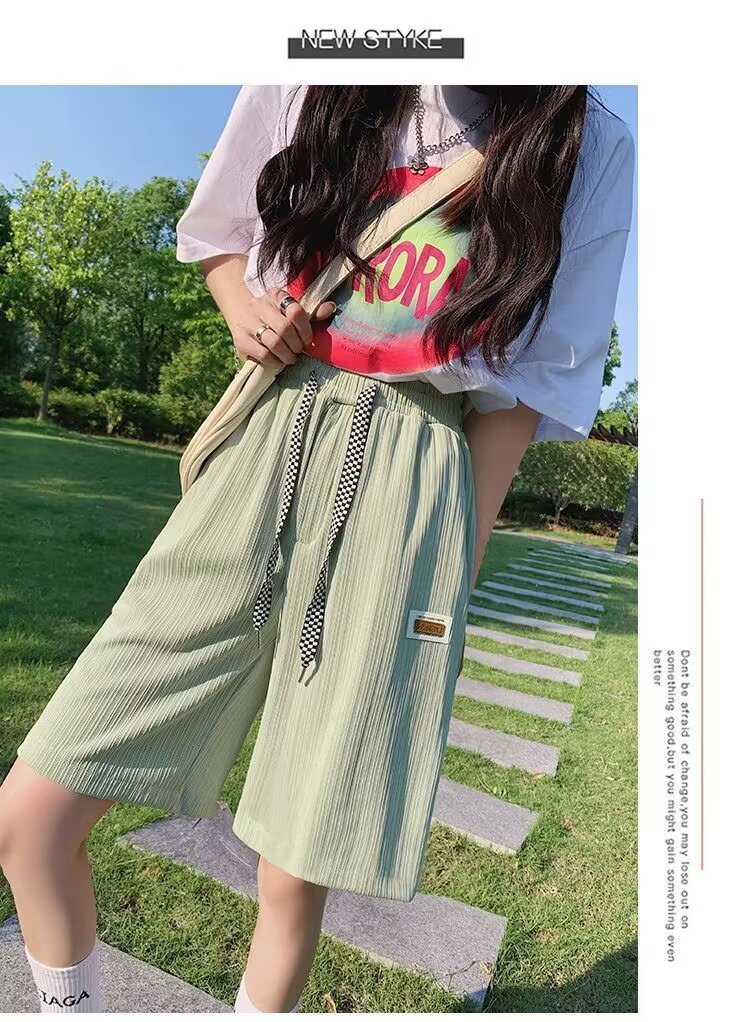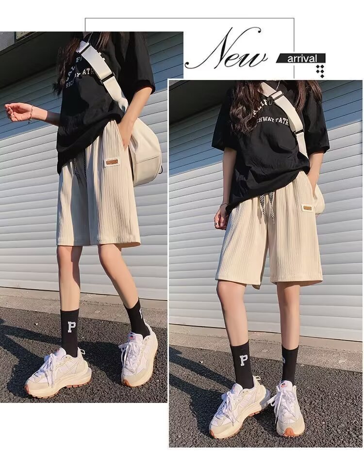 【穿出个性感!会吃肉的冰丝短裤!】显高显瘦舒适松紧腰围,透气亲肤舒适,版型宽松肌理清晰,穿起来舒适自如,斜口袋方便凹造型,长度的设计刚好,女夏季薄款新款阔腿运动短裤潮