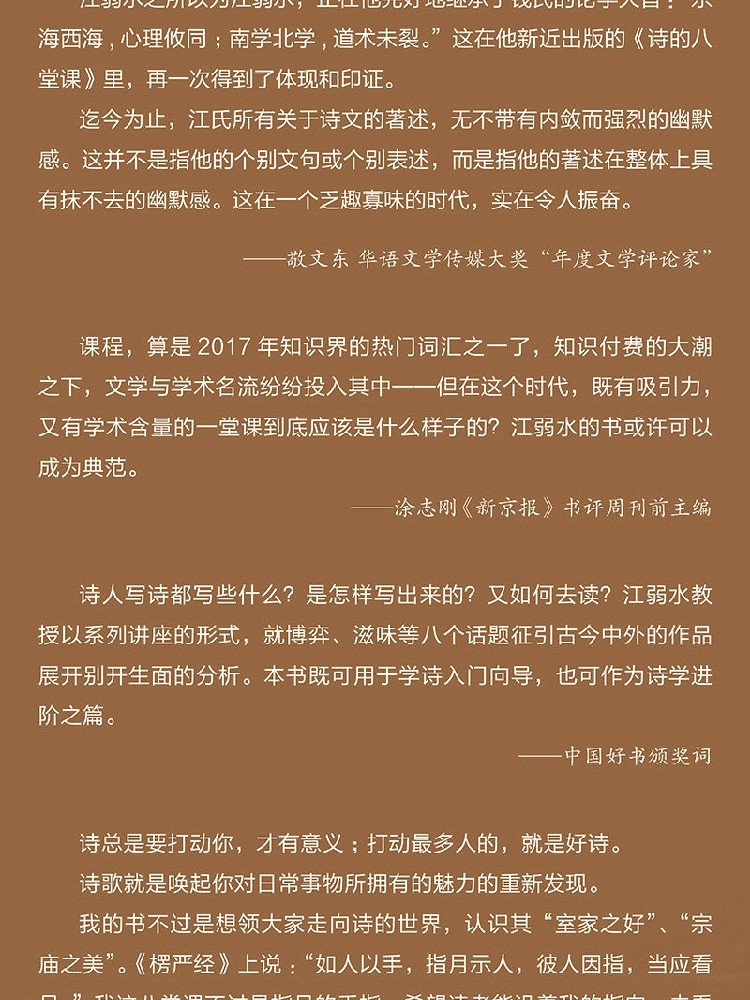 内容简介:诗人写诗都写些什么?是怎样写出来?又如何去读?本书以系列讲座的形式,征引古今中外的诗作与诗论,就博弈、滋味、声文、肌理、玄思、情色、乡愁、死亡等话题,来展开有意义也有意思的讨论。每一讲都以独具魅力的作品,用别开生面的分析,给读者感性与知性的双重满足。既能用于学诗入门,也可作为诗学进阶。