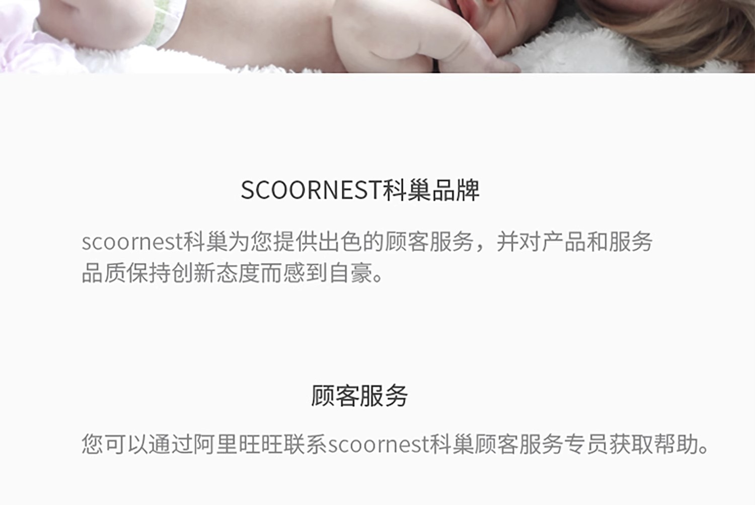 - Scoornest始终秉承给每一位宝宝送去科学的、关心的、创新的成长体验,通过提供商品和服务,使顾客形成守护、发展、巩固这种弥足珍贵的亲情的爱。