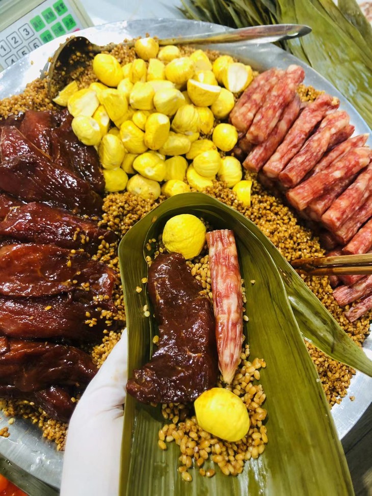 原材料:糯米、板栗、土猪肉、精排、广味香肠、生抽、食用盐、砂糖香辛料