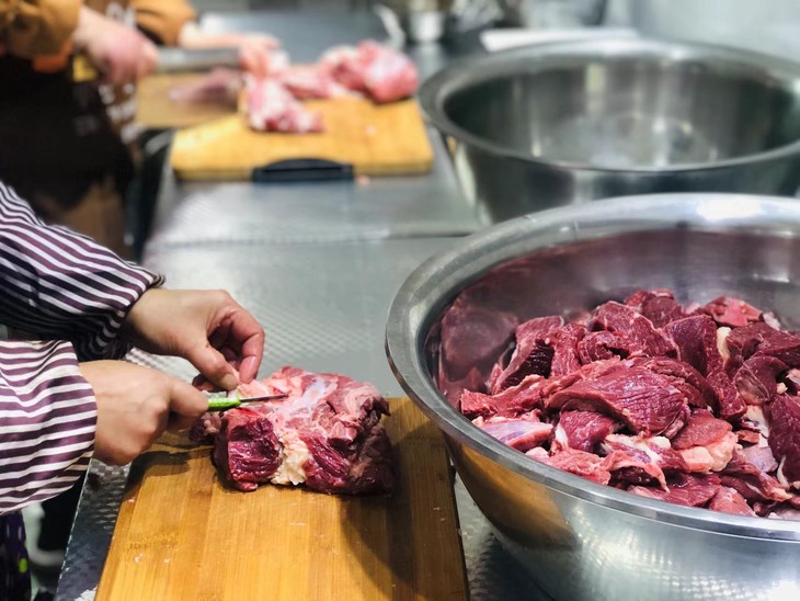 这是新鲜牛肉 阿姨们在去多余的脂肪