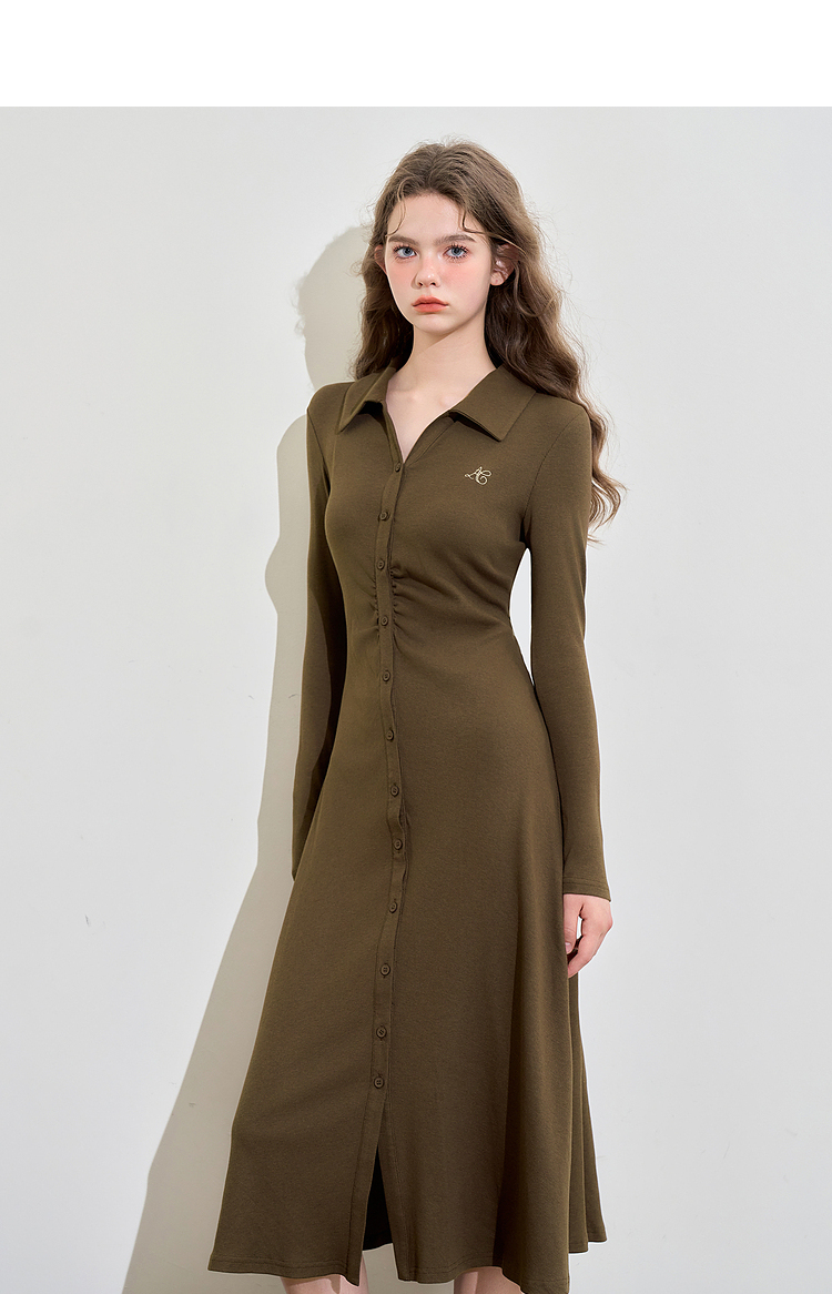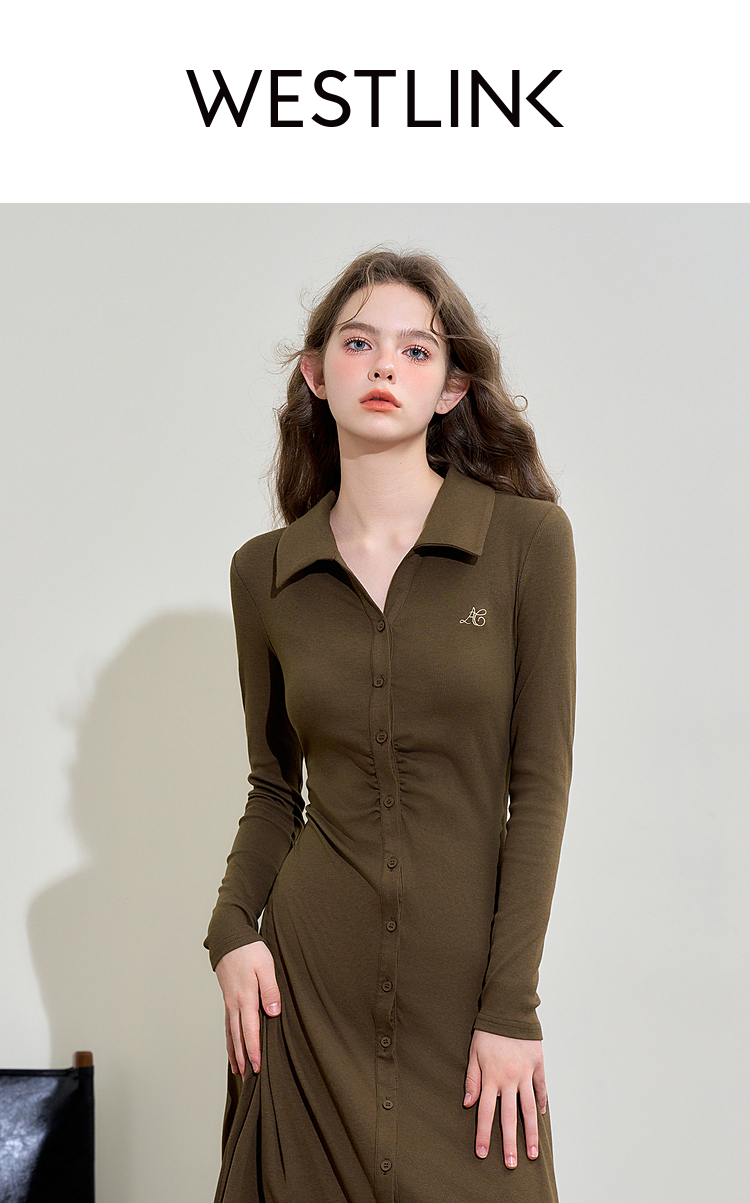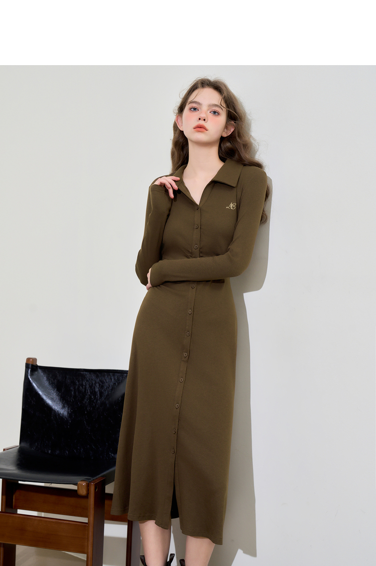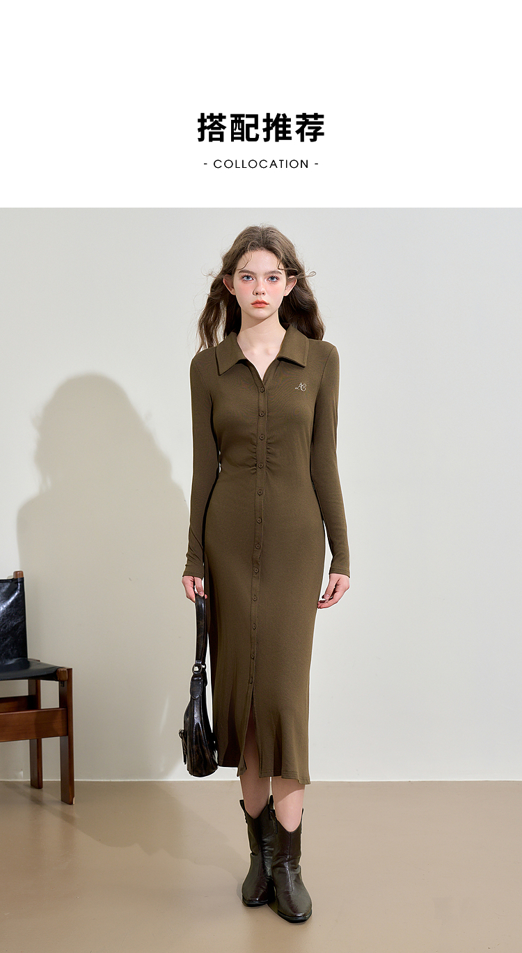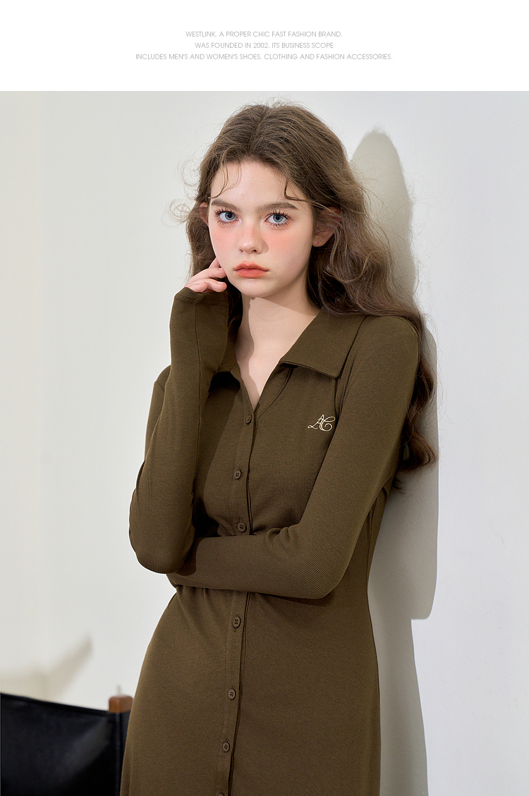 慵懒随性刺绣翻领直筒针织裙女秋季褶皱显瘦长袖连衣裙V3442367