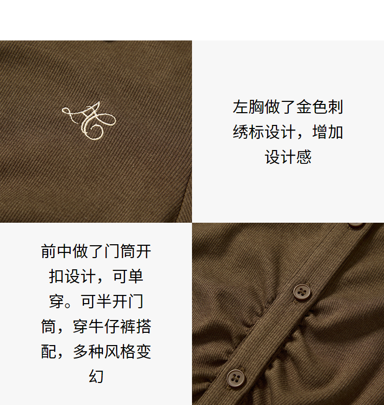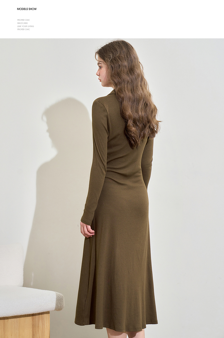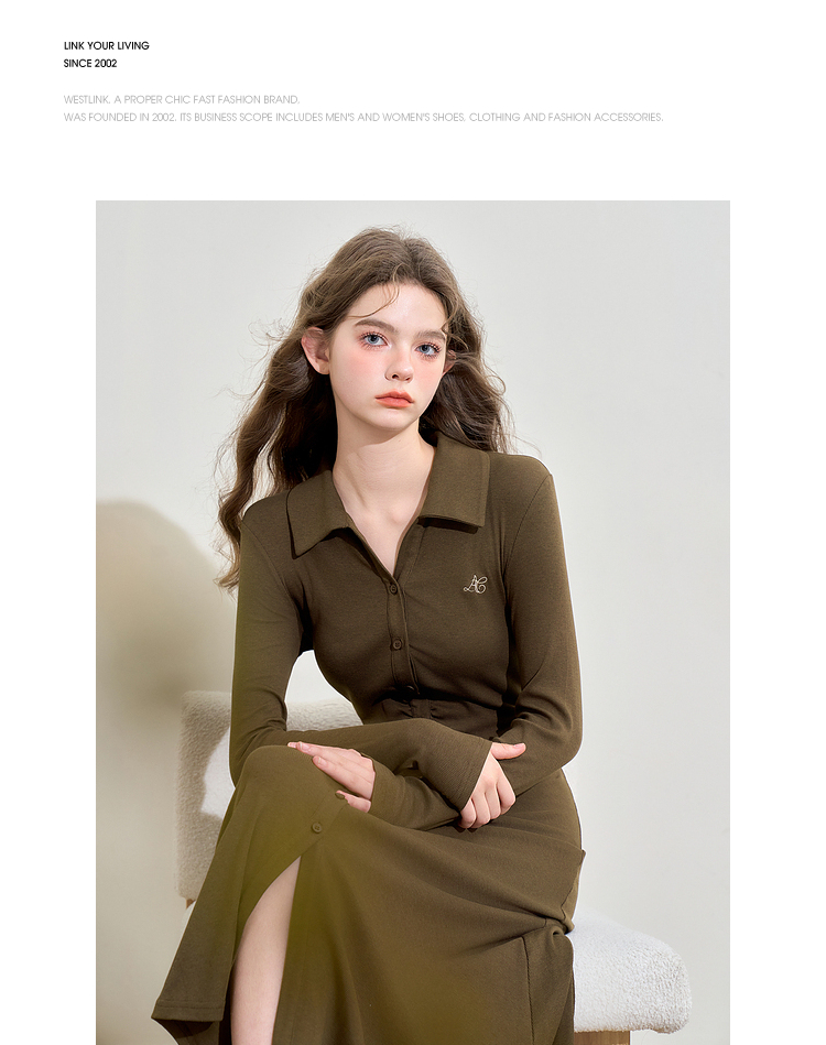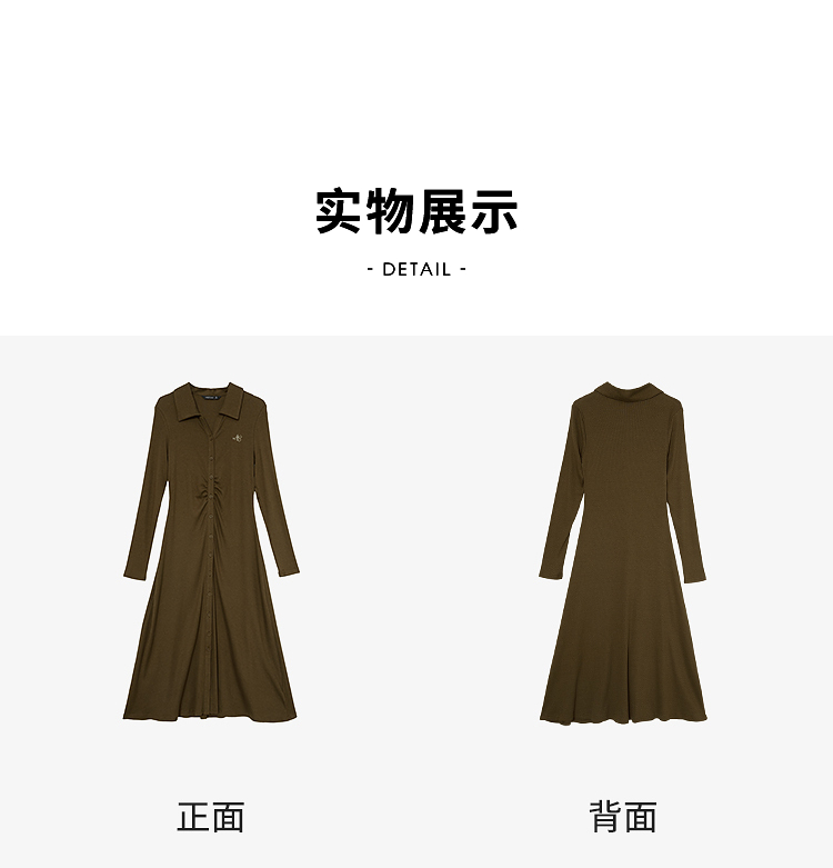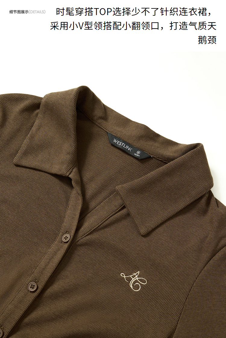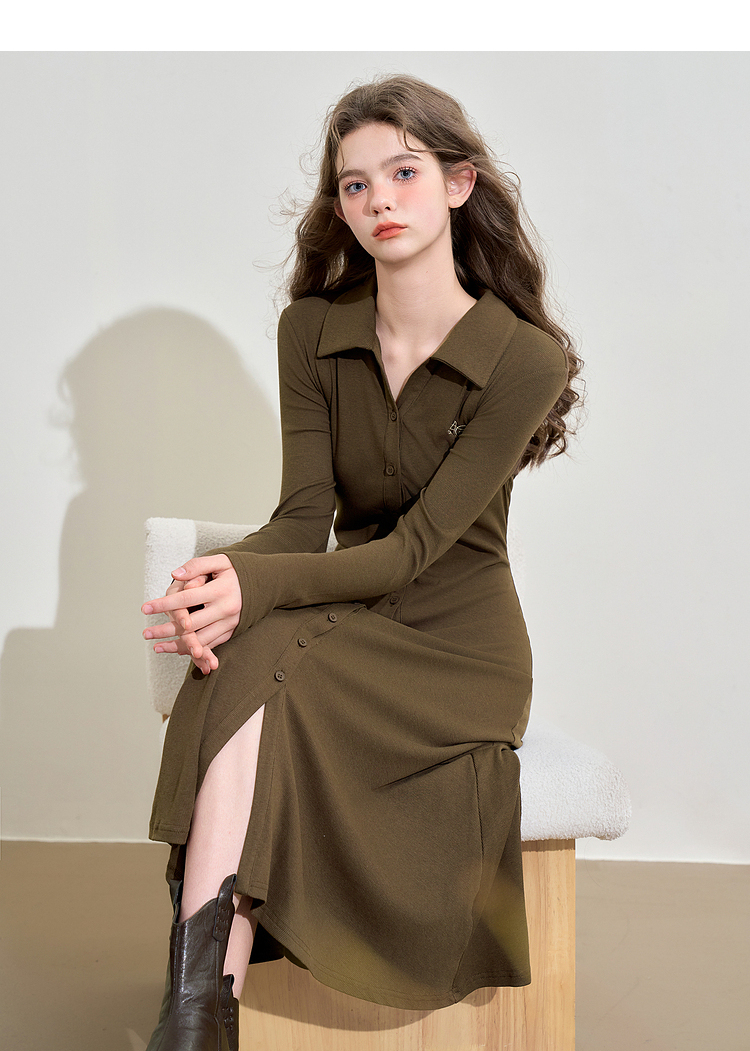 慵懒随性刺绣翻领直筒针织裙女秋季褶皱显瘦长袖连衣裙V3442367