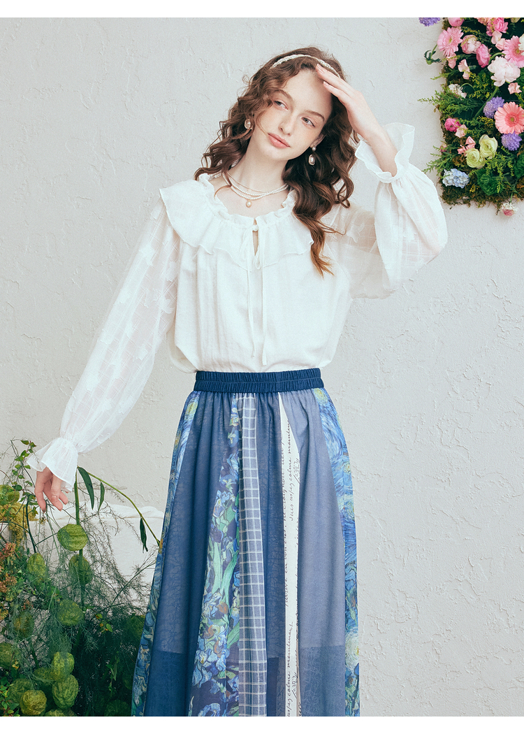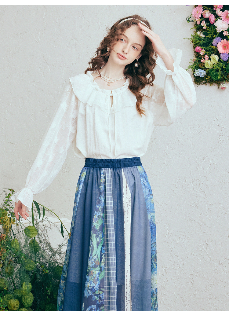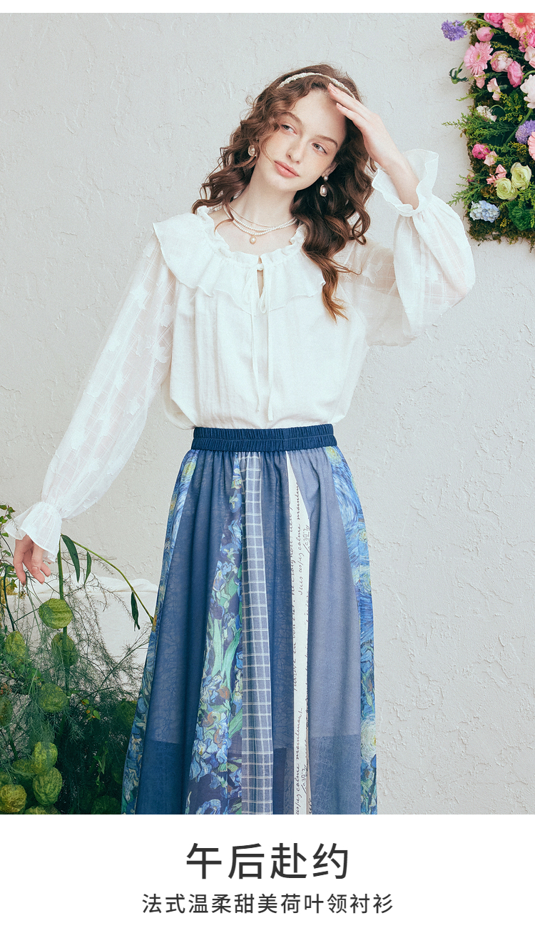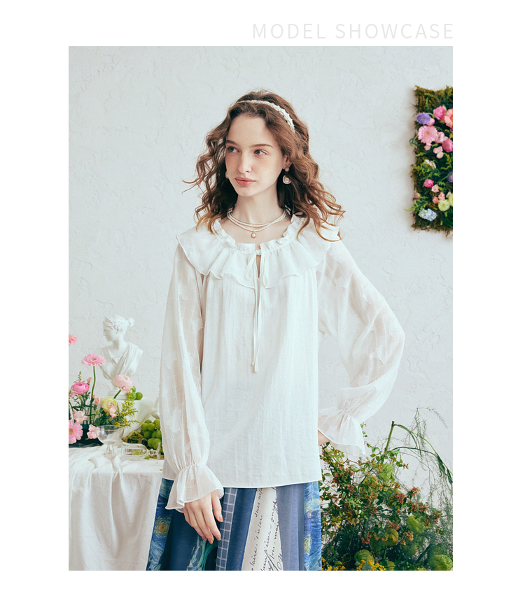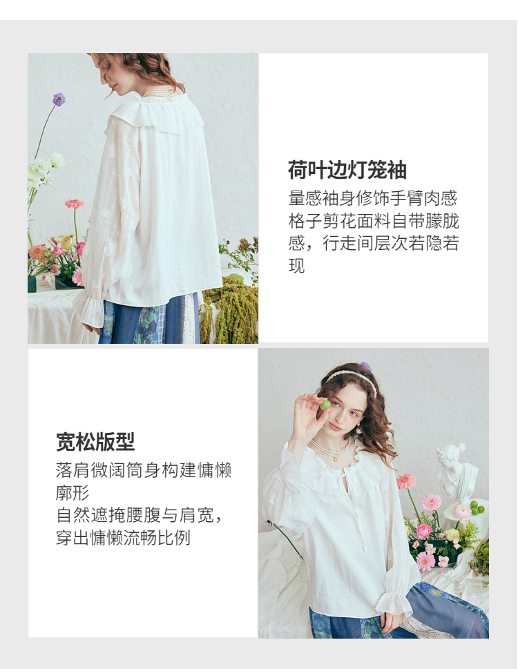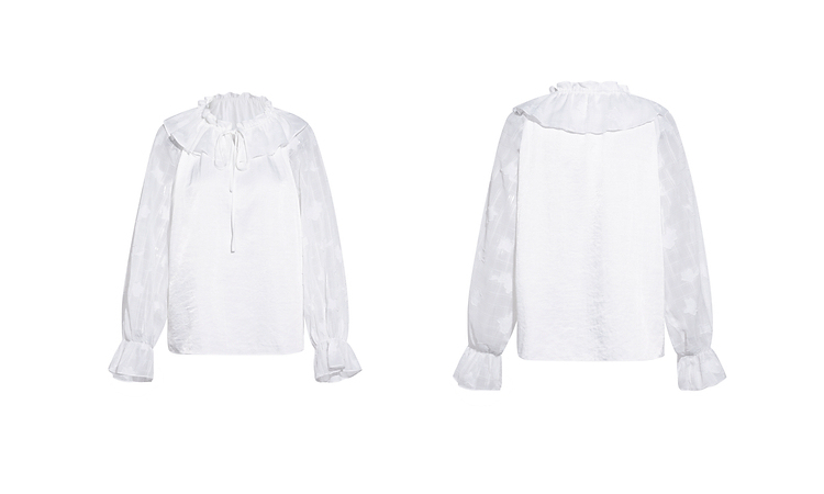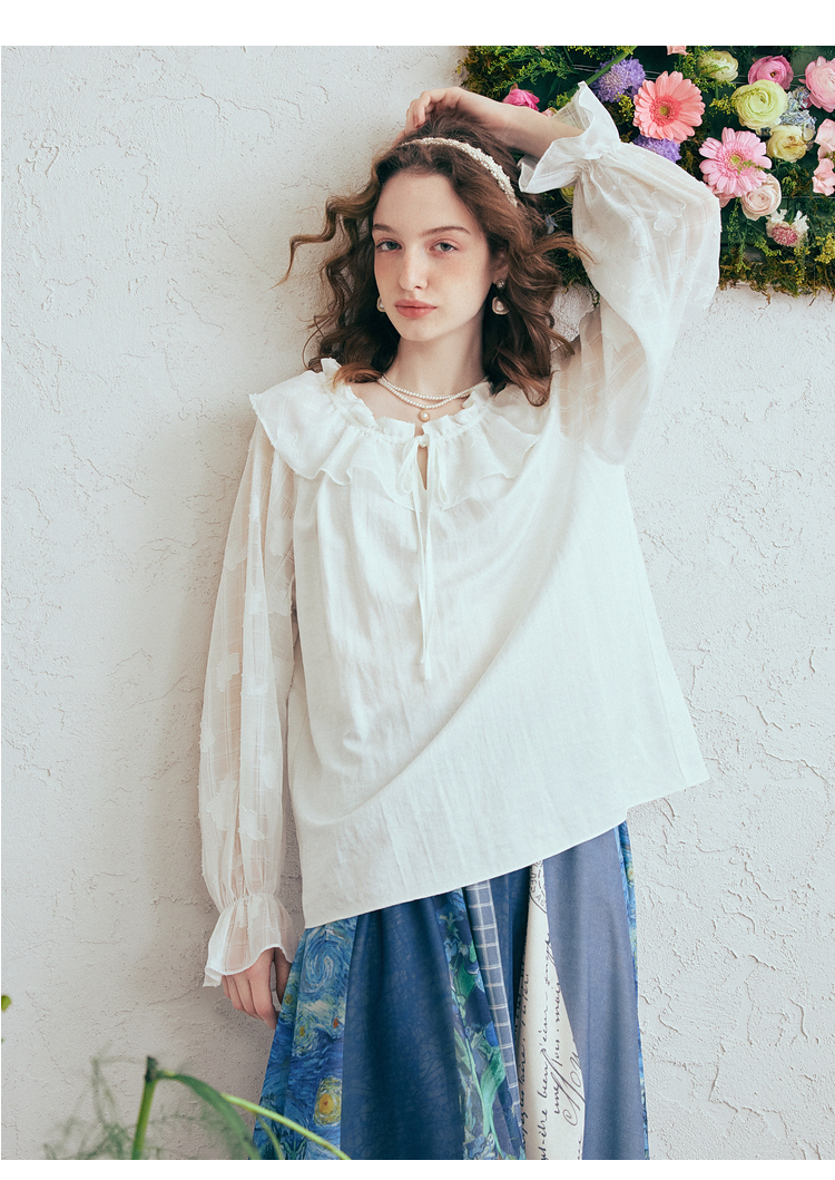 两三事 午后赴约 2026春季新款甜美透视插肩袖荷叶边绑带衬衫女