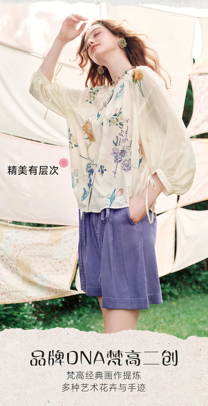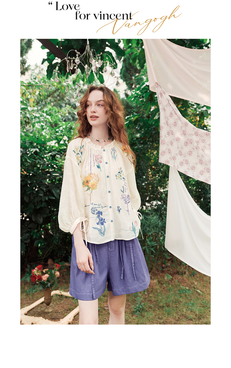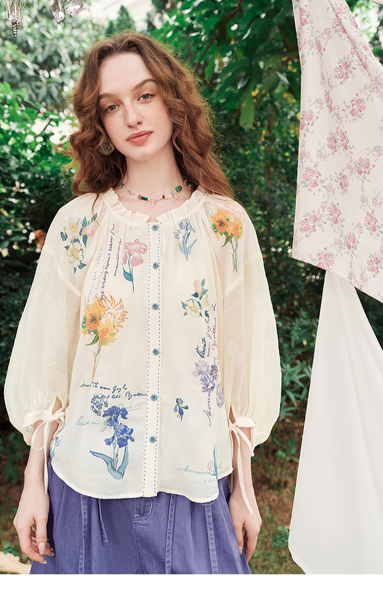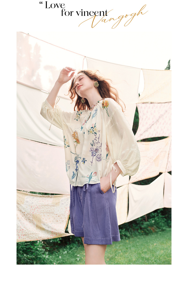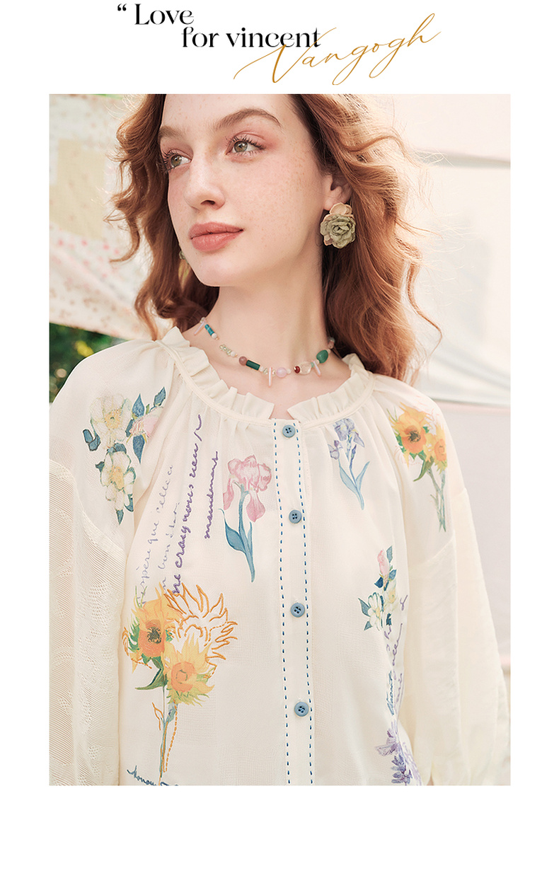 两三事梵高文艺写生花集2024夏季新款印花绑带灯笼袖衬衫女宽松