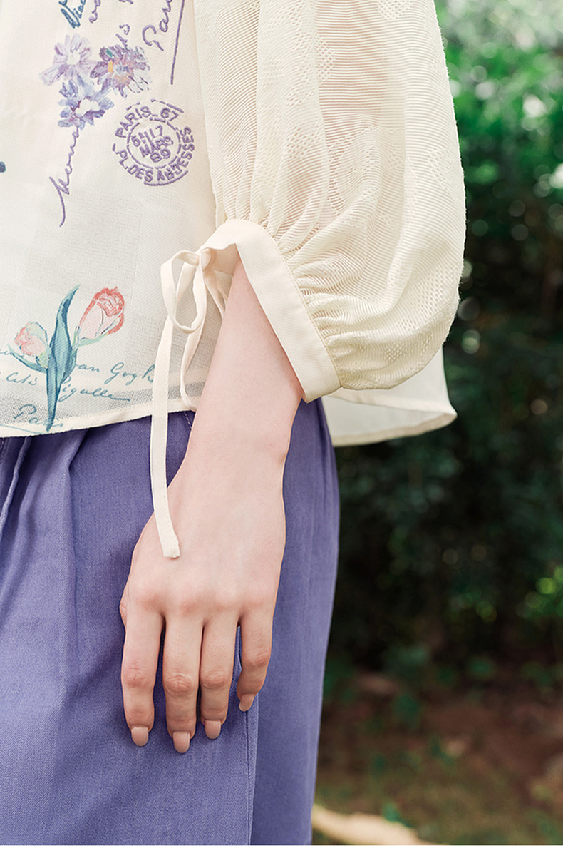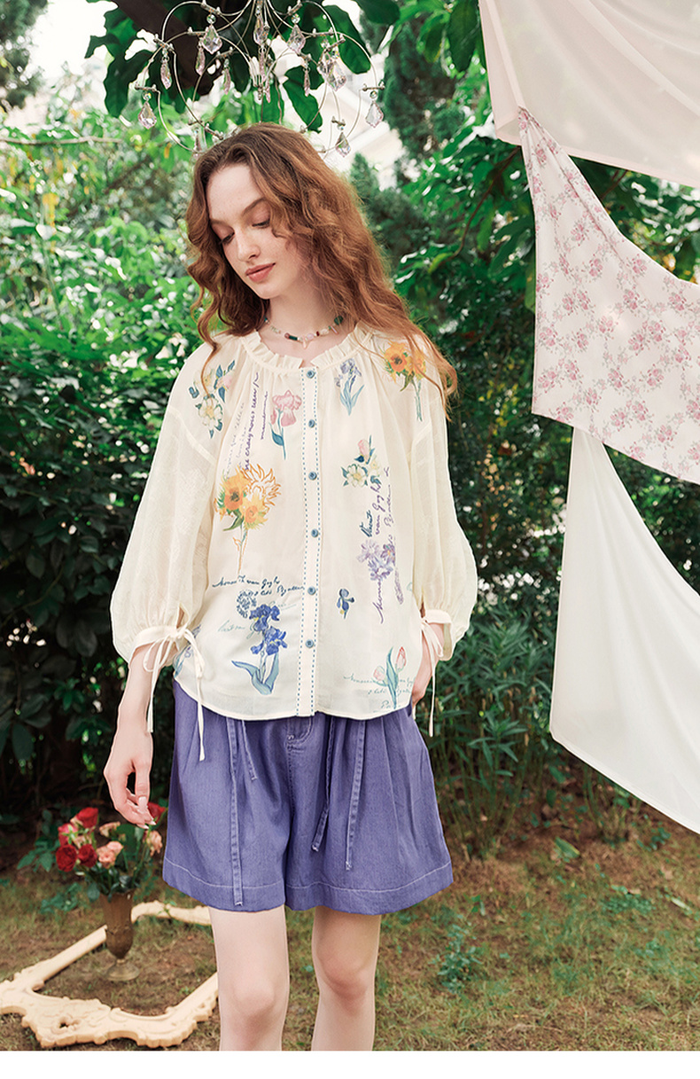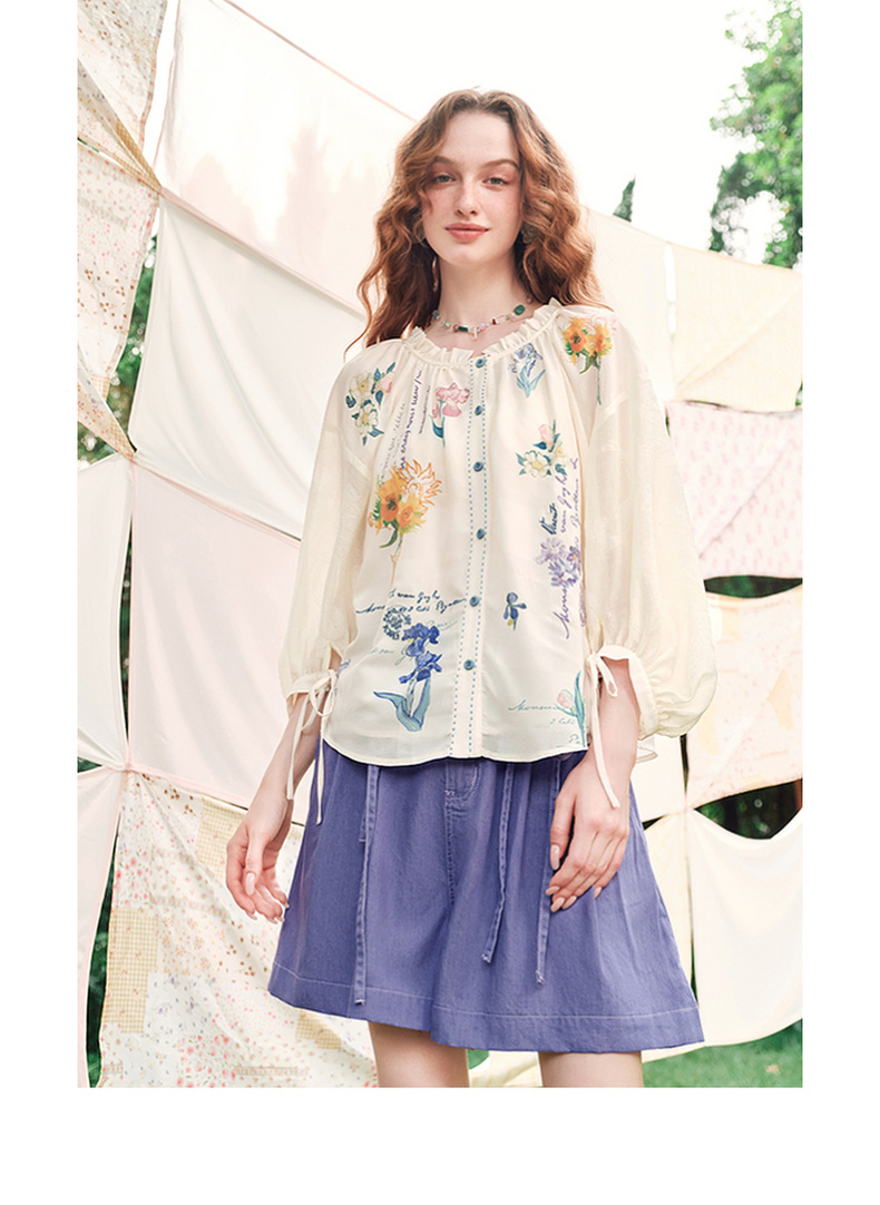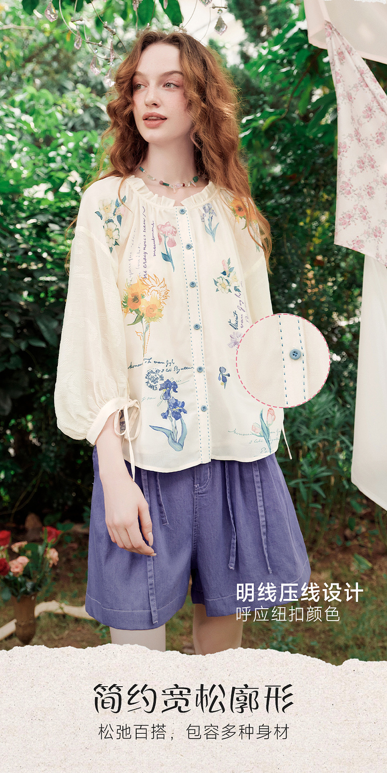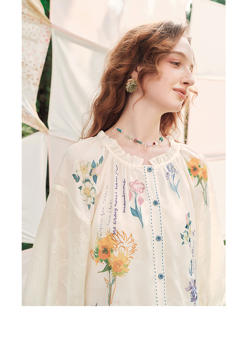 两三事梵高文艺写生花集2024夏季新款印花绑带灯笼袖衬衫女宽松