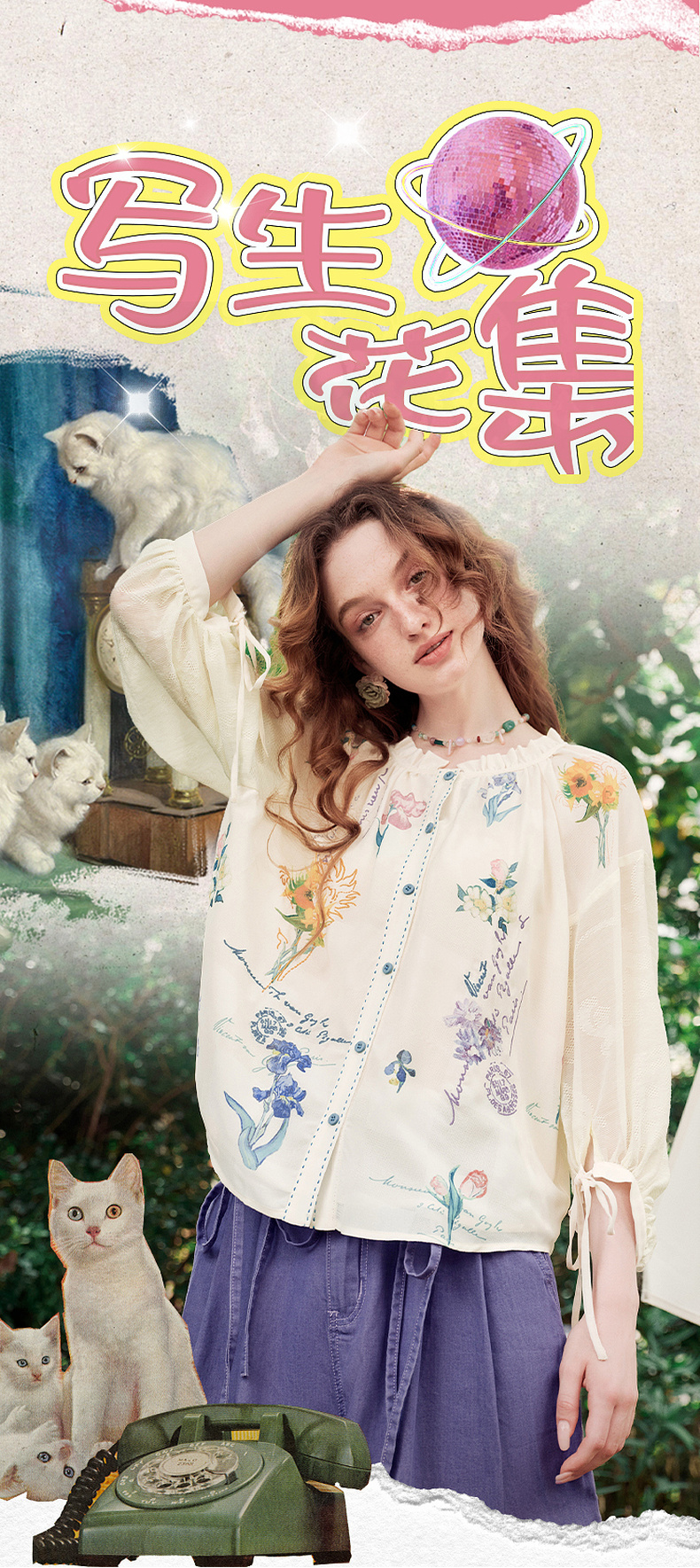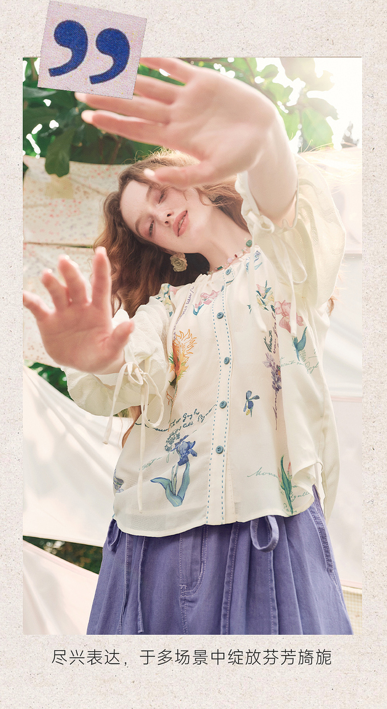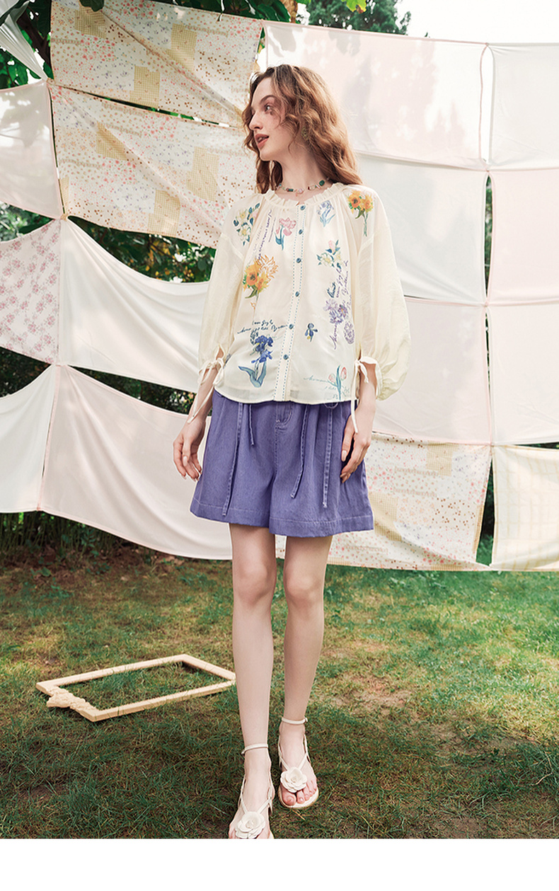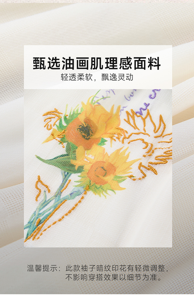 两三事梵高文艺写生花集2024夏季新款印花绑带灯笼袖衬衫女宽松