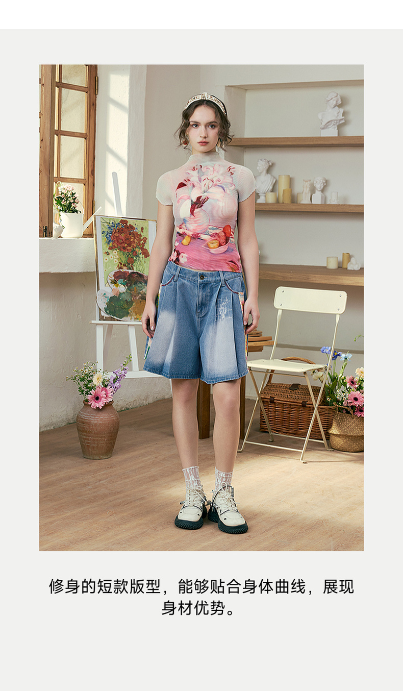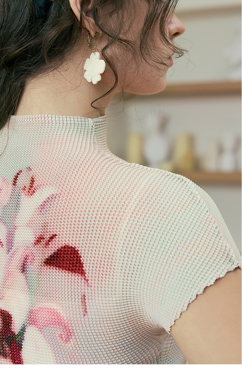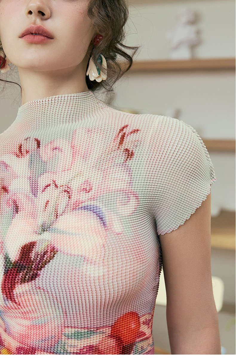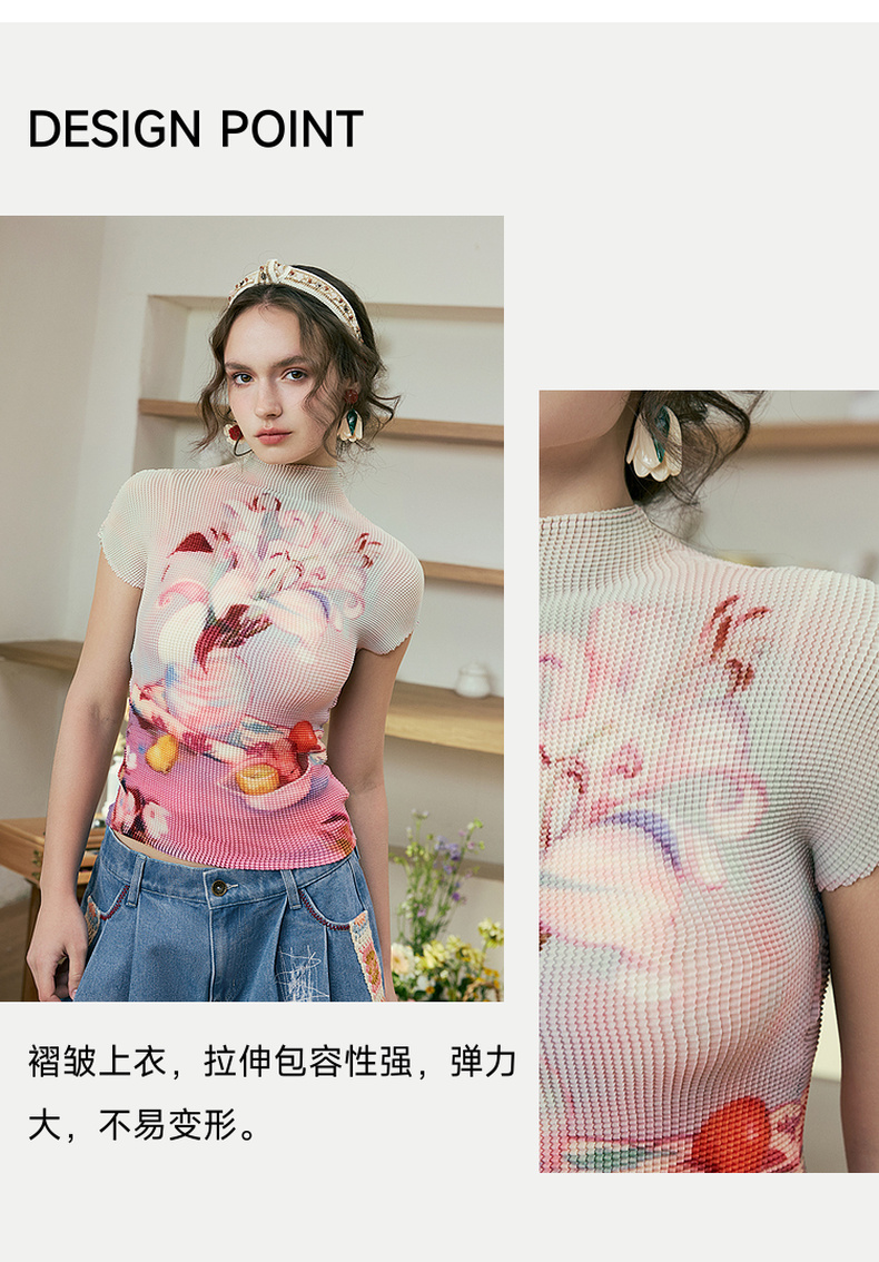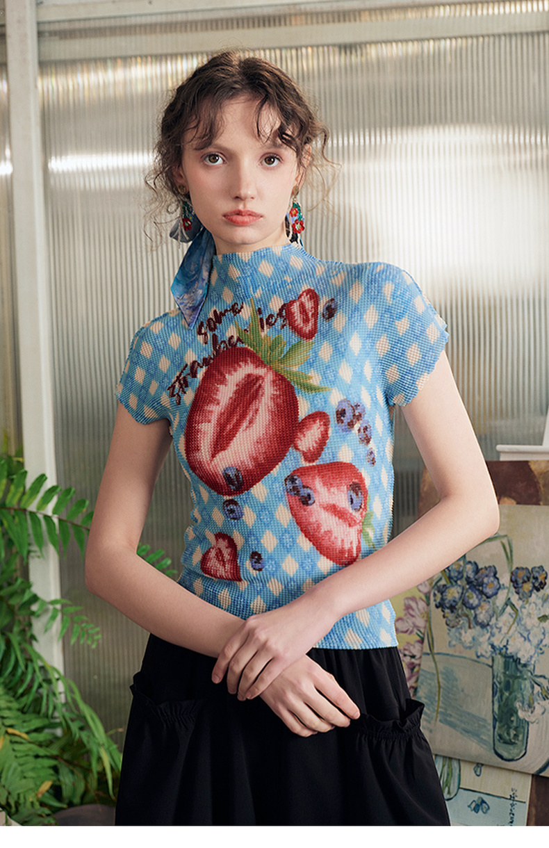 两三事莓果微醺2025夏季新款复古印花压褶半高领打底衫短袖t恤女