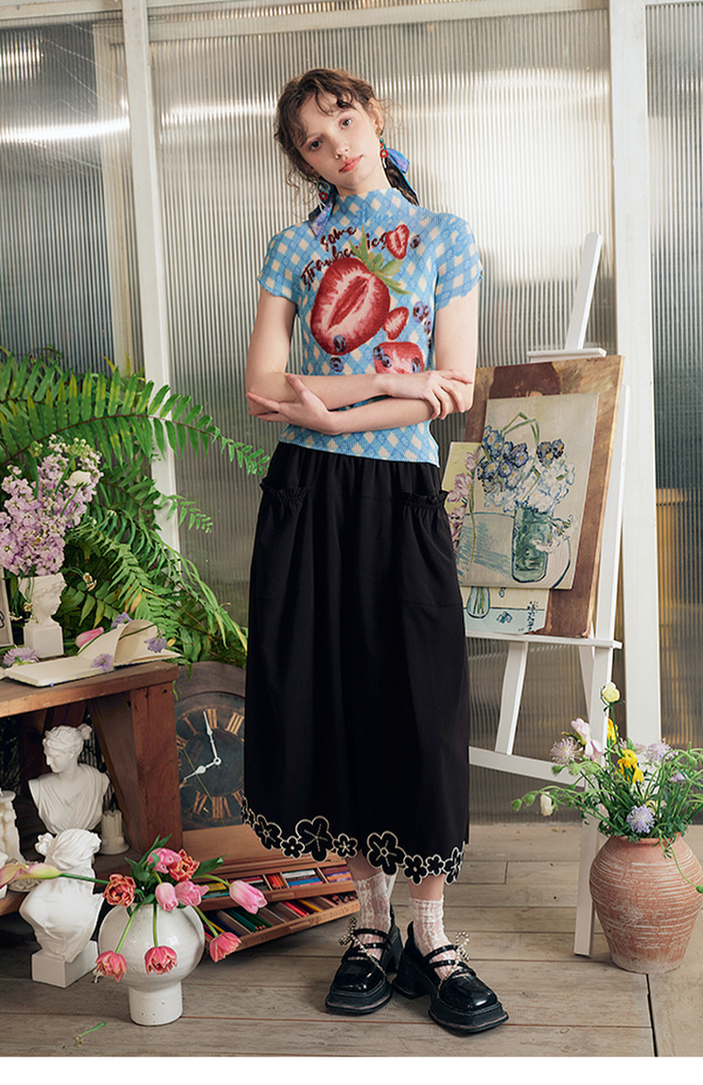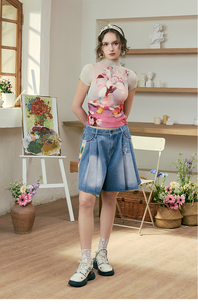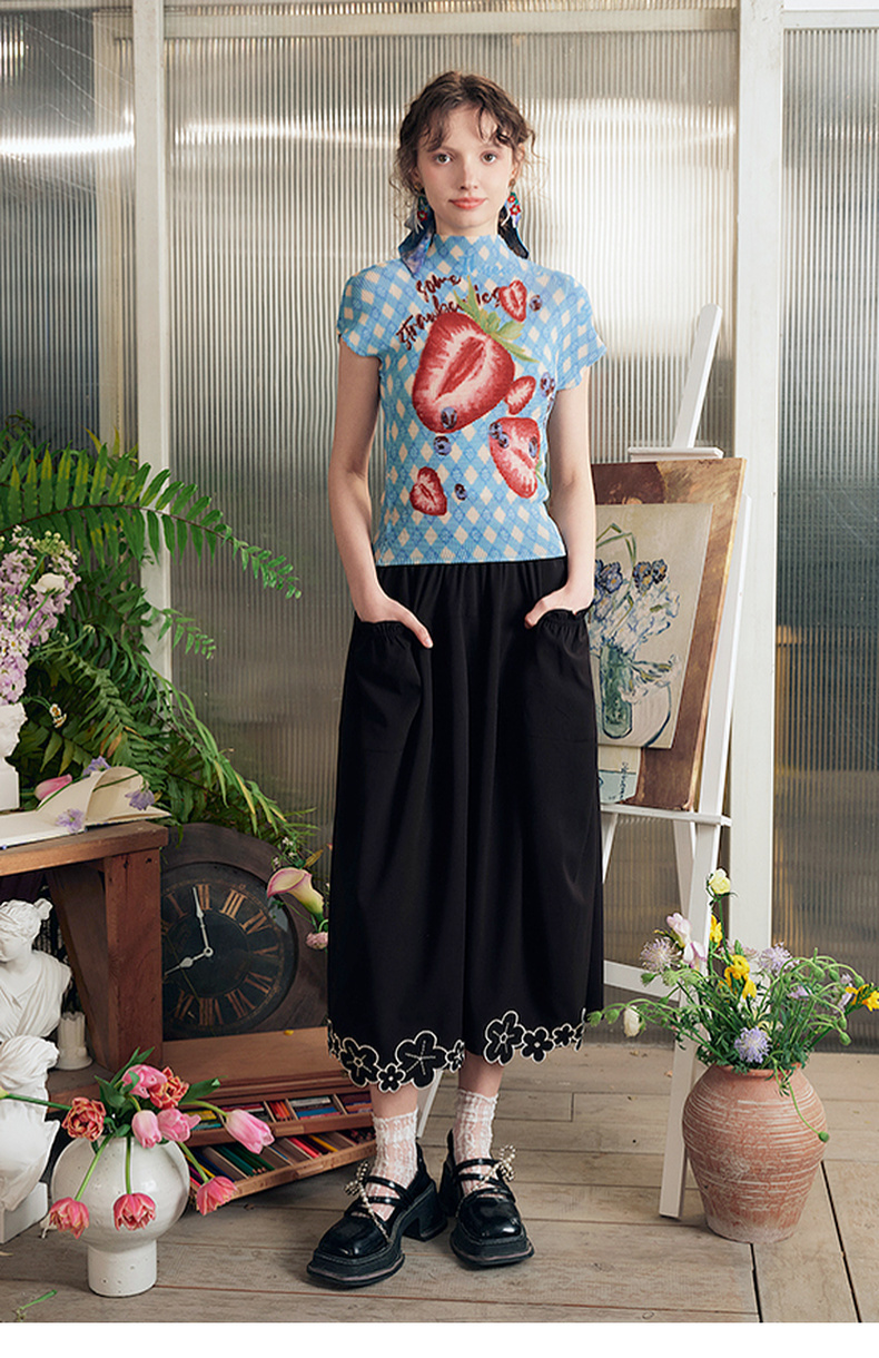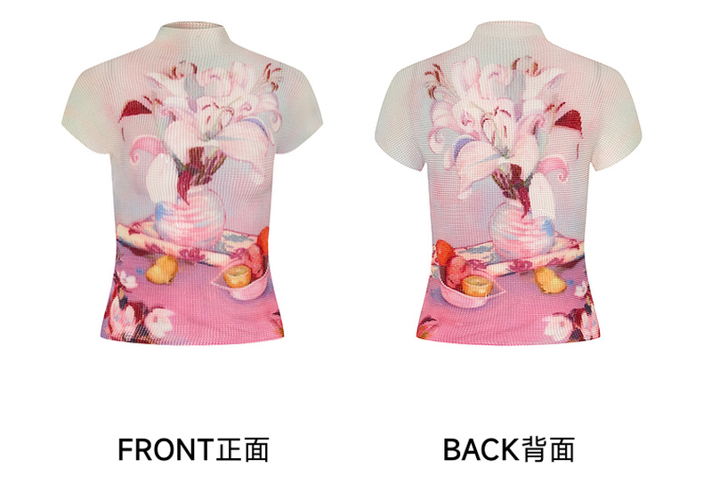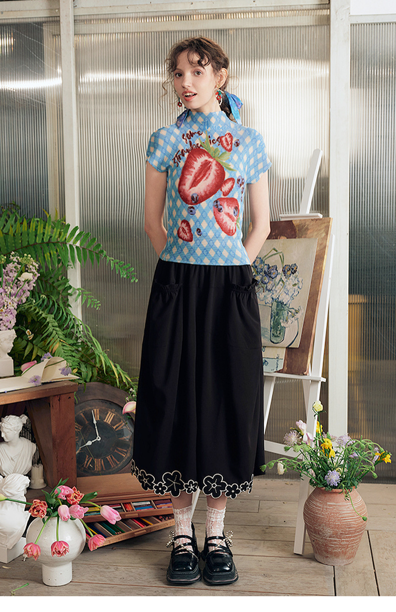 两三事莓果微醺2025夏季新款复古印花压褶半高领打底衫短袖t恤女
