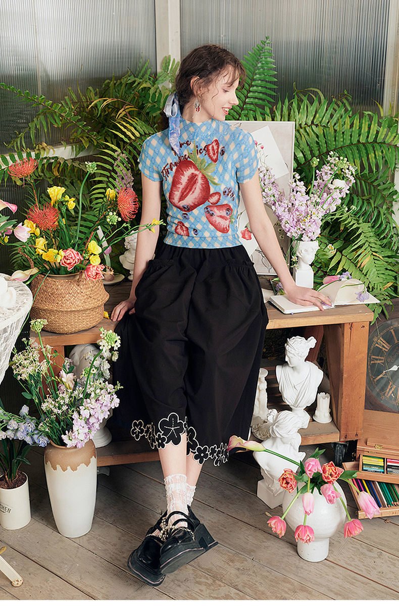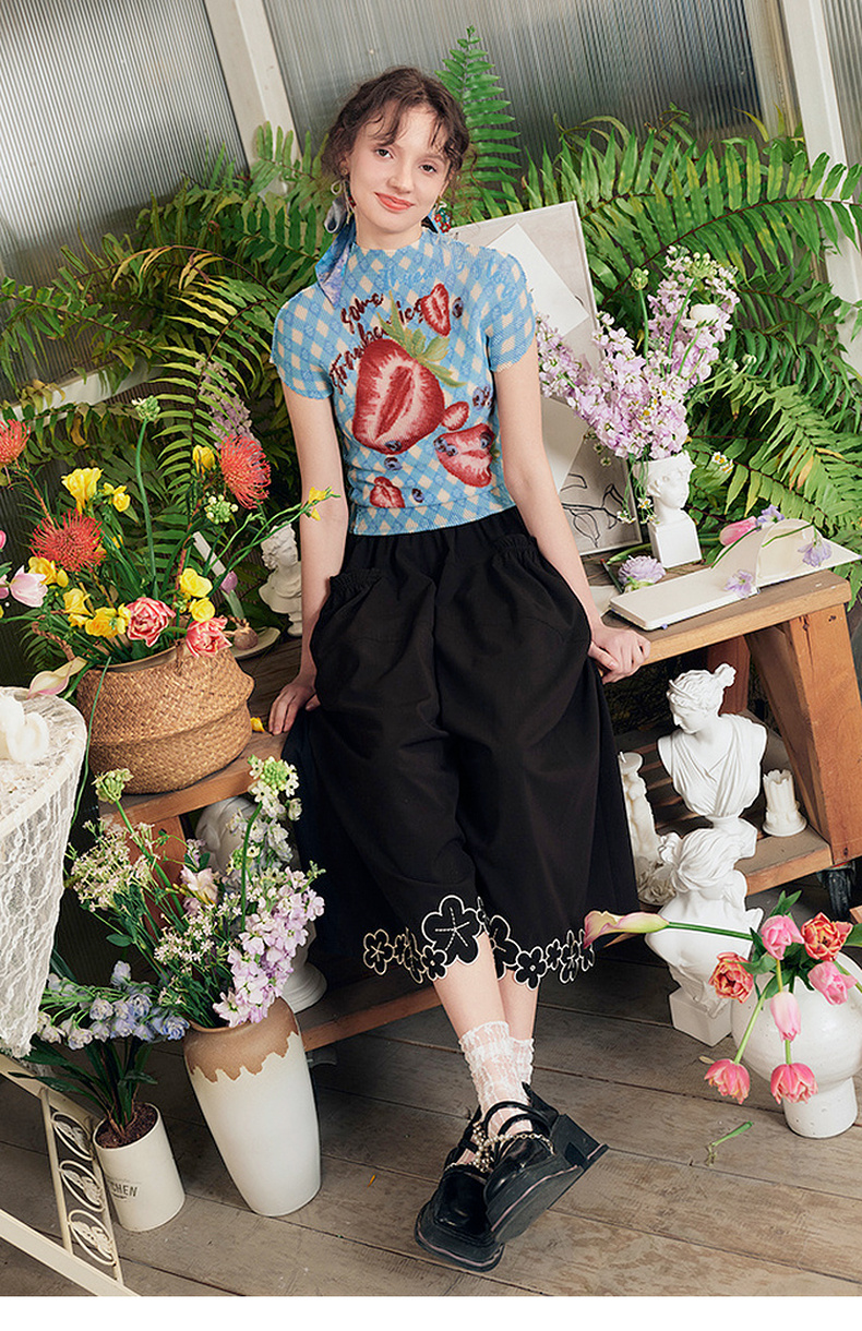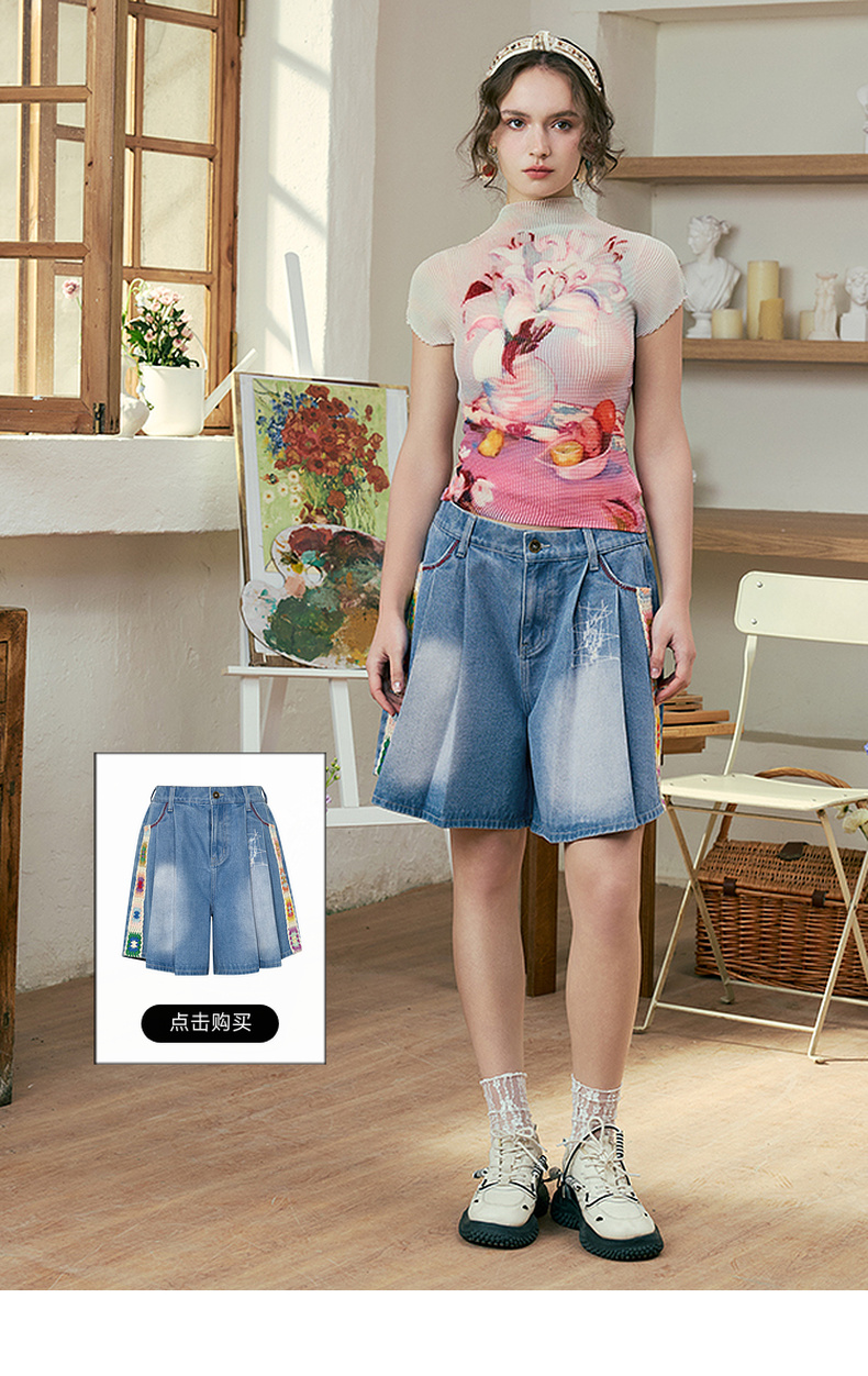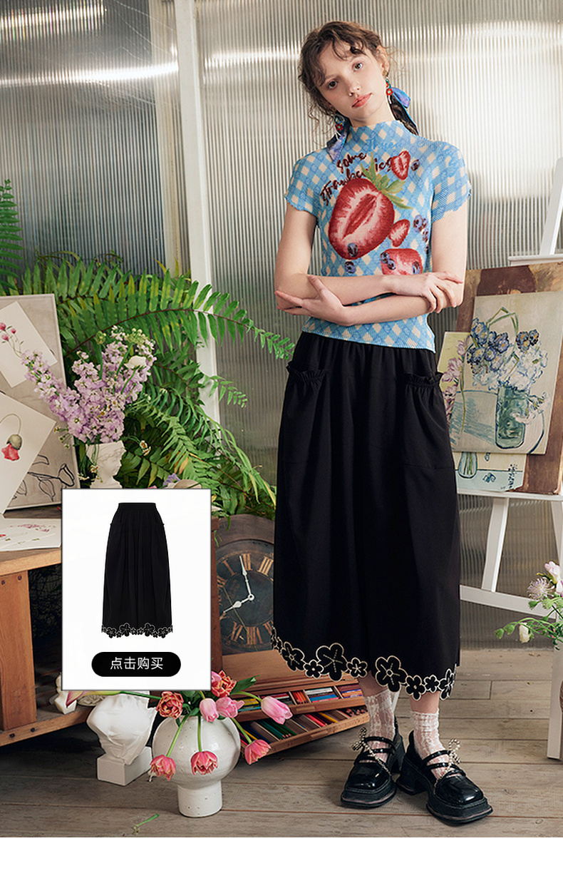 两三事莓果微醺2025夏季新款复古印花压褶半高领打底衫短袖t恤女