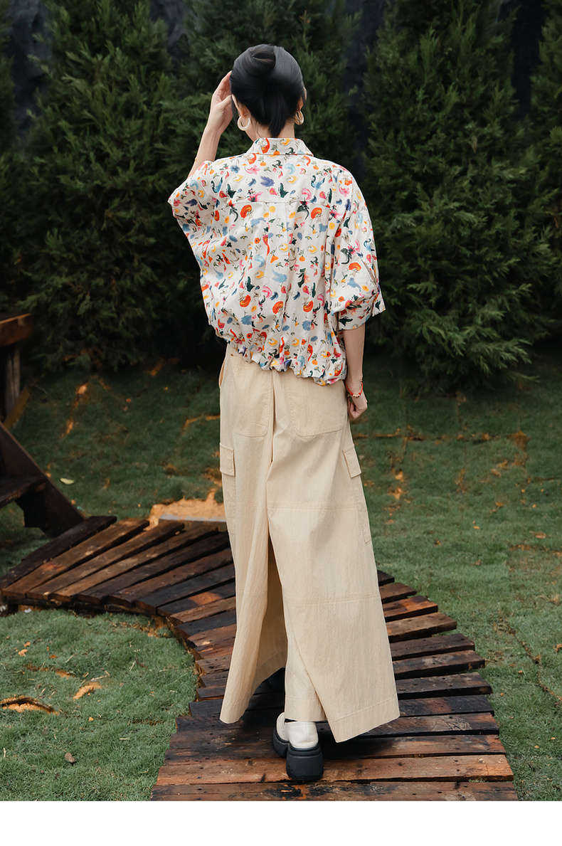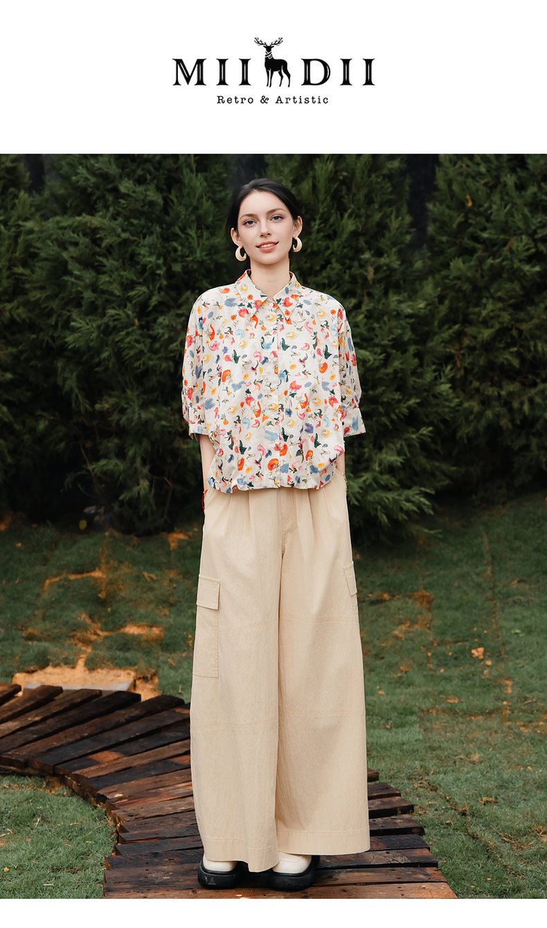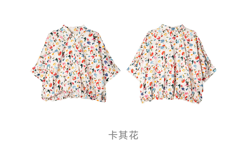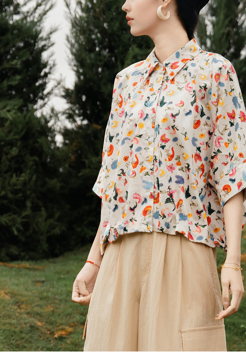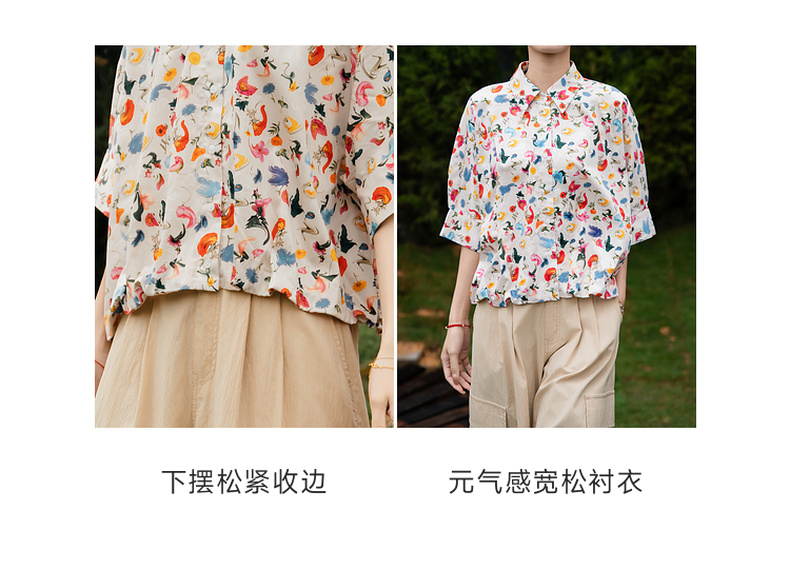 谜底花色衬衫分袖女2025夏新款复古宽松下摆可收缩衬衣256MC6202