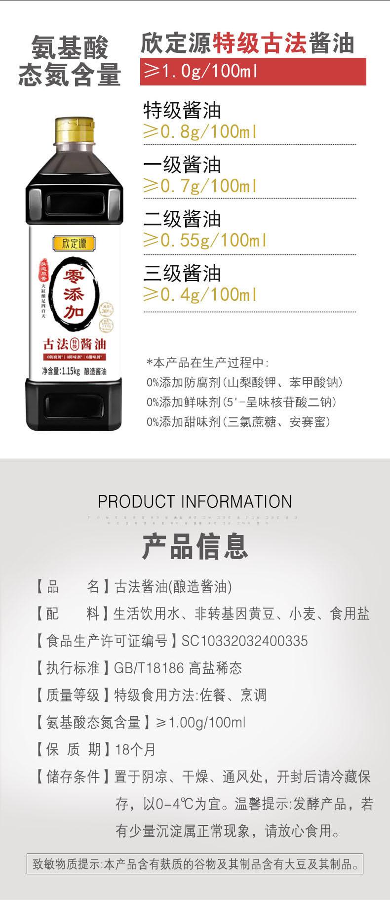 【九九年】欣定源特级古法酱油零添加头道400天1.15kg*2瓶