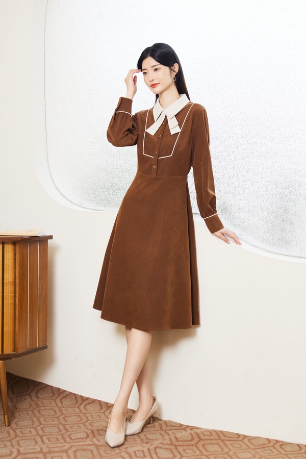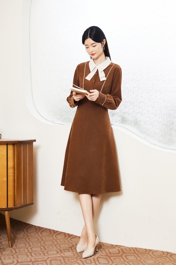 Le Malene 棕色精致气质领结收腰连衣裙 17529