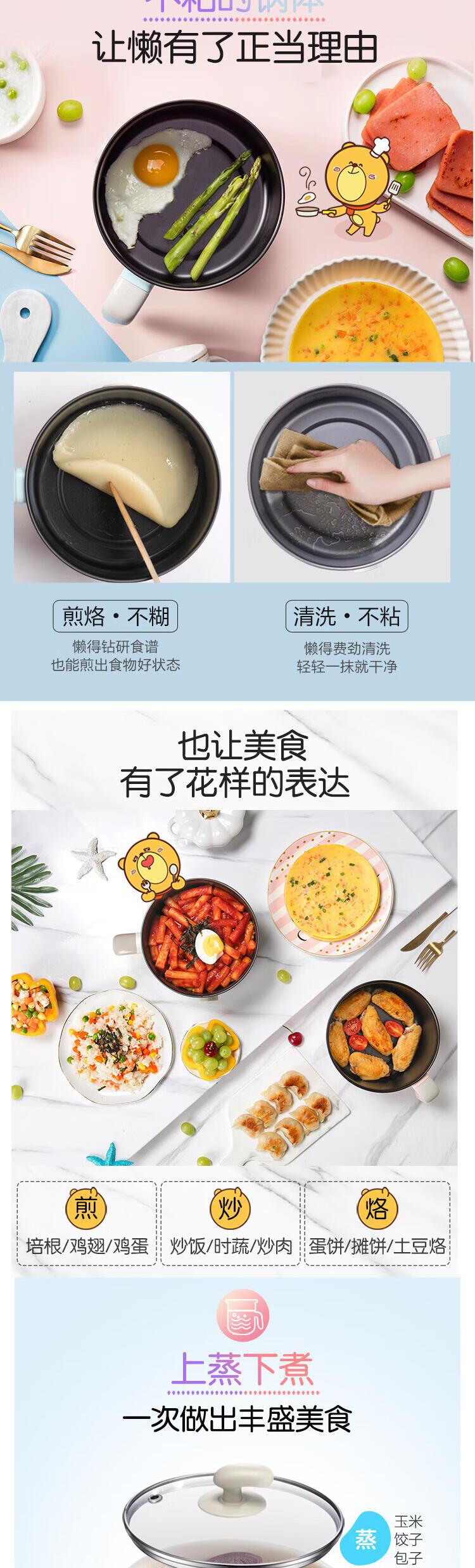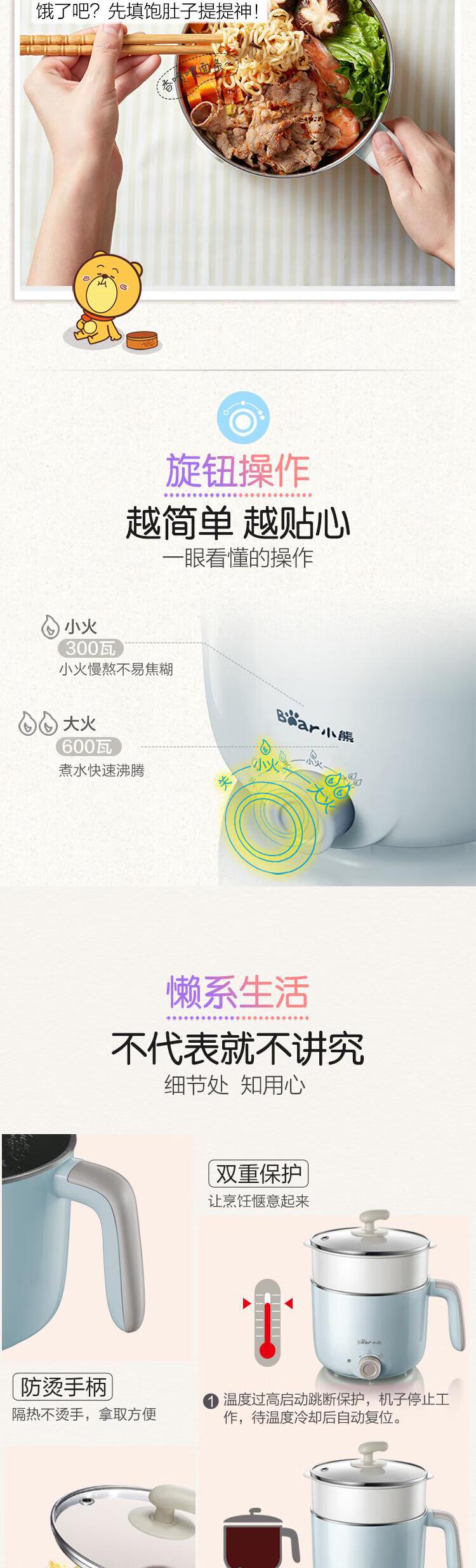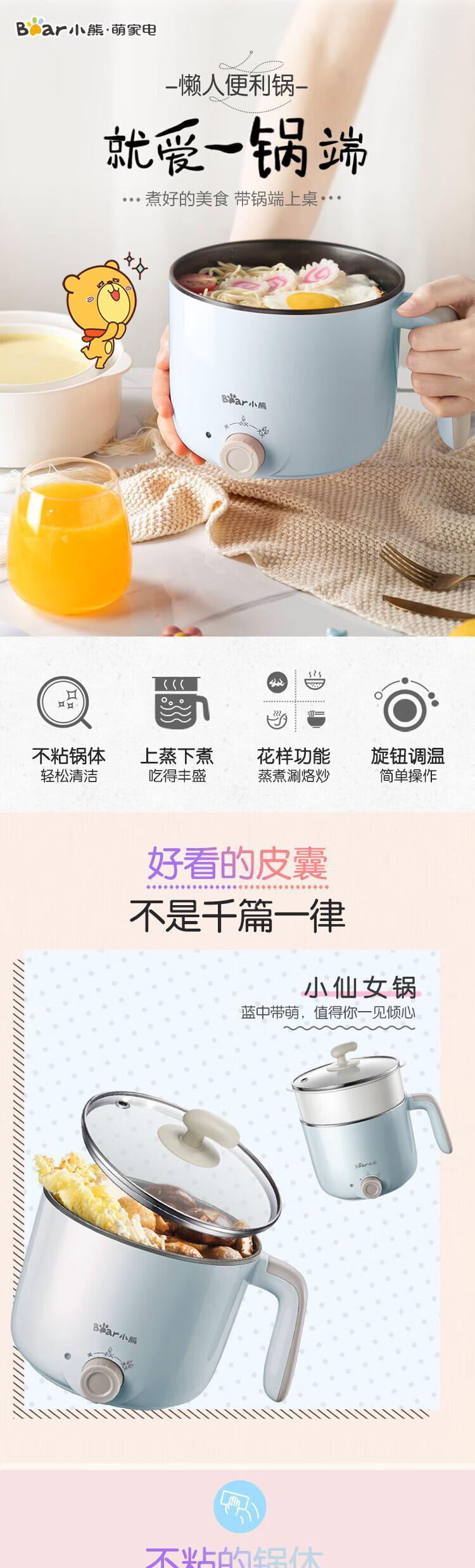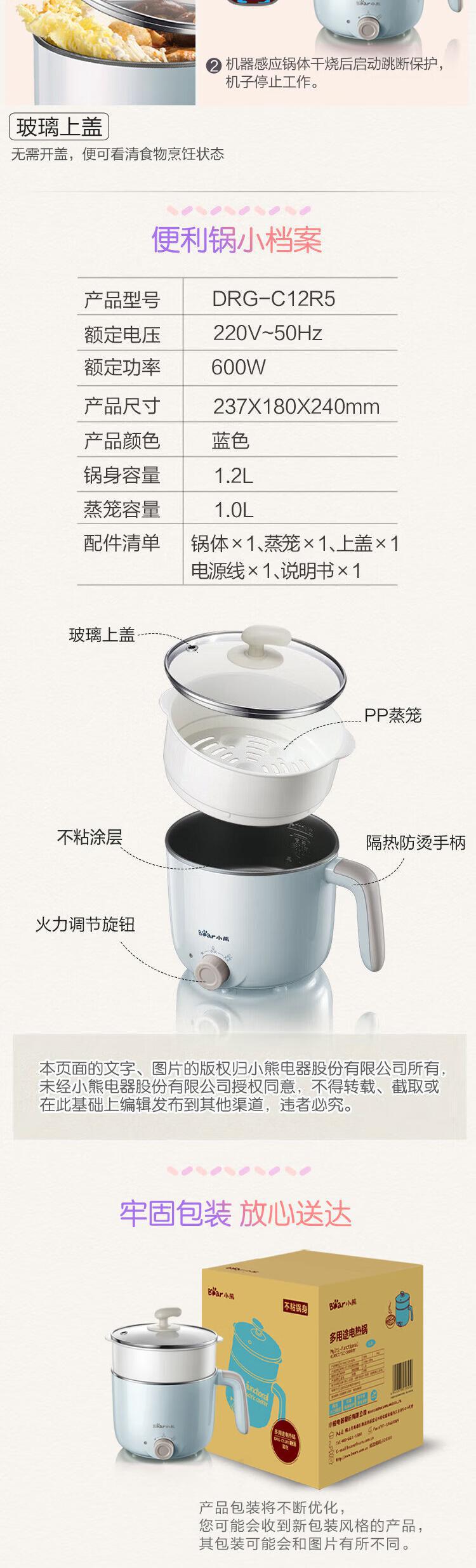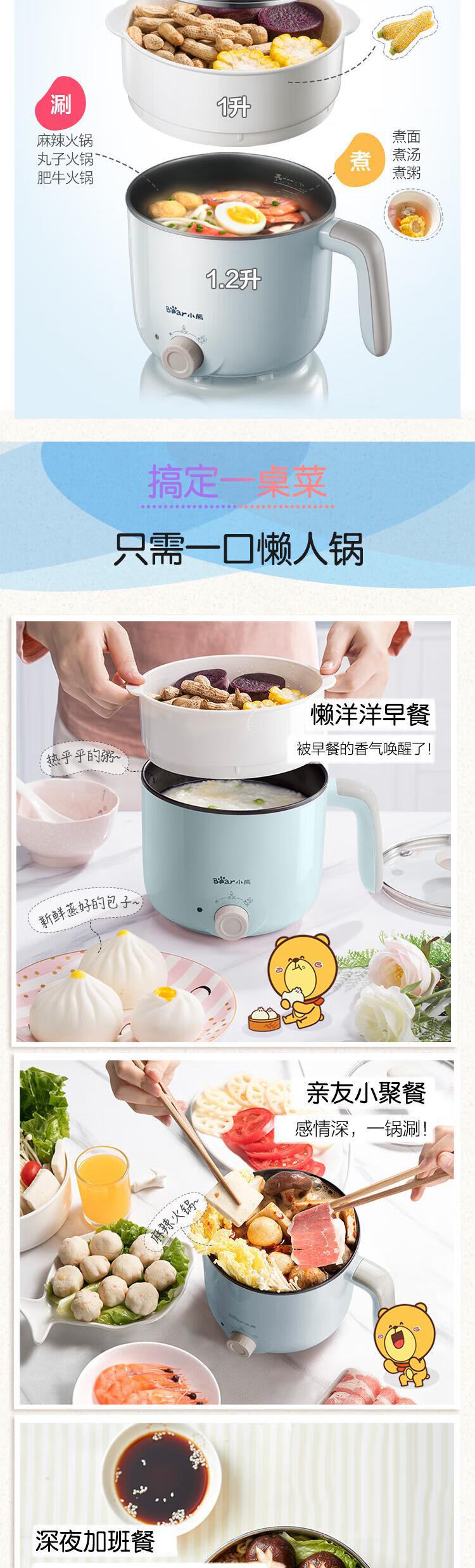 【自营】小熊(Bear)电煮锅 宿舍小锅 小电锅 电热锅蒸锅 学生寝室一体泡面火锅多功能锅1.2L DRG-C12R5(蒸笼款)两档可调防干烧不粘内锅蒸煮皆宜宿舍必备