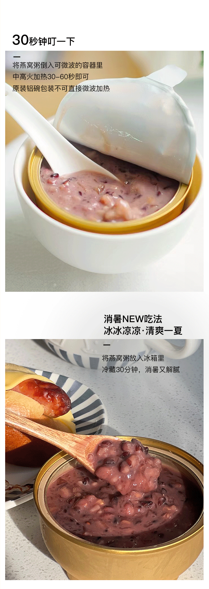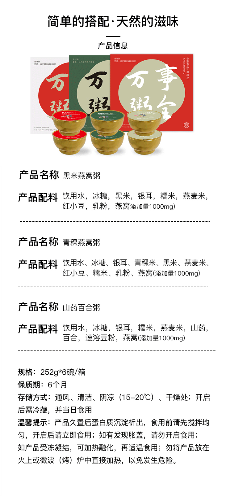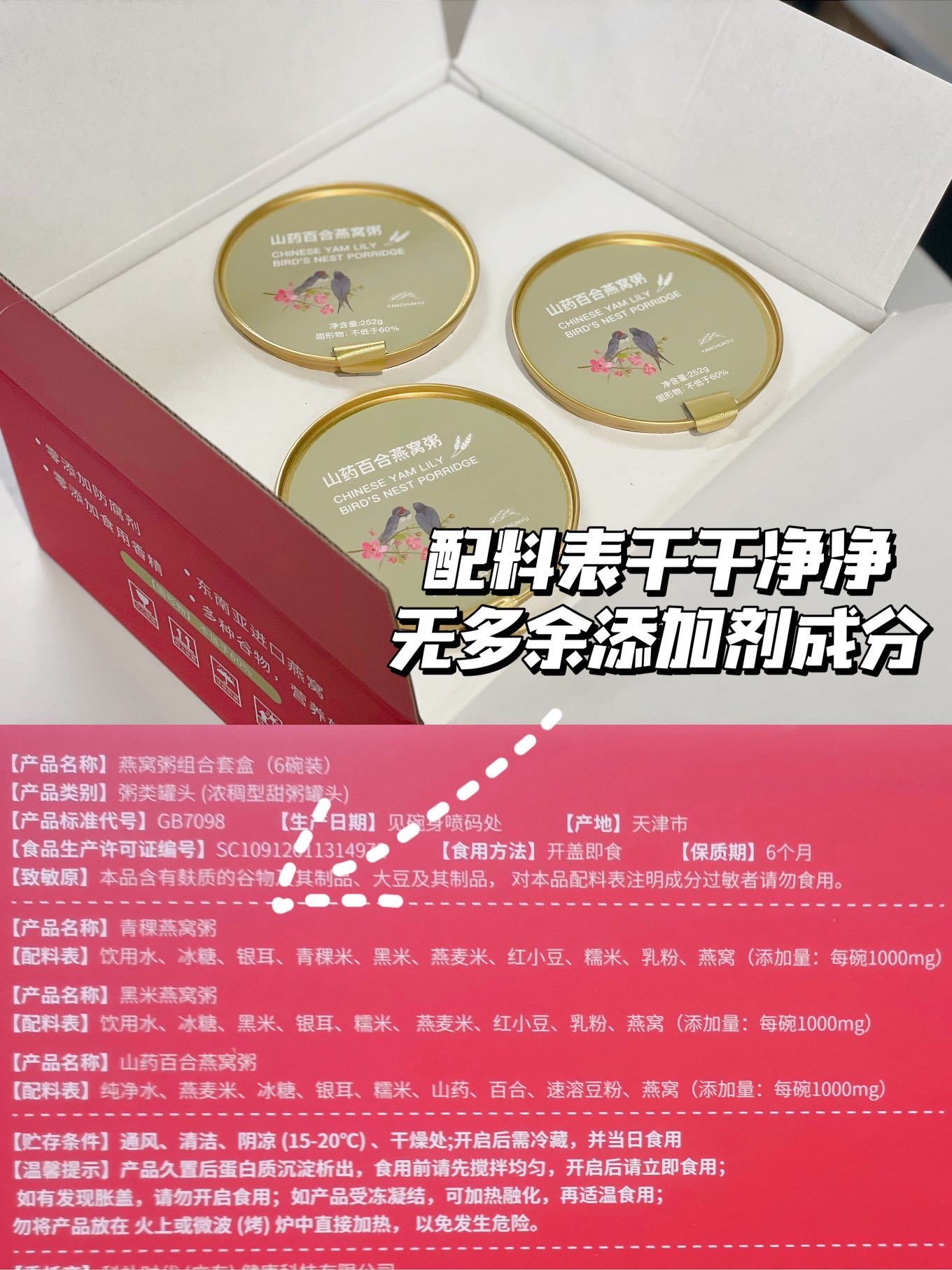 品名:燕春语燕窝粥6碗装礼盒版 规格:252g*6碗/箱 保质期:6个月 发货快递:顺丰 发货地:天津 生产日期:近一个月左右 发货时长:48小时左右 加运费地区及具体加多少运费:新疆、西藏、海南+20元/箱;云南、青海+15元/箱;其他地方包邮 不发货地区:港澳台限制发货 【售后标准】:①收货请当面验收,如遇到破损、少件、错发等情况,务必在签收24小时内申请售后,提报售后请提供快递面单图,产品问题图(所有的售后都基于提供照片或视频为凭证,未提供凭证或超过售后时效,不予处理,请理解!) ②由于顾客未及时接听电话、未及时取货、储存不当等自身造成的问题,不售后,不赔付。商品本身没有质量问题,因个人口感喜好不同、商品色泽、个人感官认知等,不做售后。 ③产品一旦发出,不支持拦截召回,不支持拒收,如若拒收需承担发出退回运费!(拦截需扣除9元发货费用) 适合人群:早起空腹胃虚/胡吃海喝/胃 部疾病/食欲不佳/抵抗力差/饮食不规律/孕前孕后/自律/塑形/通勤上班/旅行出差 不适合人群:不满3岁的儿童、对蛋白质 及相关谷物过敏的人 |
