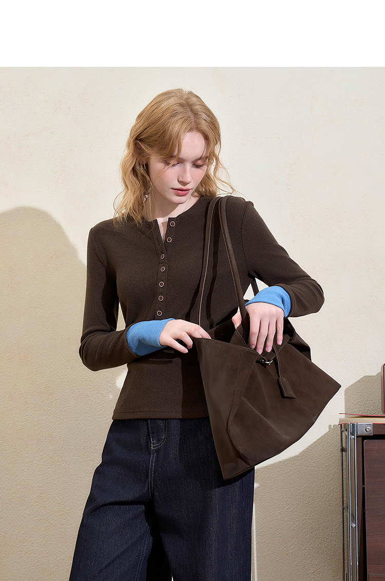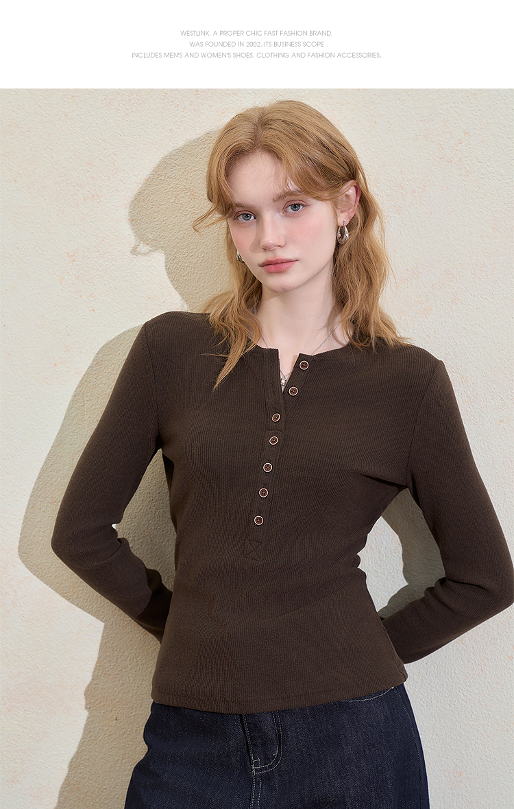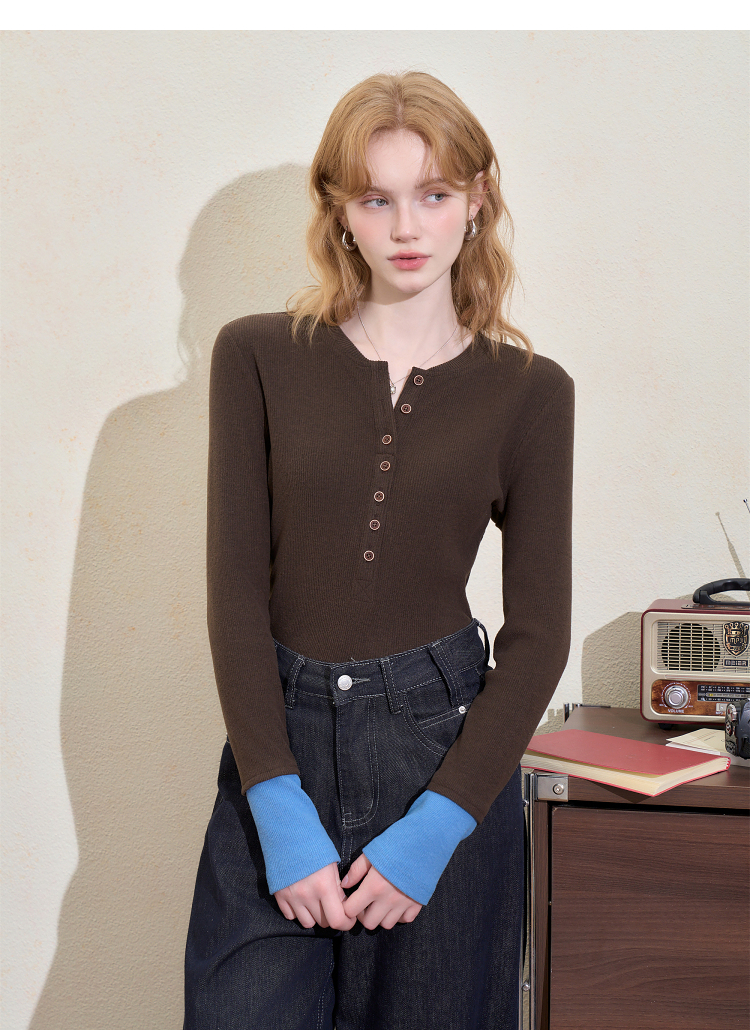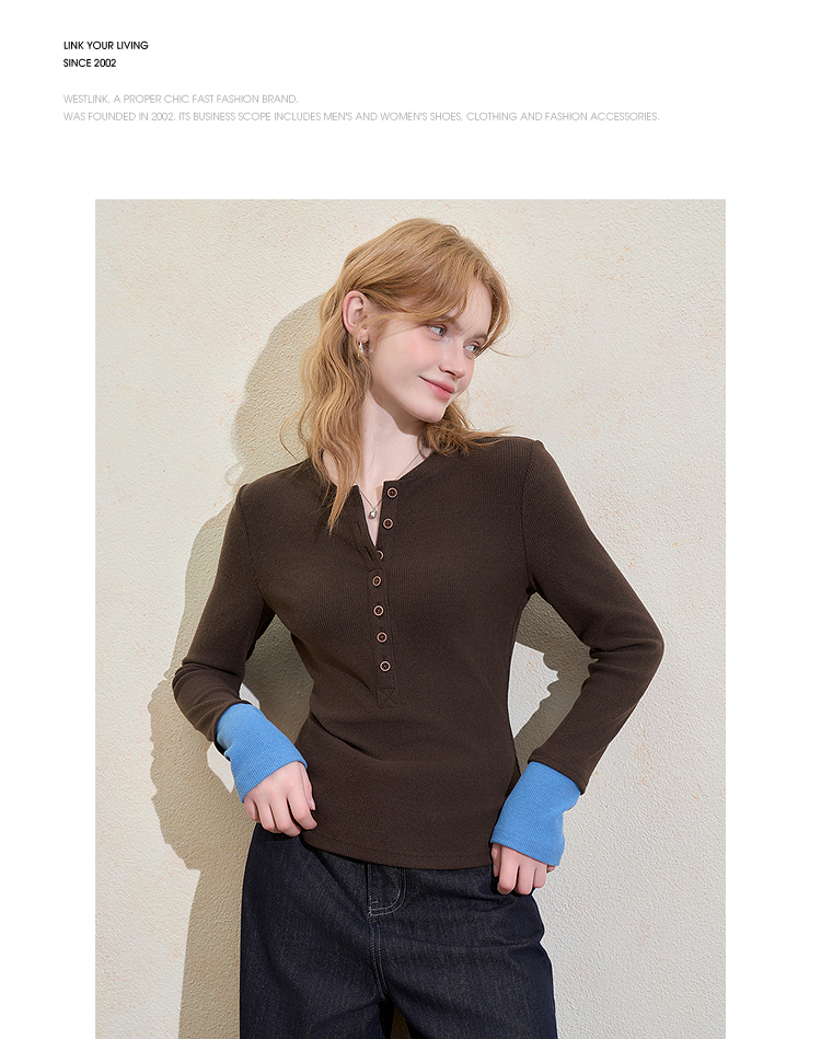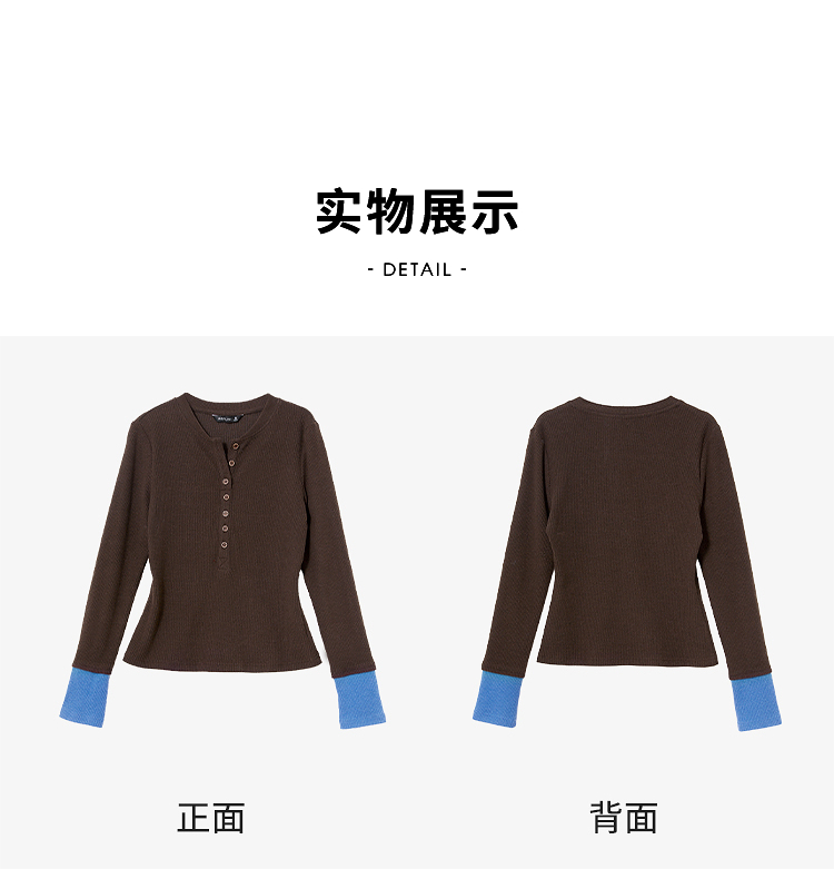 西遇撞色拼接假两件长袖T恤女冬季高弹修身显瘦内搭针织衫V3755290