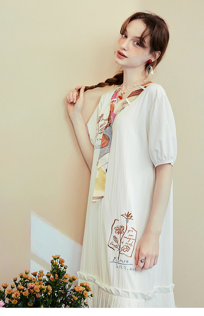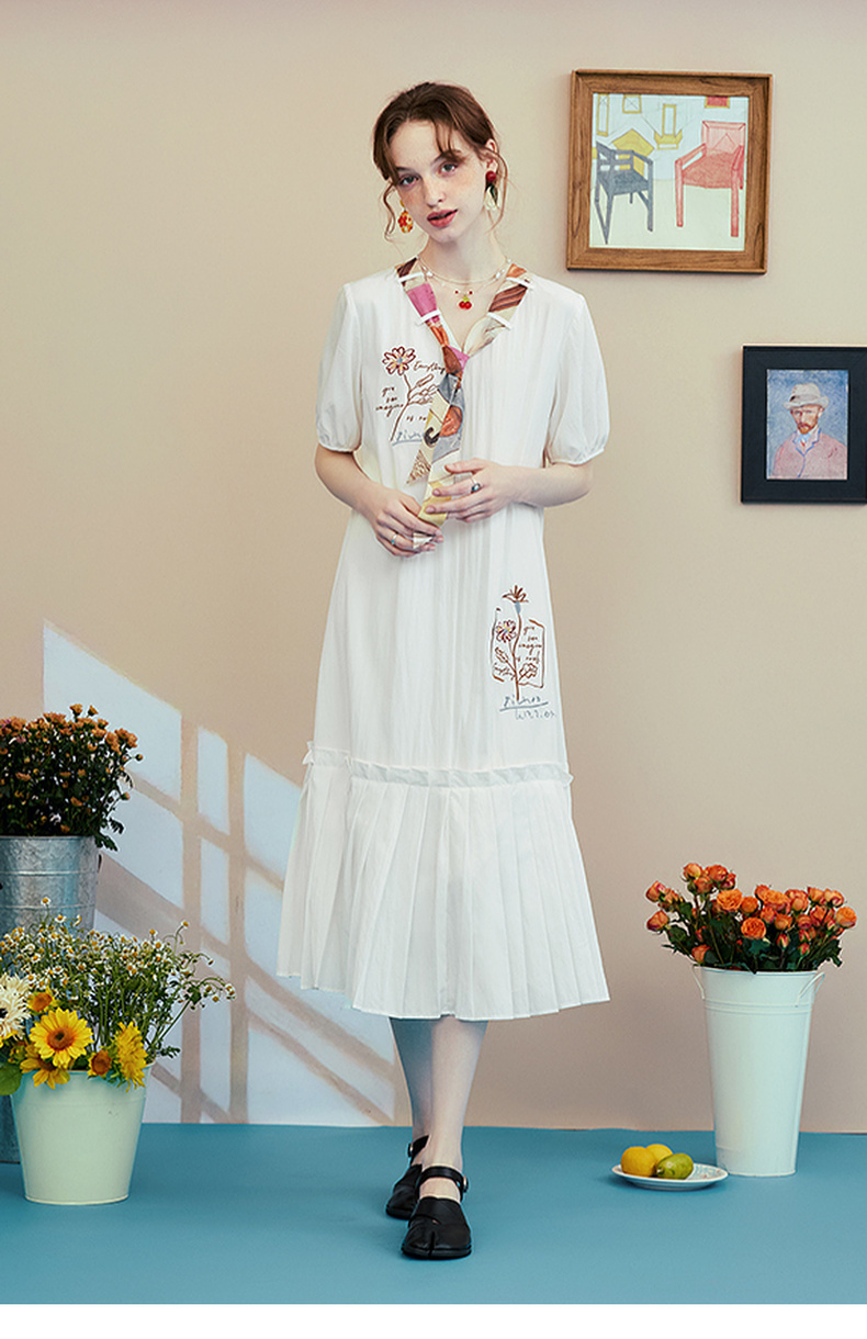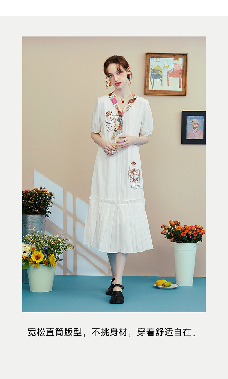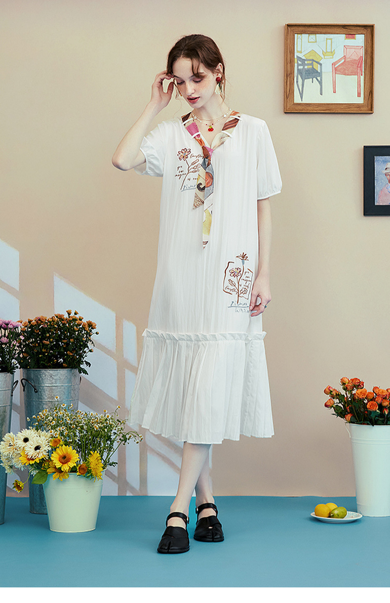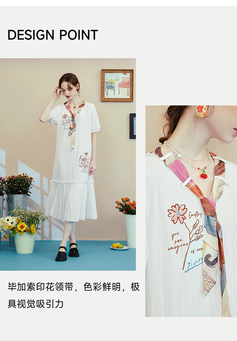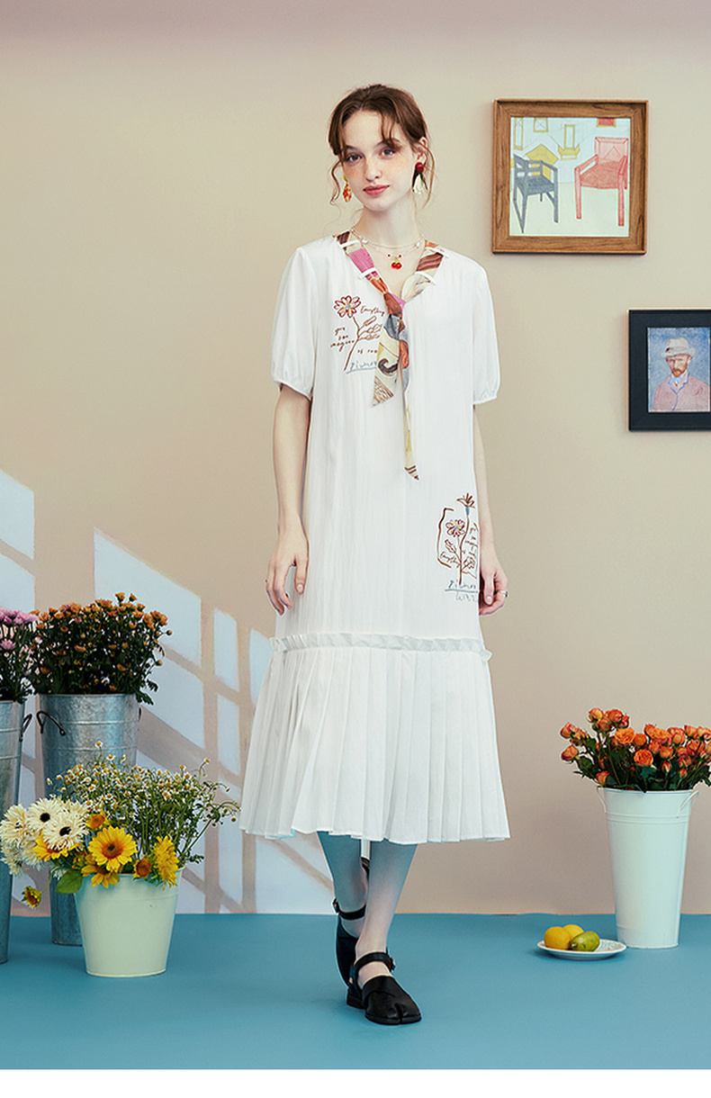 两三事 空谷迷香 2025夏季新款复古印花绑带领绣花百褶裙摆连衣裙