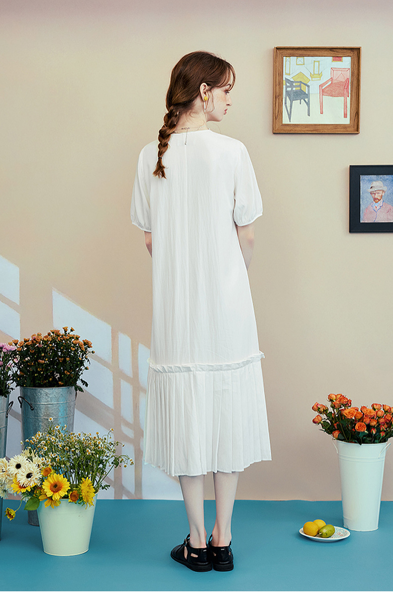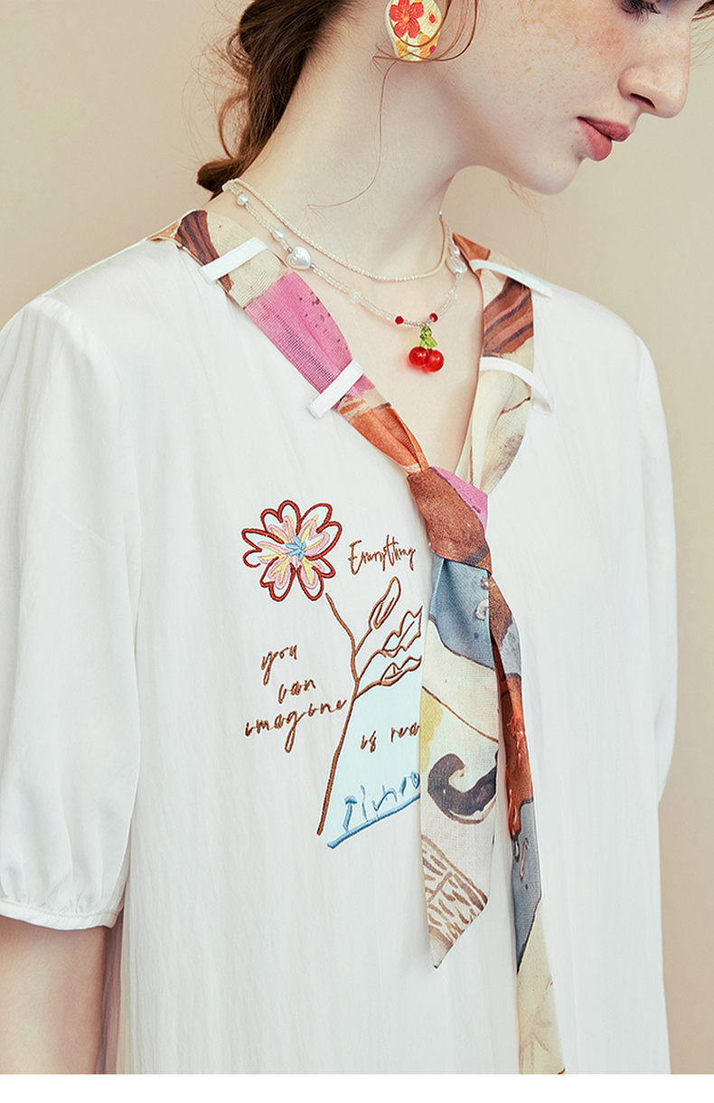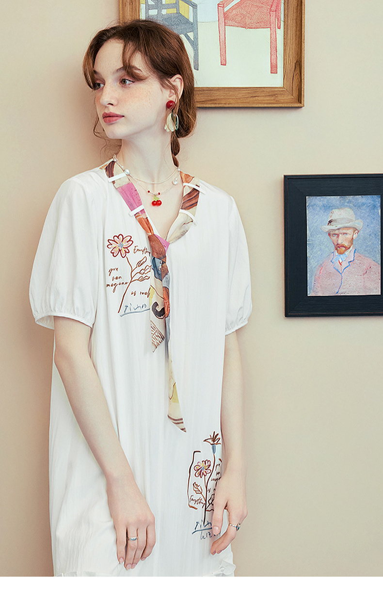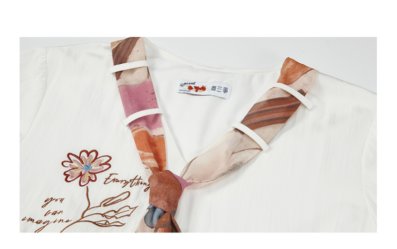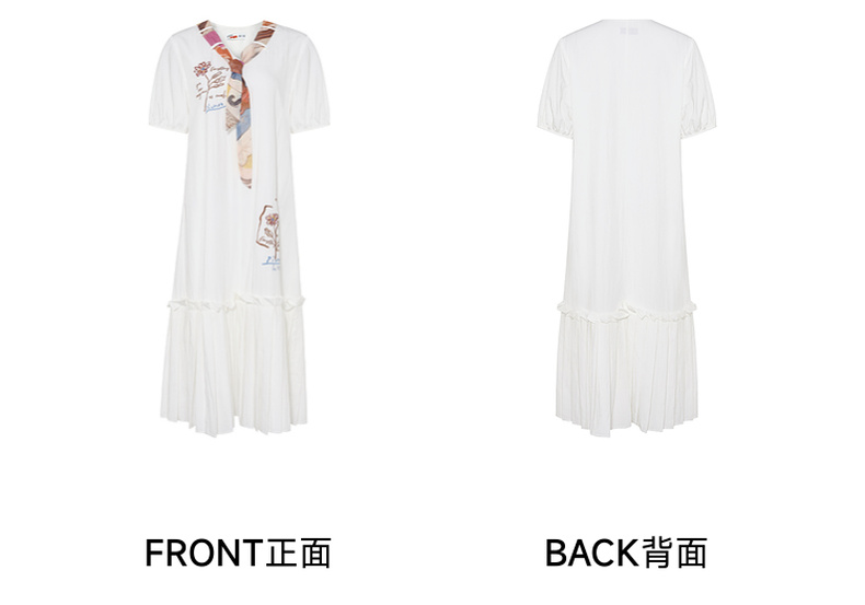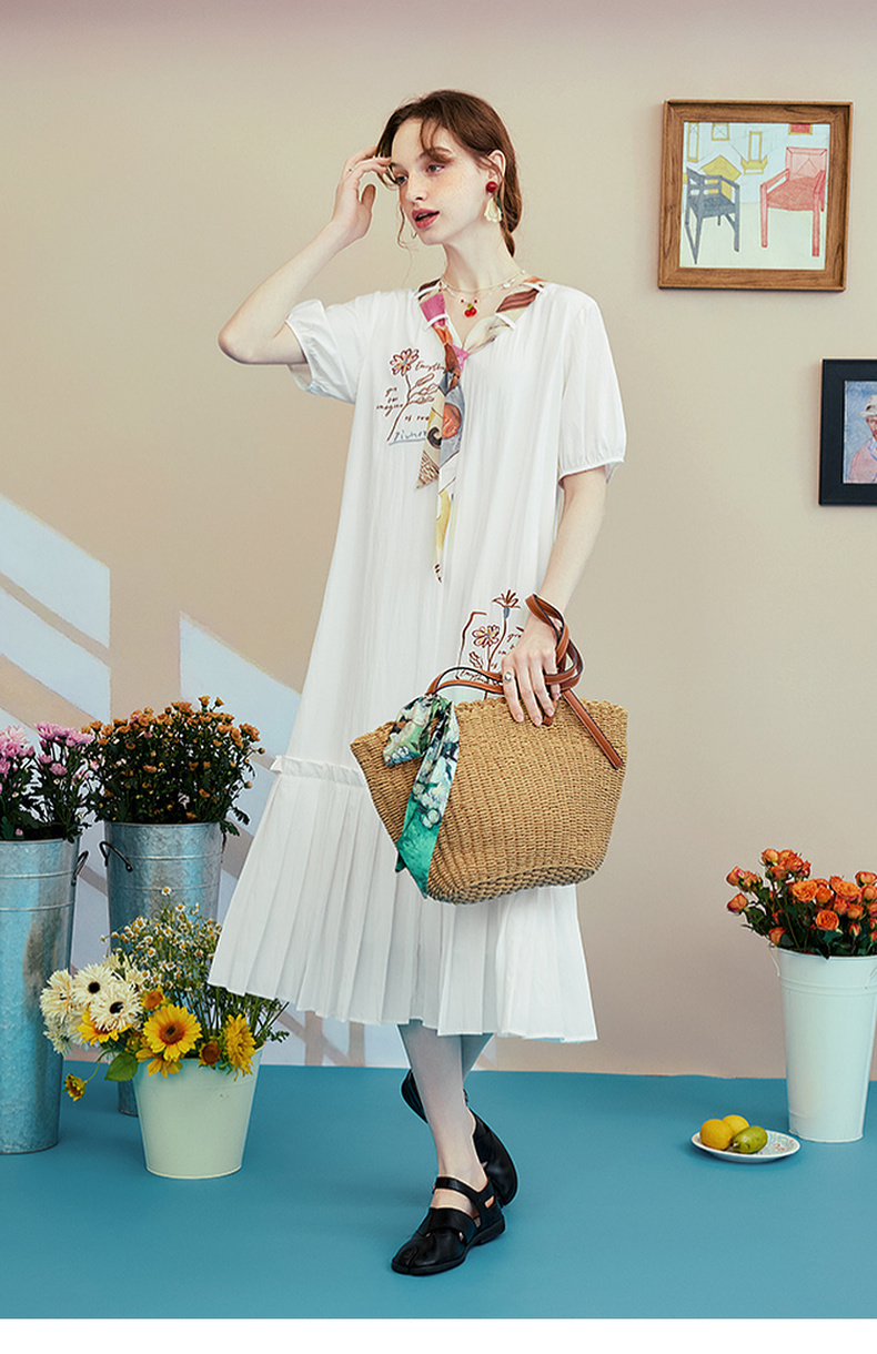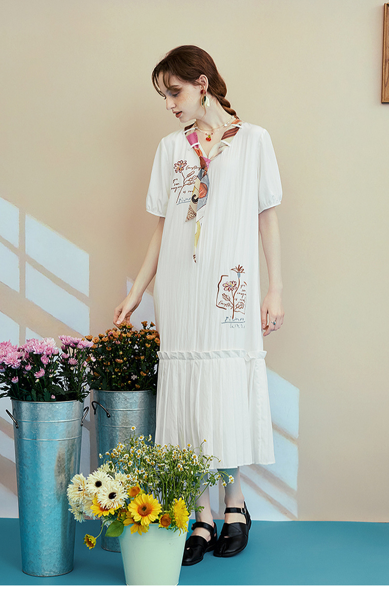 两三事 空谷迷香 2025夏季新款复古印花绑带领绣花百褶裙摆连衣裙