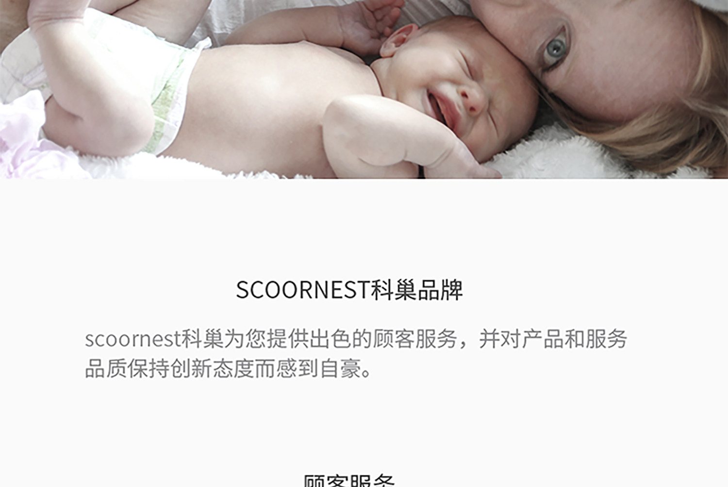 - Scoornest始终秉承给每一位宝宝送去科学的、关心的、创新的成长体验,通过提供商品和服务,使顾客形成守护、发展、巩固这种弥足珍贵的亲情的爱。