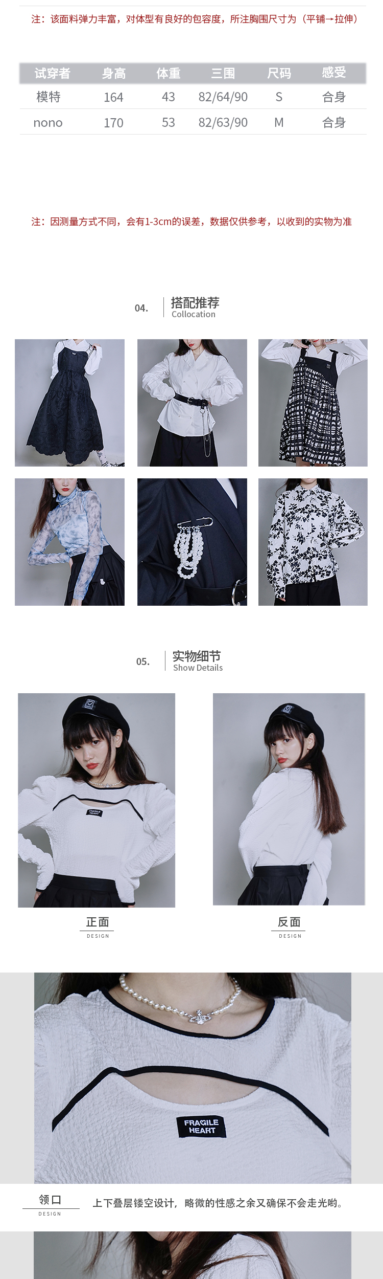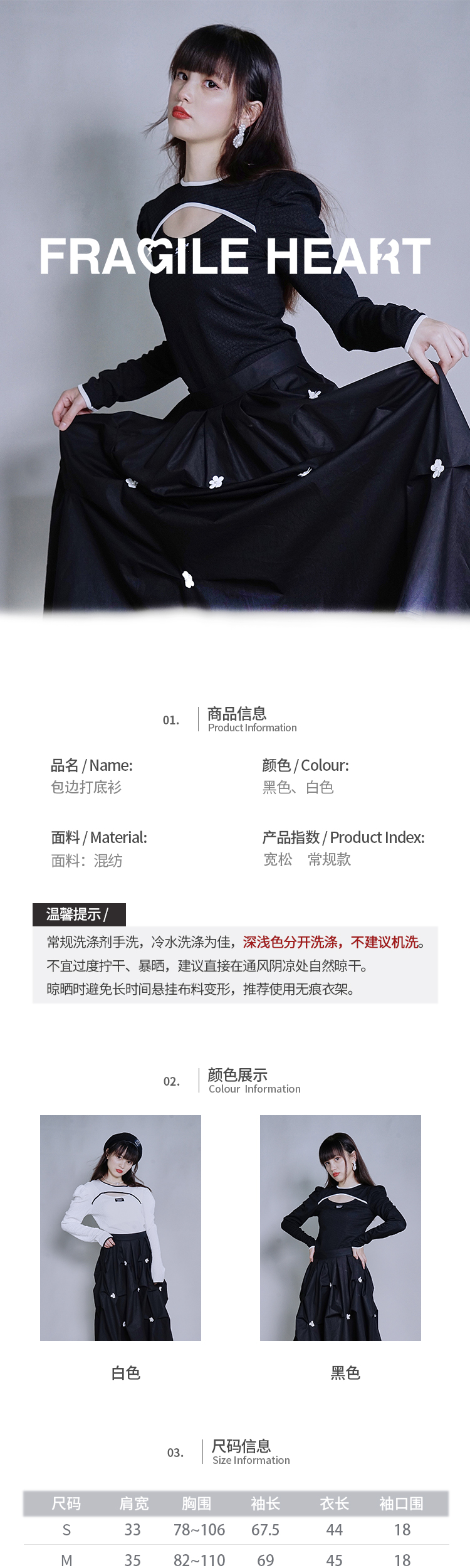 fragileheart 易碎商店镂空拼接长袖t恤黑白风打底衫女泡泡袖上衣