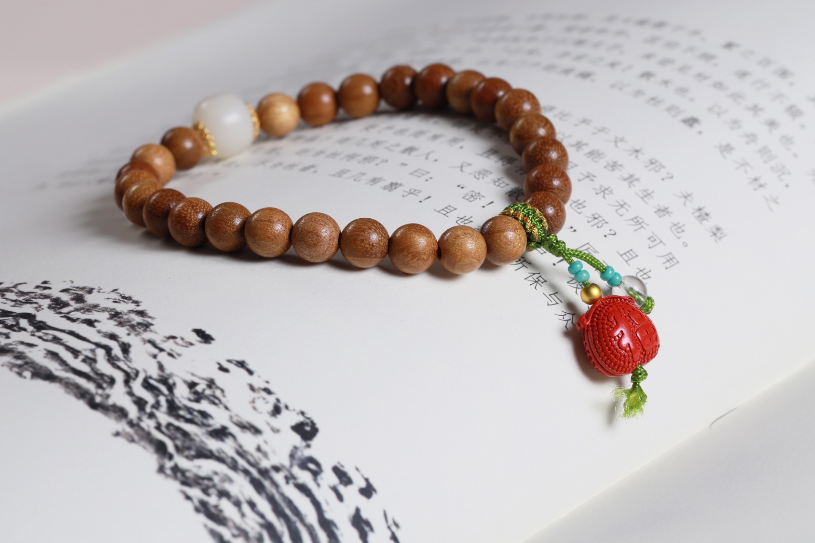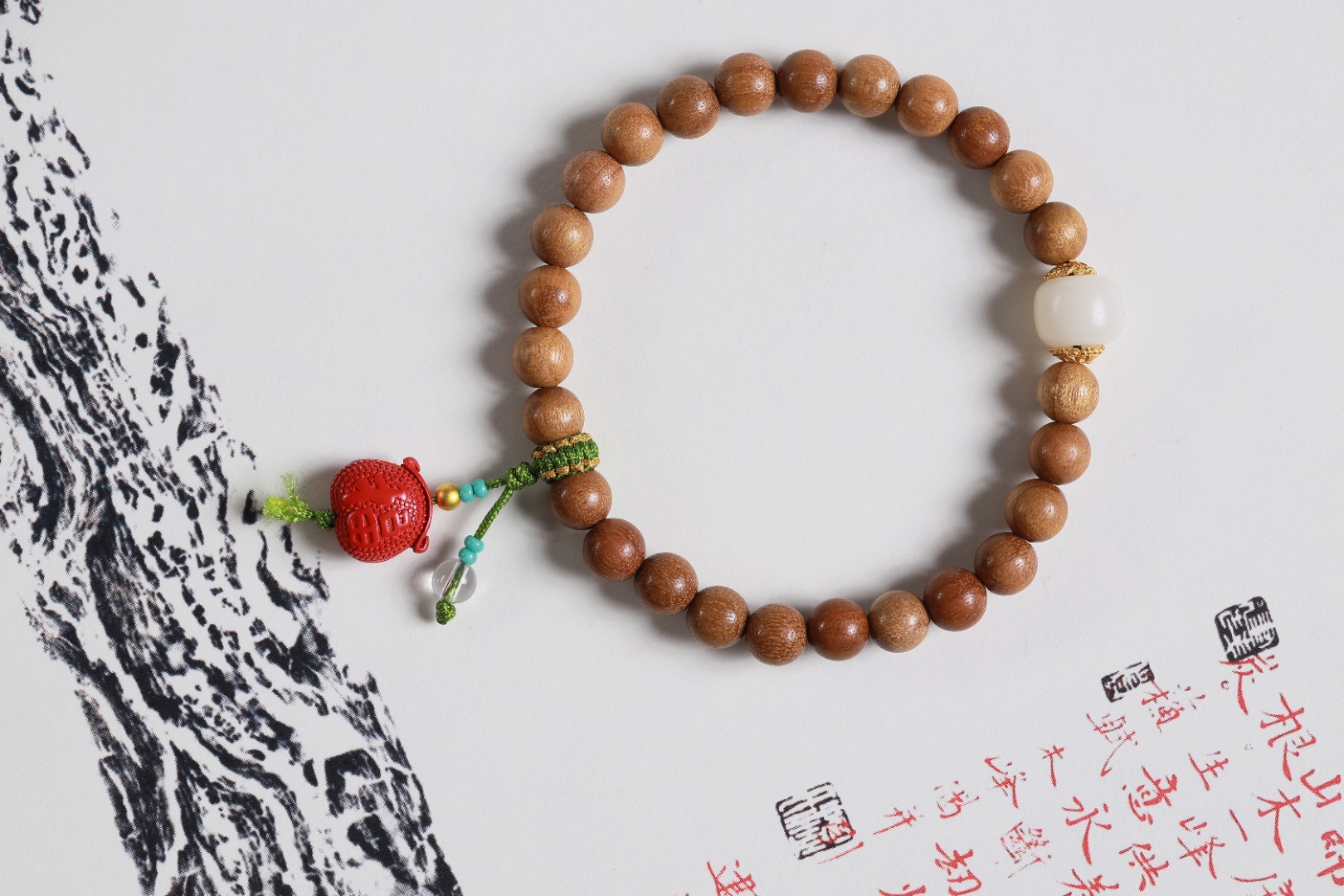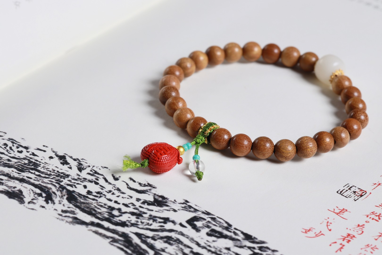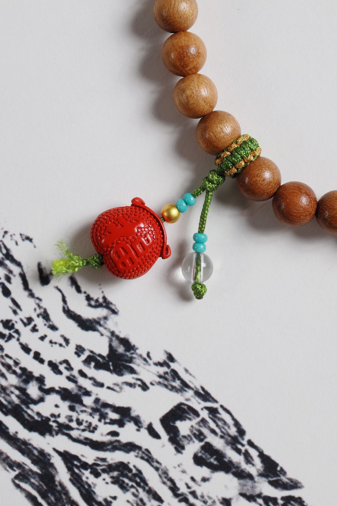 木头养人,金丝楠木配朱砂,淡淡的草药味不刺鼻,搭配朱砂双耳福袋,福袋本是装钱财的,有招财进宝 守财兴业 ,吉祥富足,代代有才寓意 ,福袋的口被绳子紧紧系住 ,有留住钱财 系住幸福之意,将朱砂放入福袋中有招财纳福,福气满满之意。