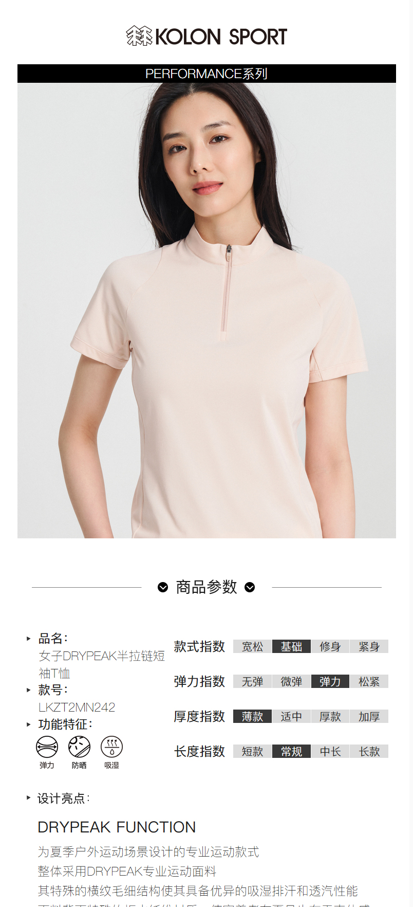 KOLONSPORT可隆户外休闲衣女款防晒UPF50+短袖吸湿打底衫弹力T恤LKZT2MN242