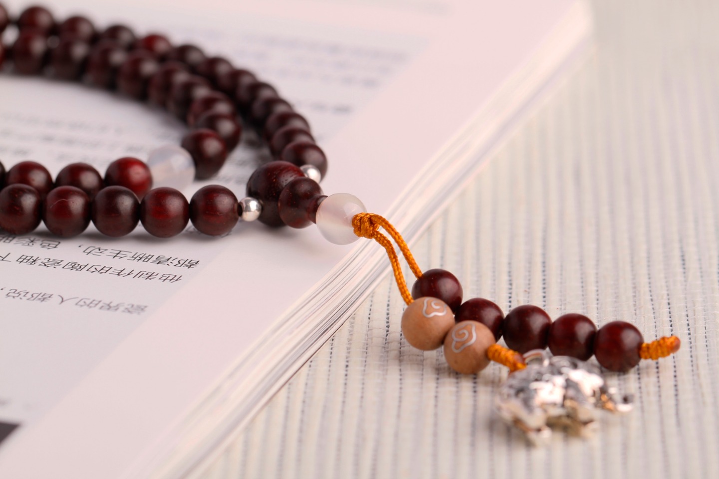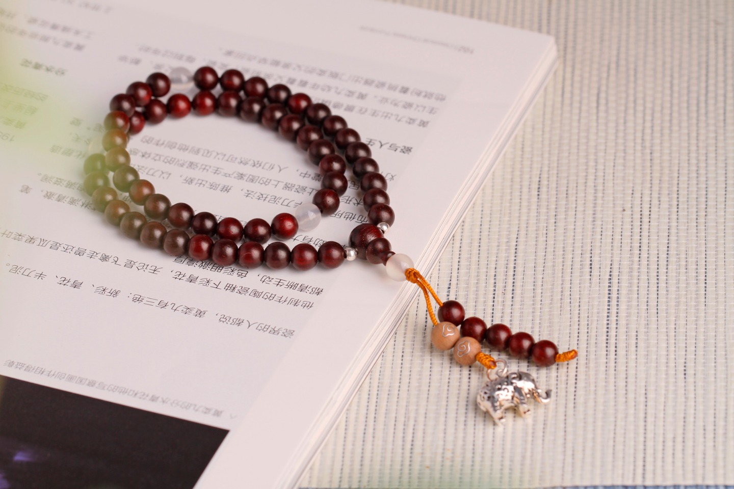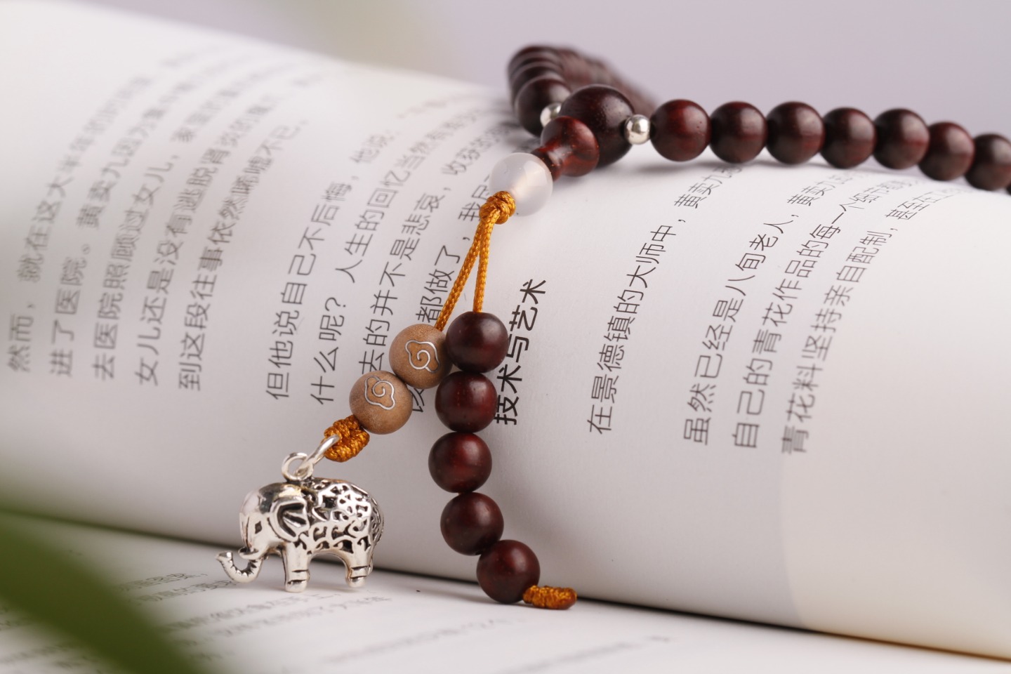搭配:小叶紫檀为主,搭配玛瑙,925银象,老山檀镶银点缀,奶香味醇厚迷人,有提神醒脑之功效,可驱散焦虑的情绪,有助于增加浪漫情调。