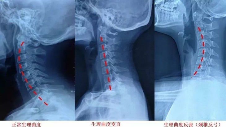 咱们的颈椎正常曲度呈S型。但长期低头,会出现颈椎变直或者反弓。