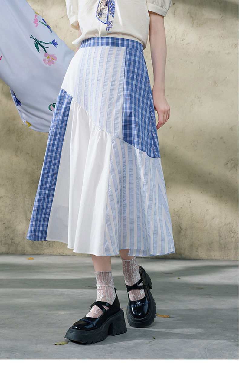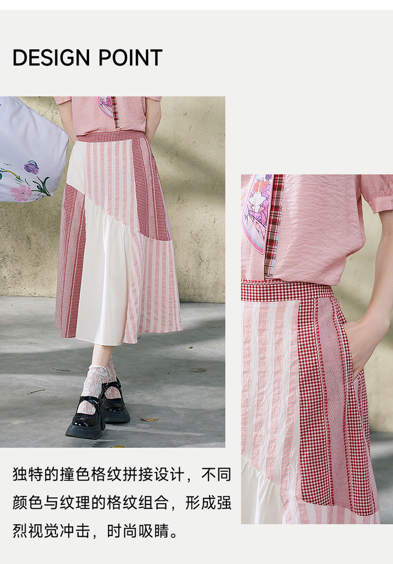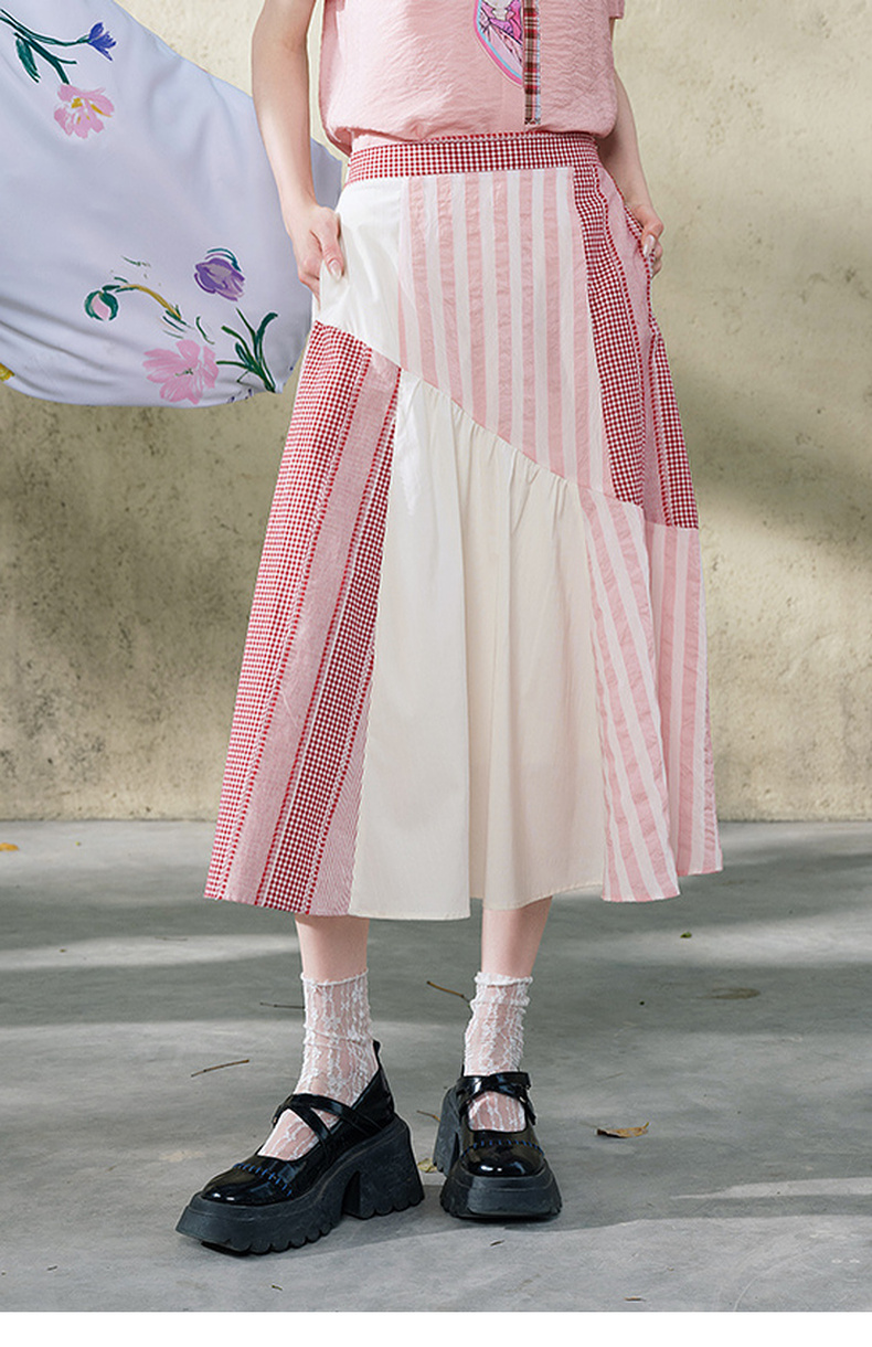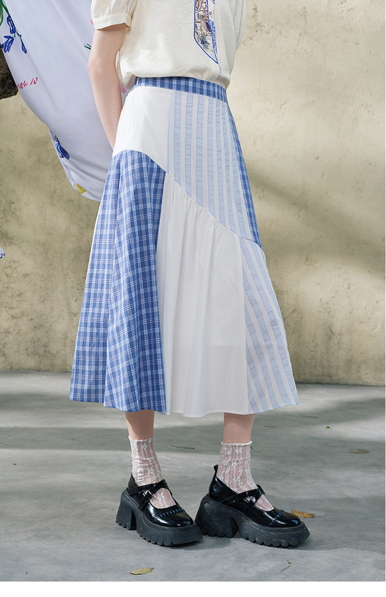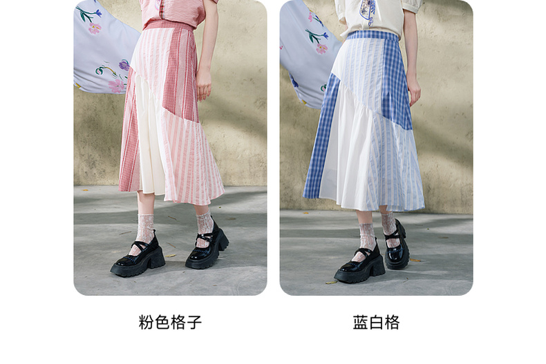 两三事 诗藤绮梦 2025夏季新款小清新格子条纹拼布a字半身裙长裙