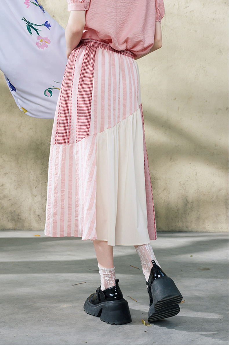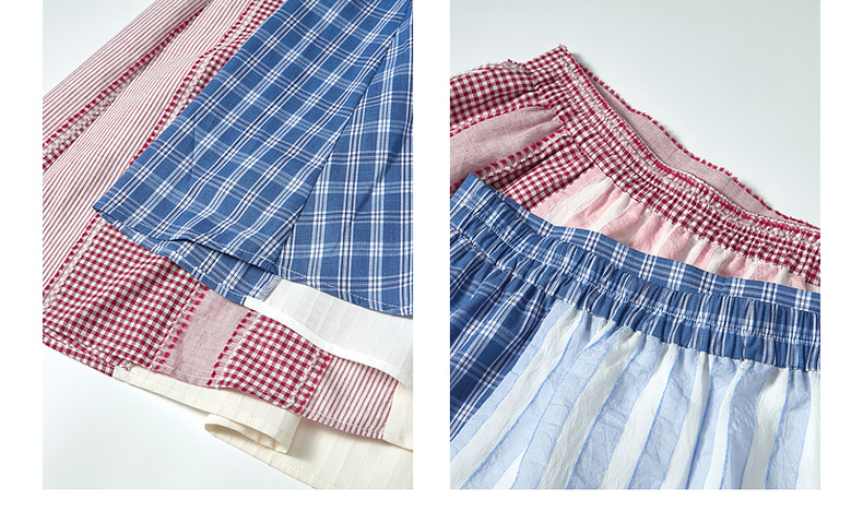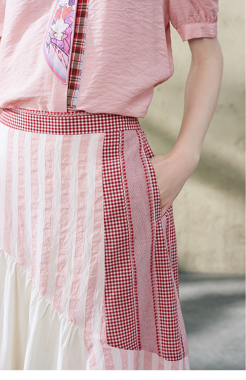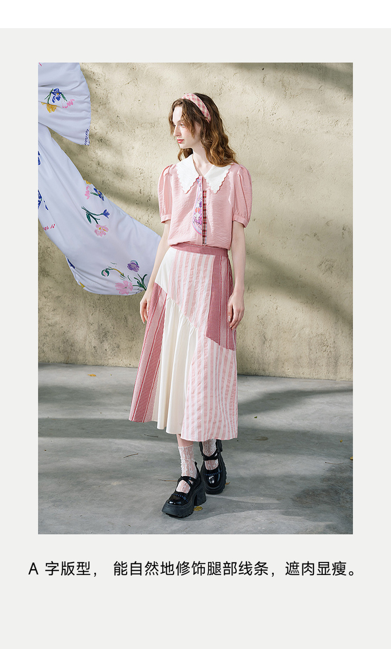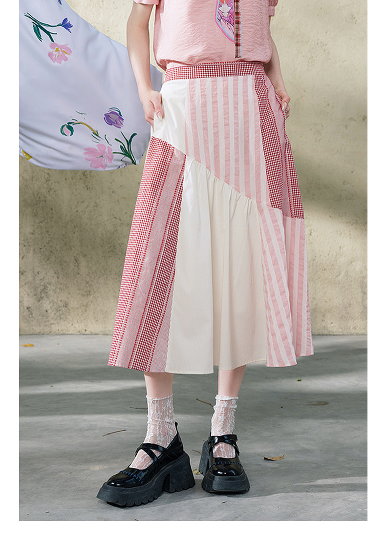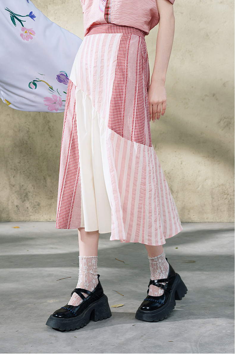 两三事 诗藤绮梦 2025夏季新款小清新格子条纹拼布a字半身裙长裙