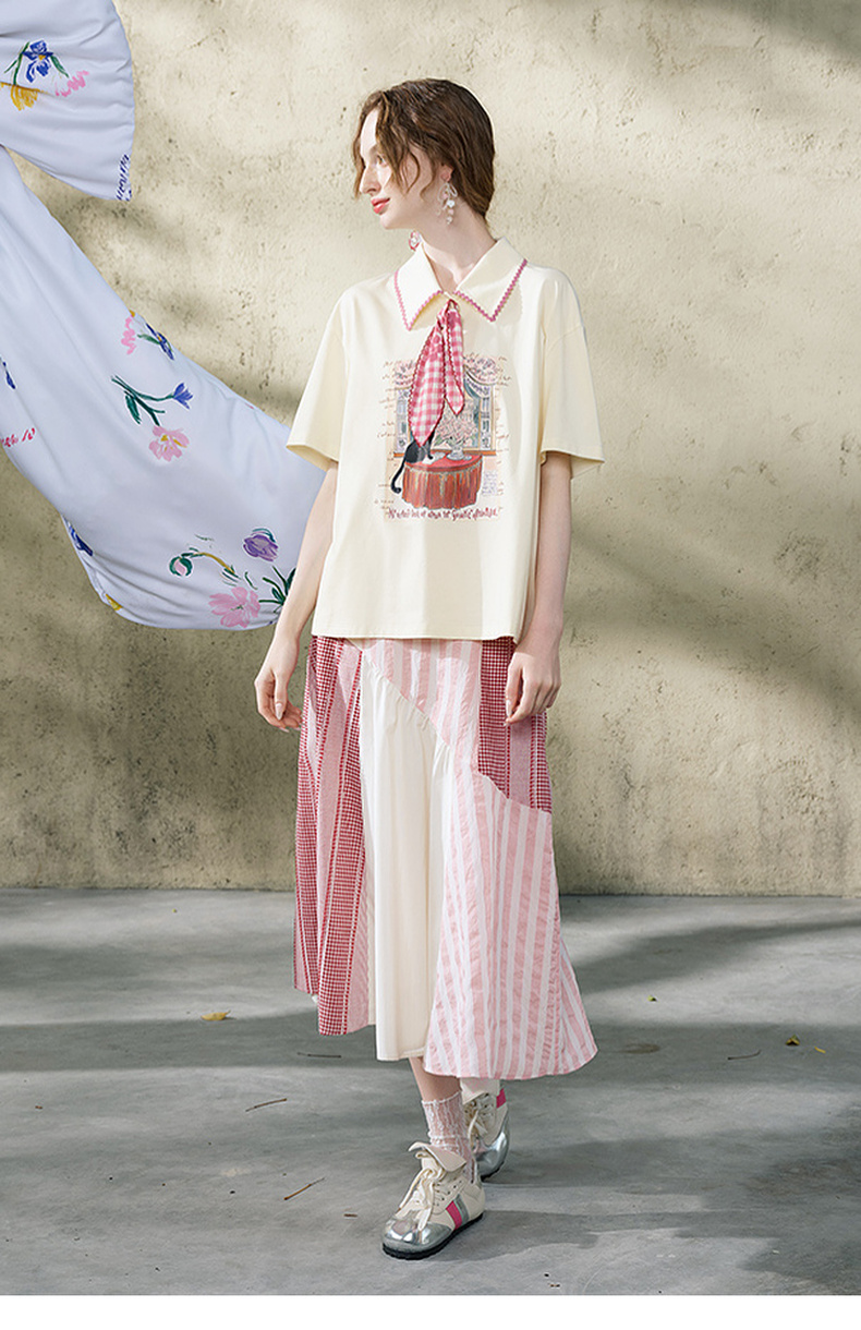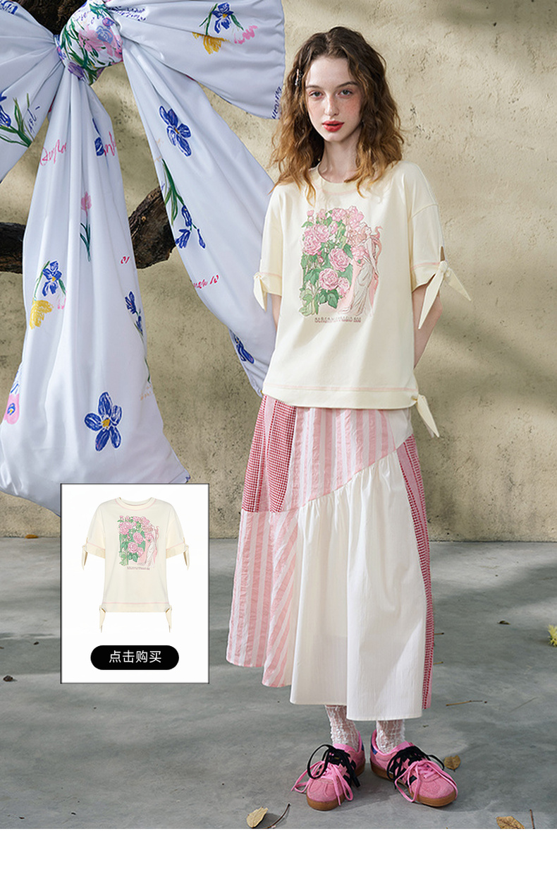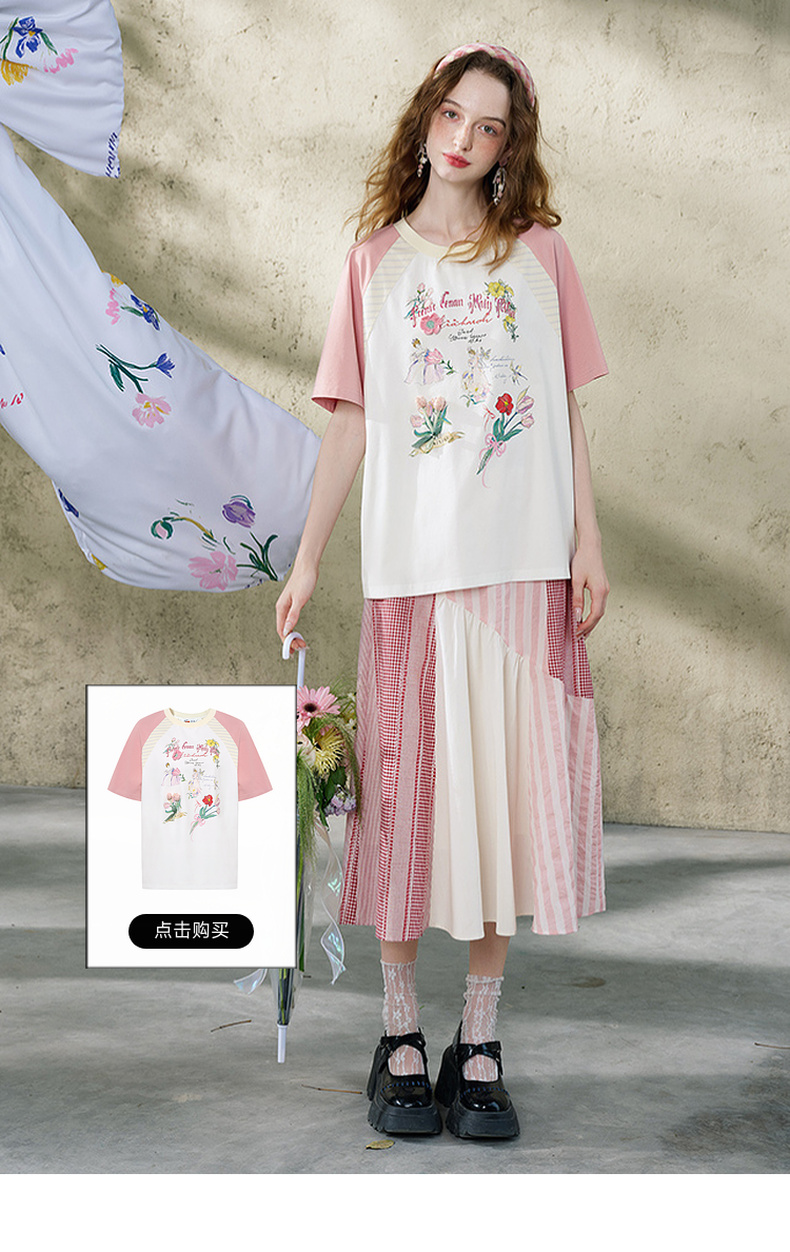 两三事 遁入花境 2025春季新款休闲拼色插肩袖印花刺绣t恤女宽松S25CT444