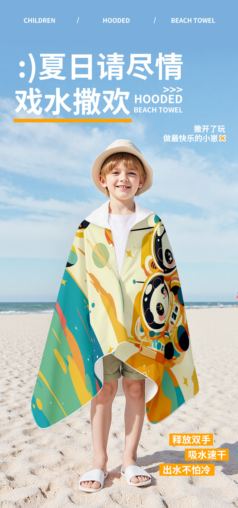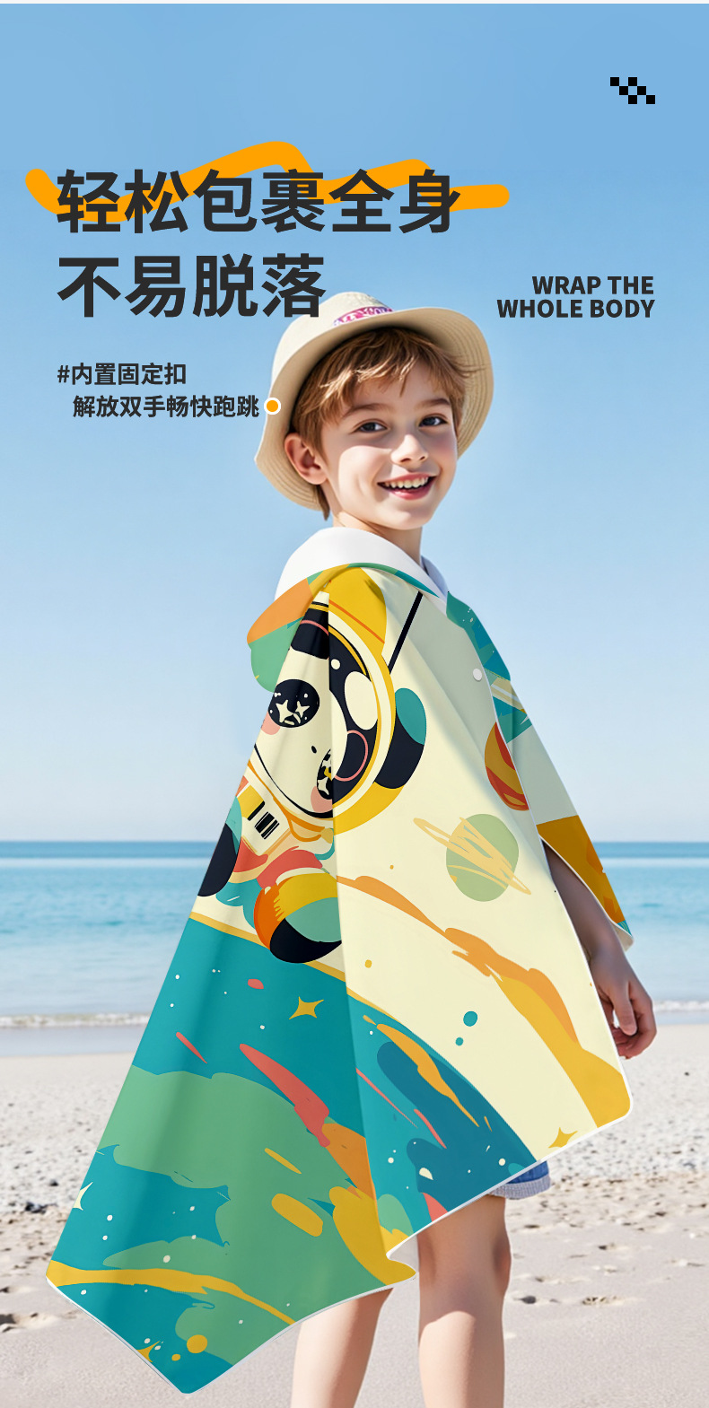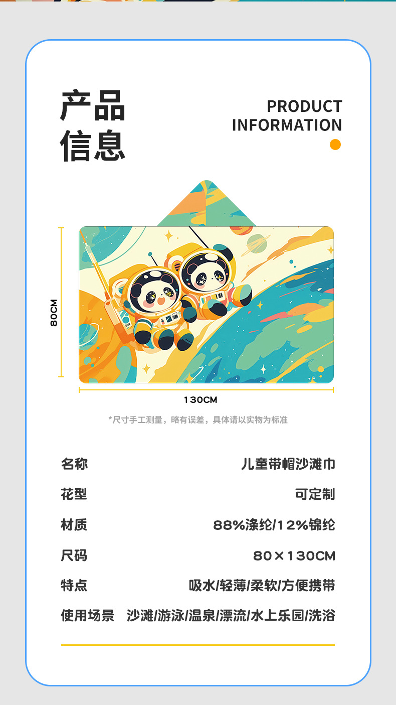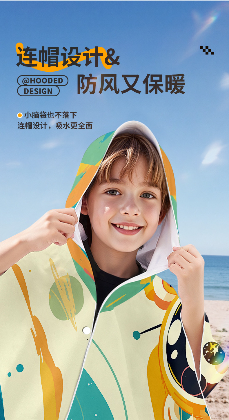 儿童速干浴巾男女学生游泳吸水巾斗篷沙滩海边连帽浴袍开衫按扣款沙滩巾