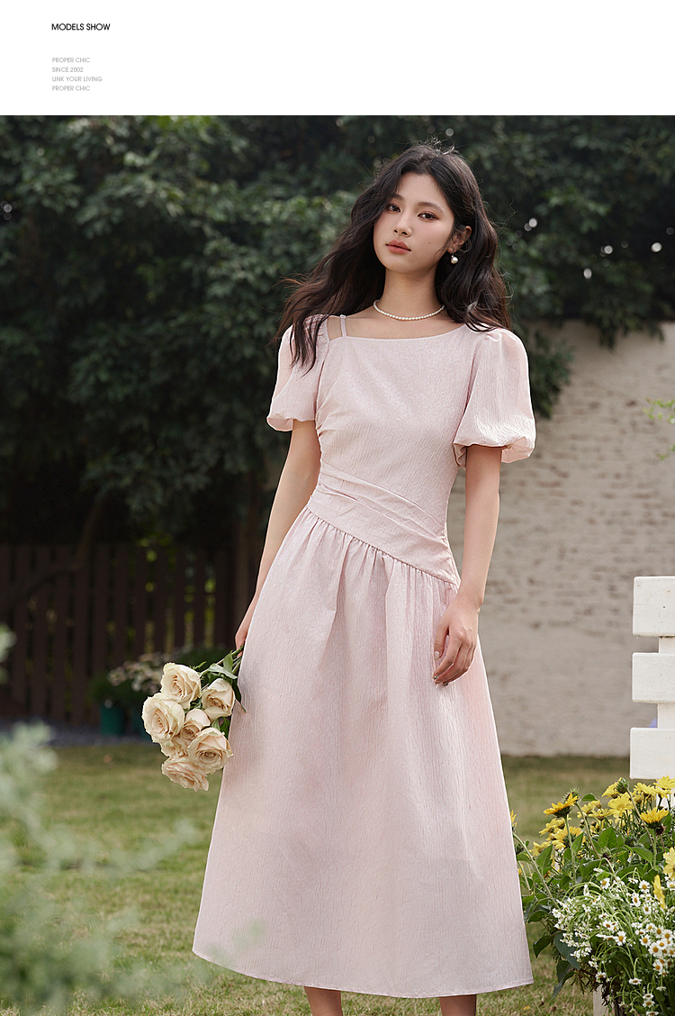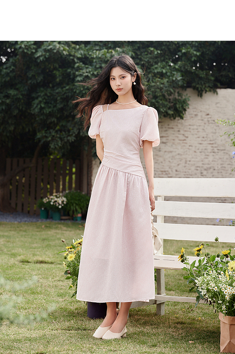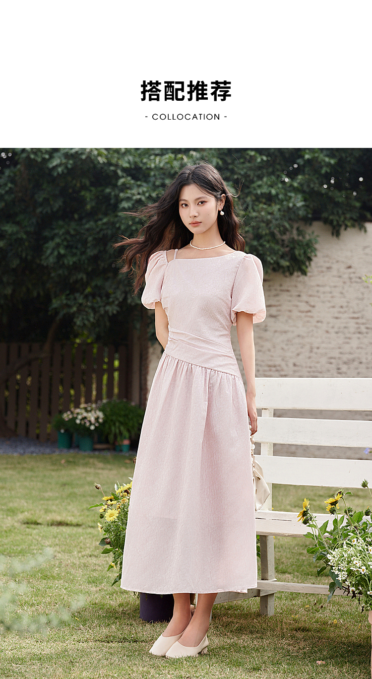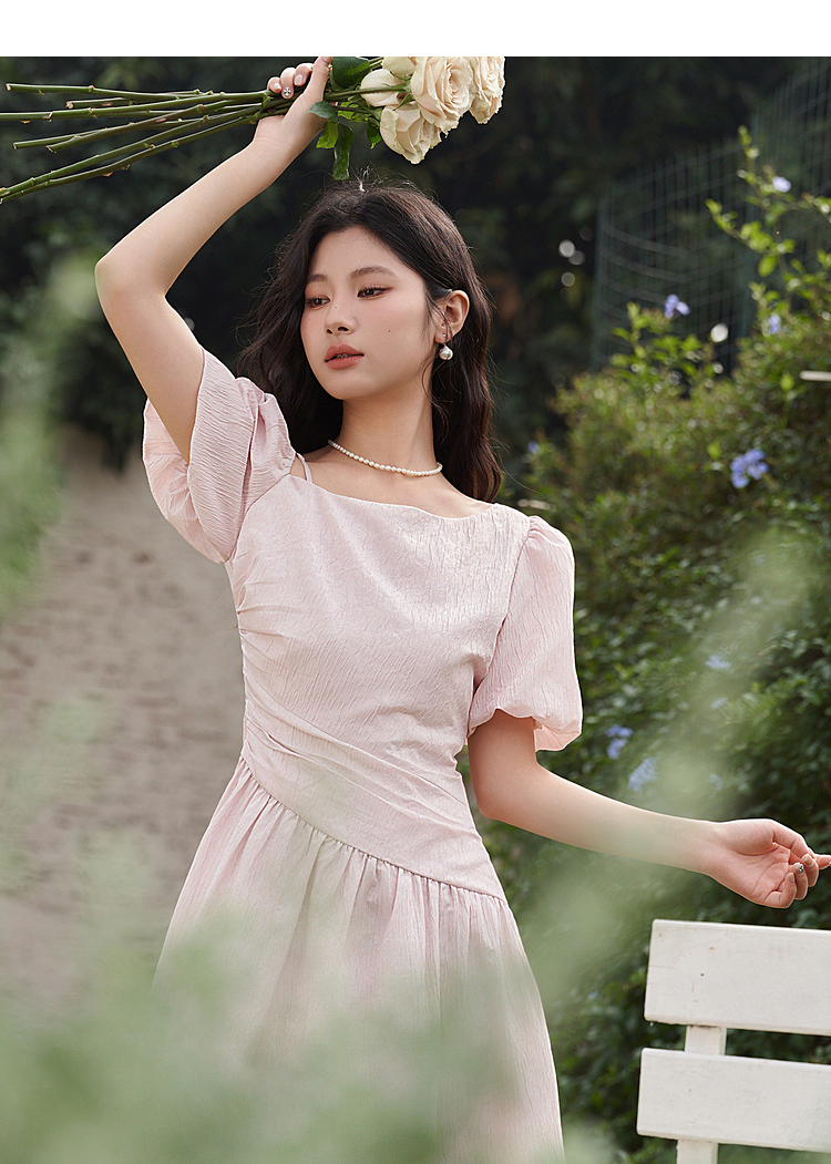 不规则领口两穿短袖连衣裙春季新款灯笼袖抽褶收腰A字裙V0540395