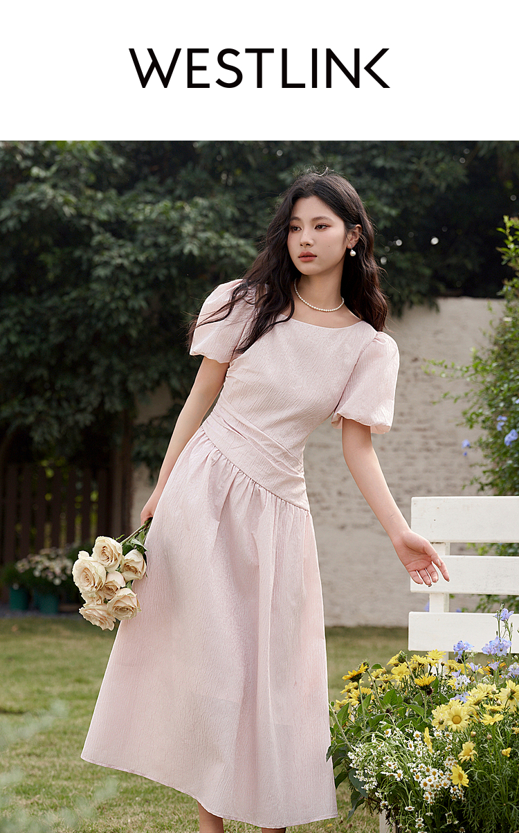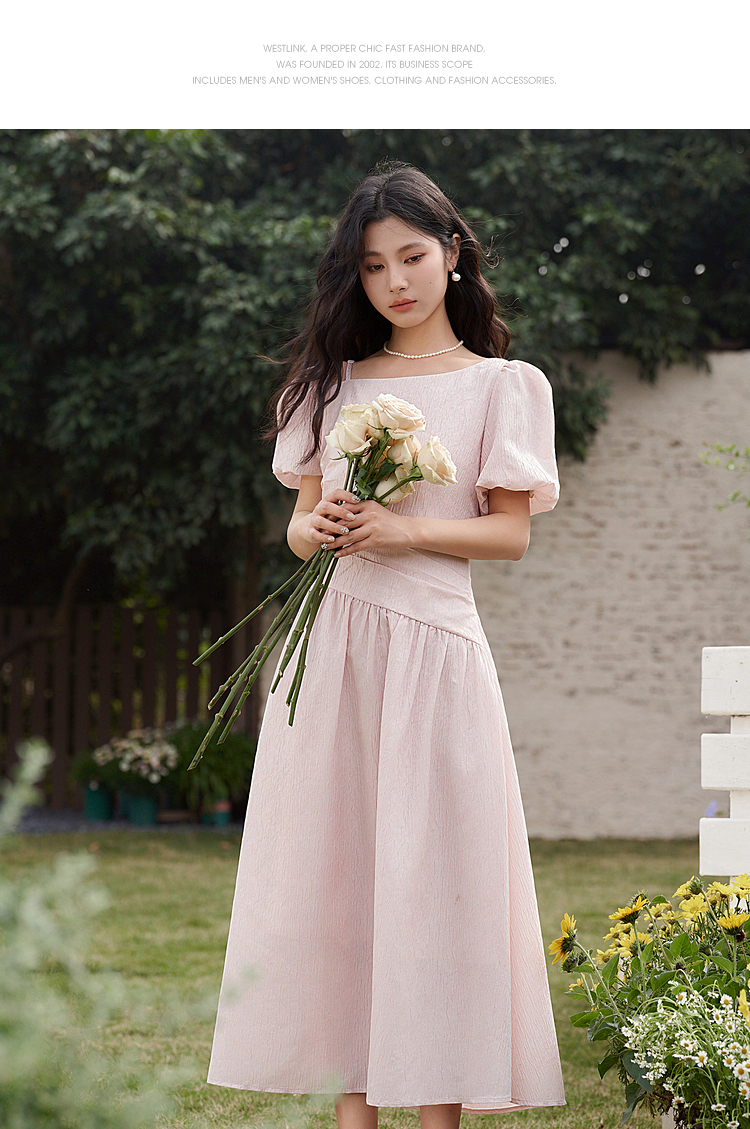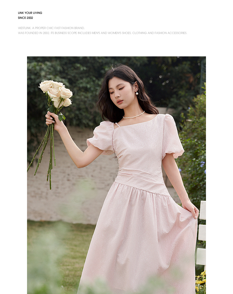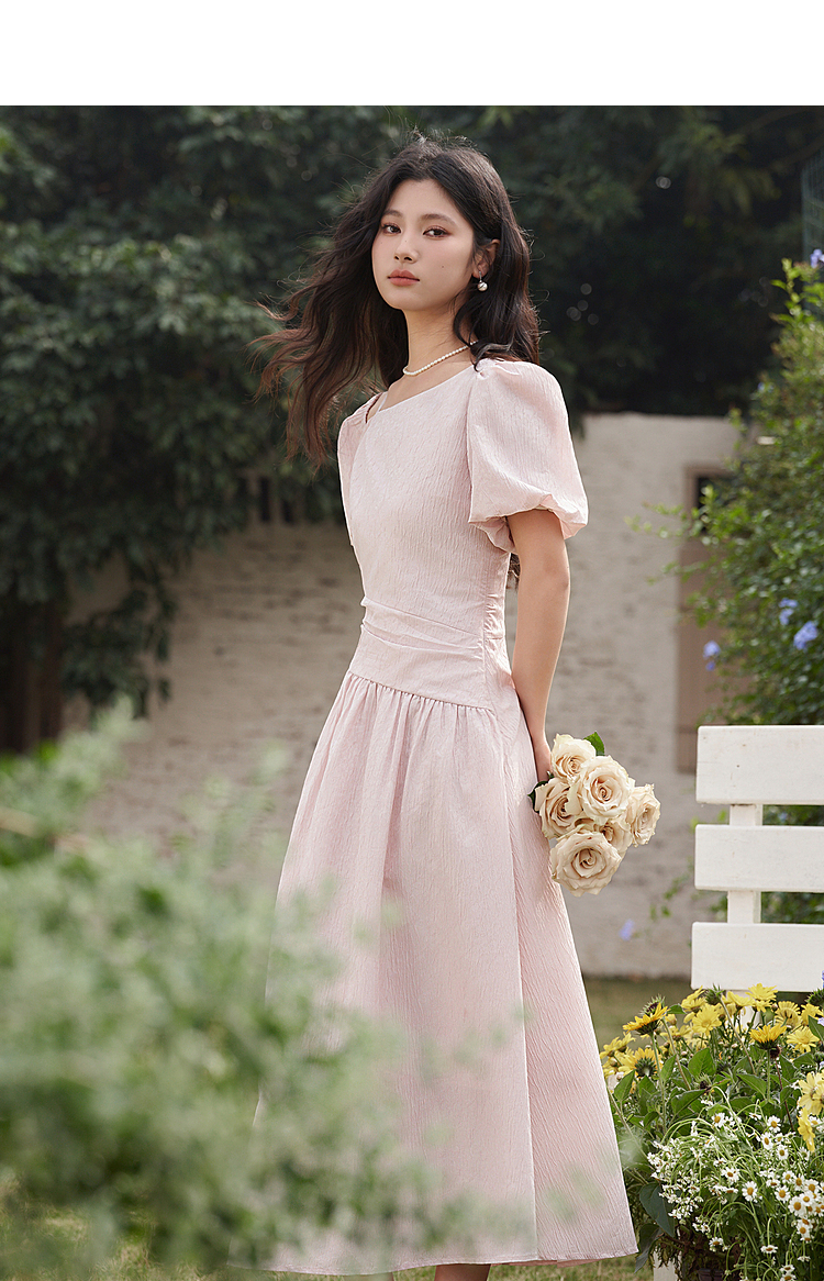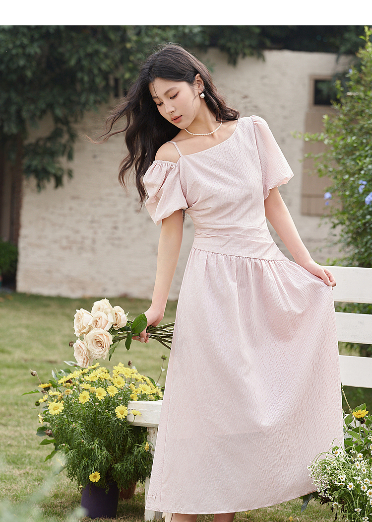 不规则领口两穿短袖连衣裙春季新款灯笼袖抽褶收腰A字裙V0540395