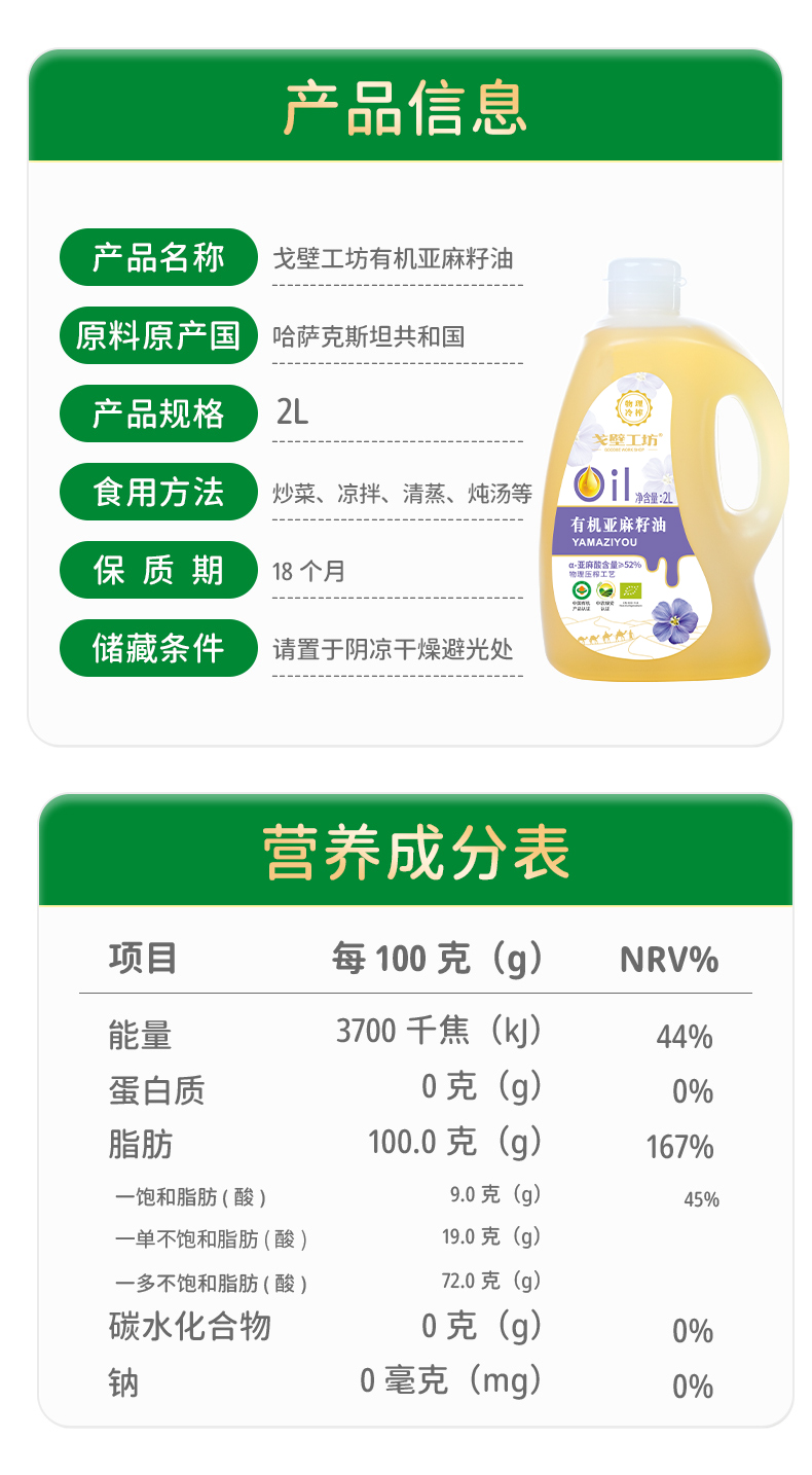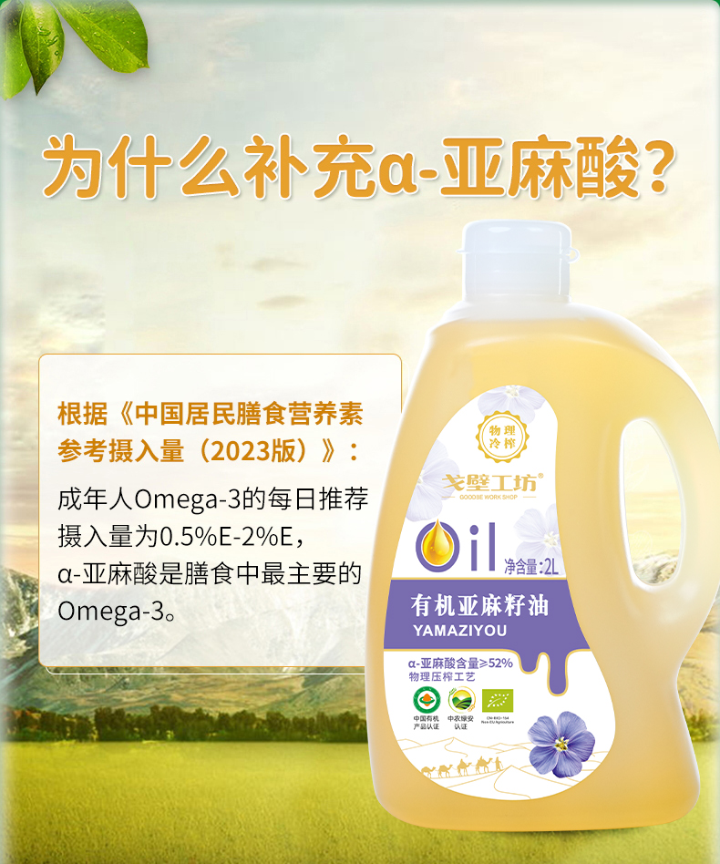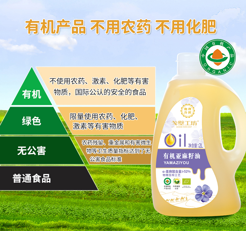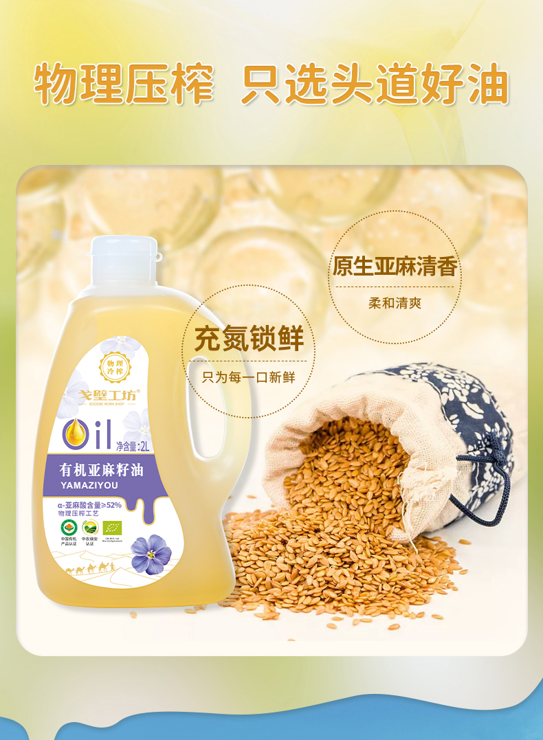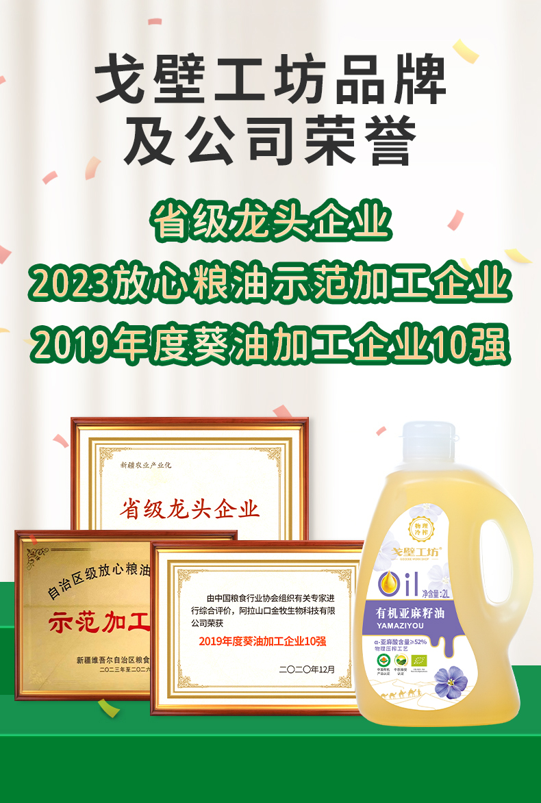 【自营】戈壁工坊有机亚麻籽油企标一级2L