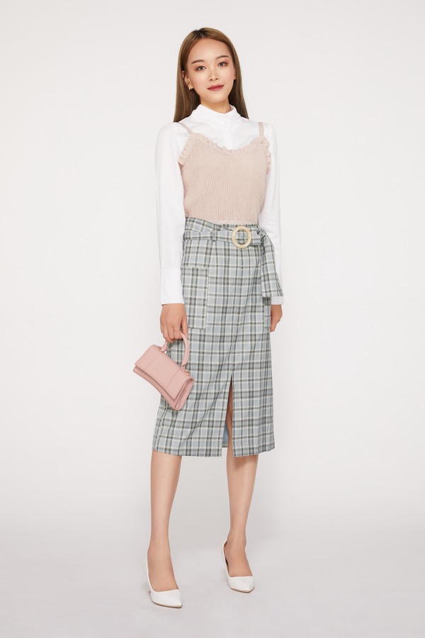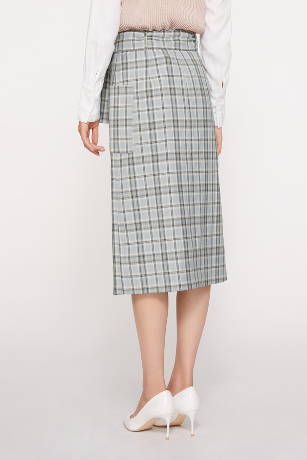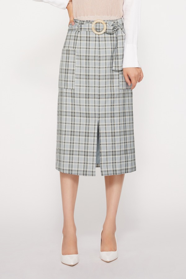 FANSILANEN 蓝色格子腰带直筒半裙 9449