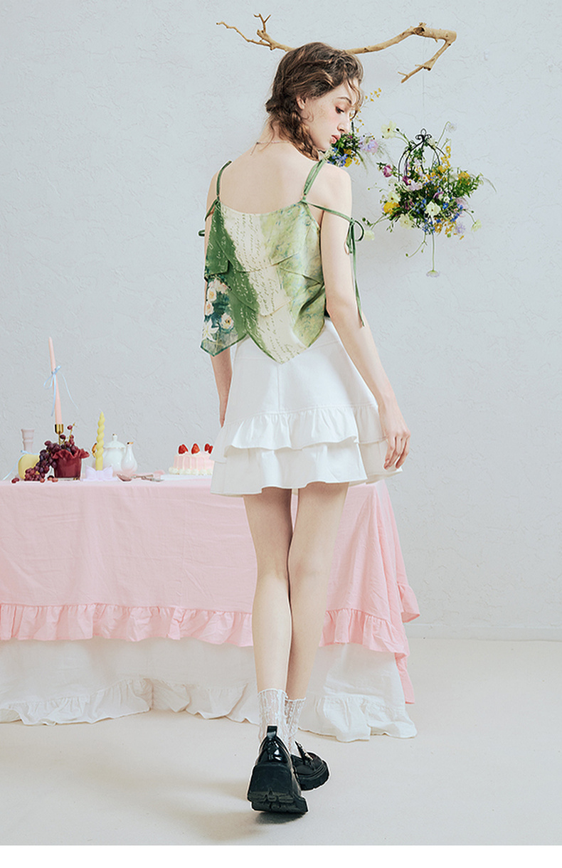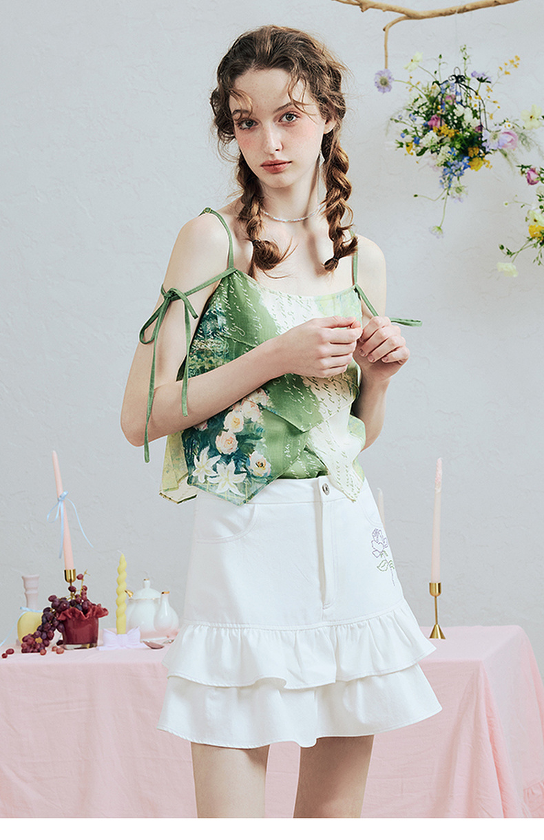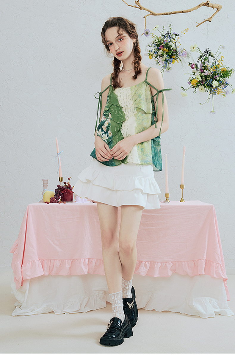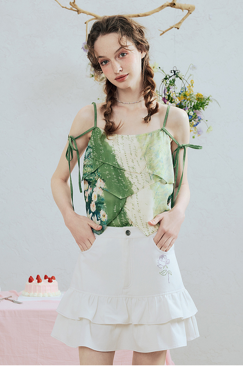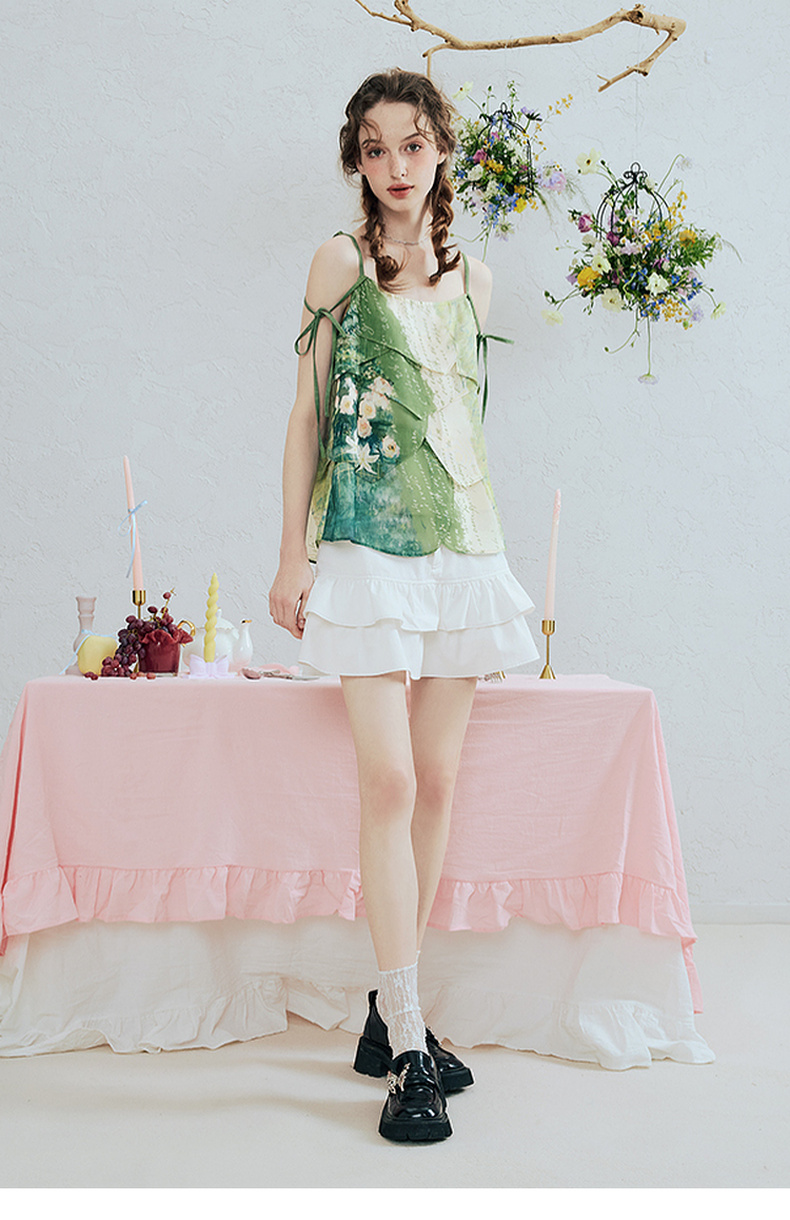 两三事 森灵绮梦 2025夏季新款小清新印花拼色绑带吊带裙连衣裙